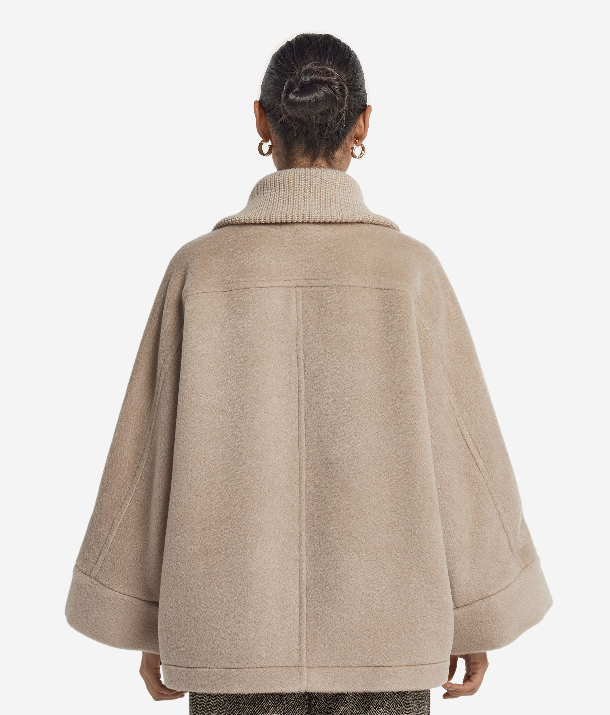 Stilul și eleganța găsesc echilibrul perfect în acest mantou din cașmir moale. Gulerul foarte înalt, înnobilat cu o lucrătură reiată, adaugă un detaliu sofisticat și primitor. Umerii tip raglan cu mânecă largă conferă fluiditate mișcării, iar buzunarele, discrete și funcționale, se integrează armonios în designul articolului. Fermoarul metalic desăvârșește croiala lejeră, iar lungimea până la șold recomandă articolul pentru ținute dezinvolte și sofisticate.