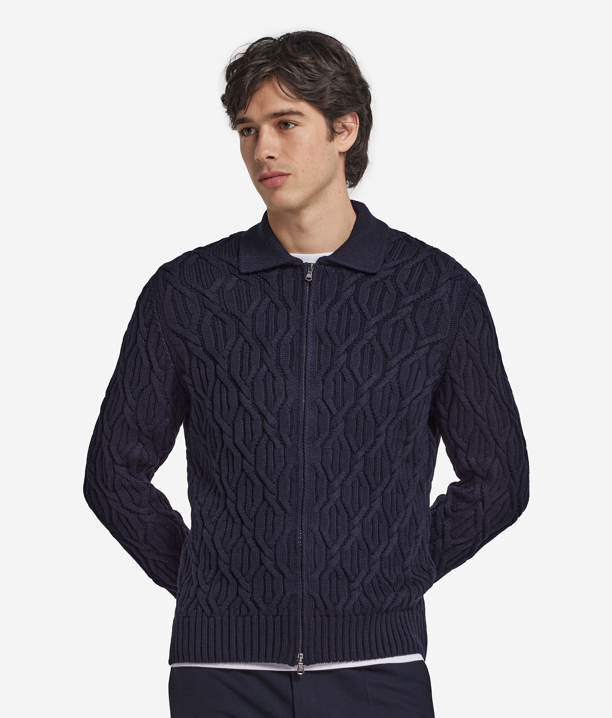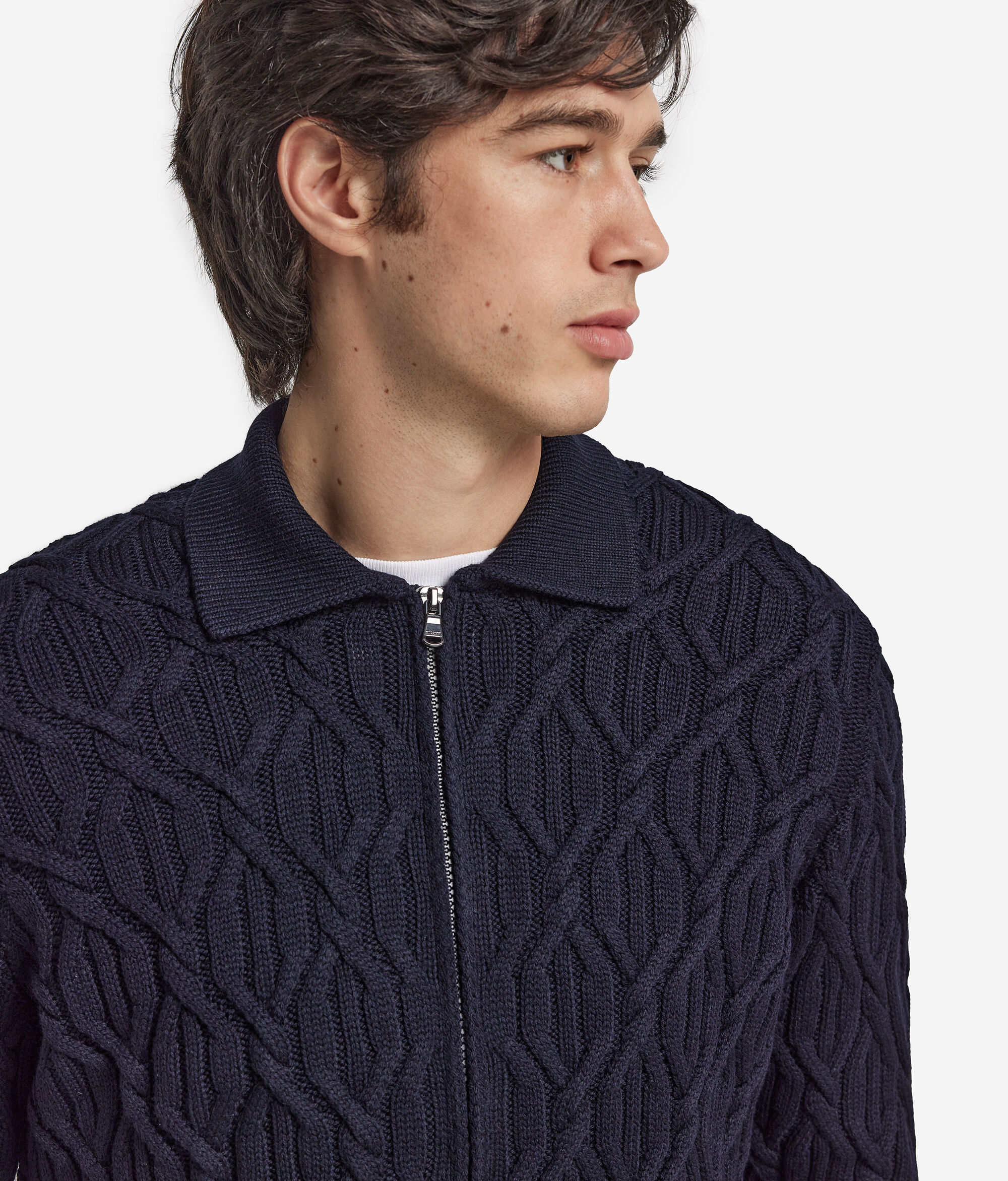 Eleganța concretă și spiritul contemporan se contopesc în acest cardigan din tricot de lână, înnobilat cu o lucrătură împletită cu un impact vizual puternic. Gulerul cu nervuri și închiderea cu fermoar frontal adaugă o notă modernă și funcțională, iar croiala lejeră asigură versatilitate, recomandându-l ca soluție ideală pentru ținutele relaxate, dar pretențioase.