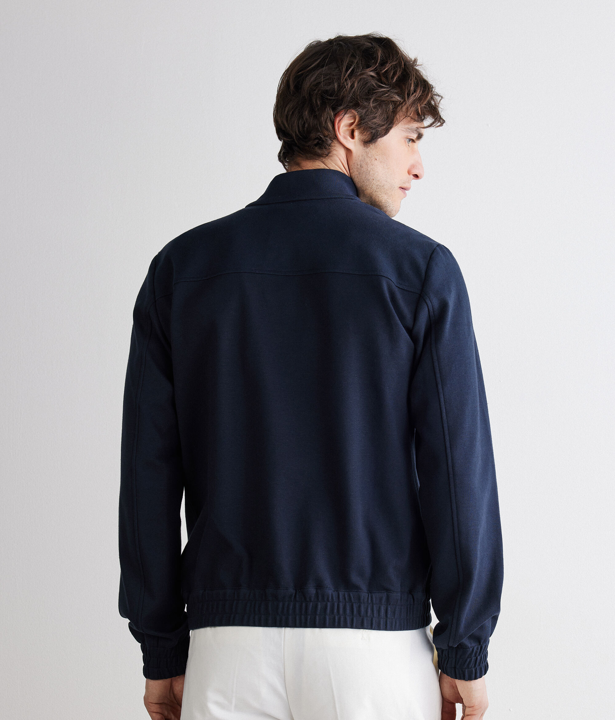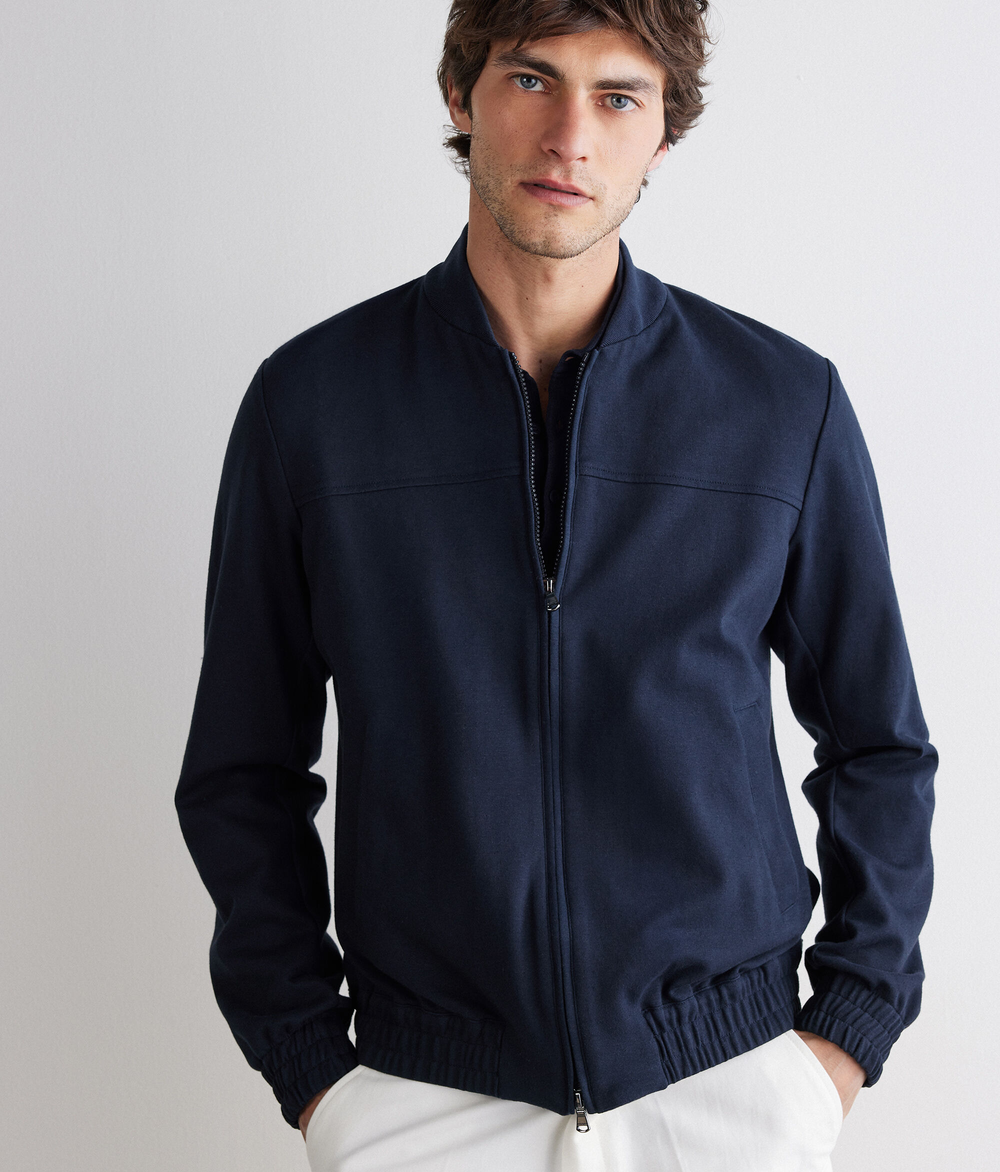Jachetă bomber din jerse de bumbac și in, cu guler reiat, cu design urban și fermoar central cu două cursoare. Croiala carré în față și în spate conferă structură articolului, în timp ce buzunarele laterale combină funcționalitatea și stilul. Mânecile preformate cu decupaj la spate cu manșete și tiv elastic completează un design echilibrat și dinamic.
