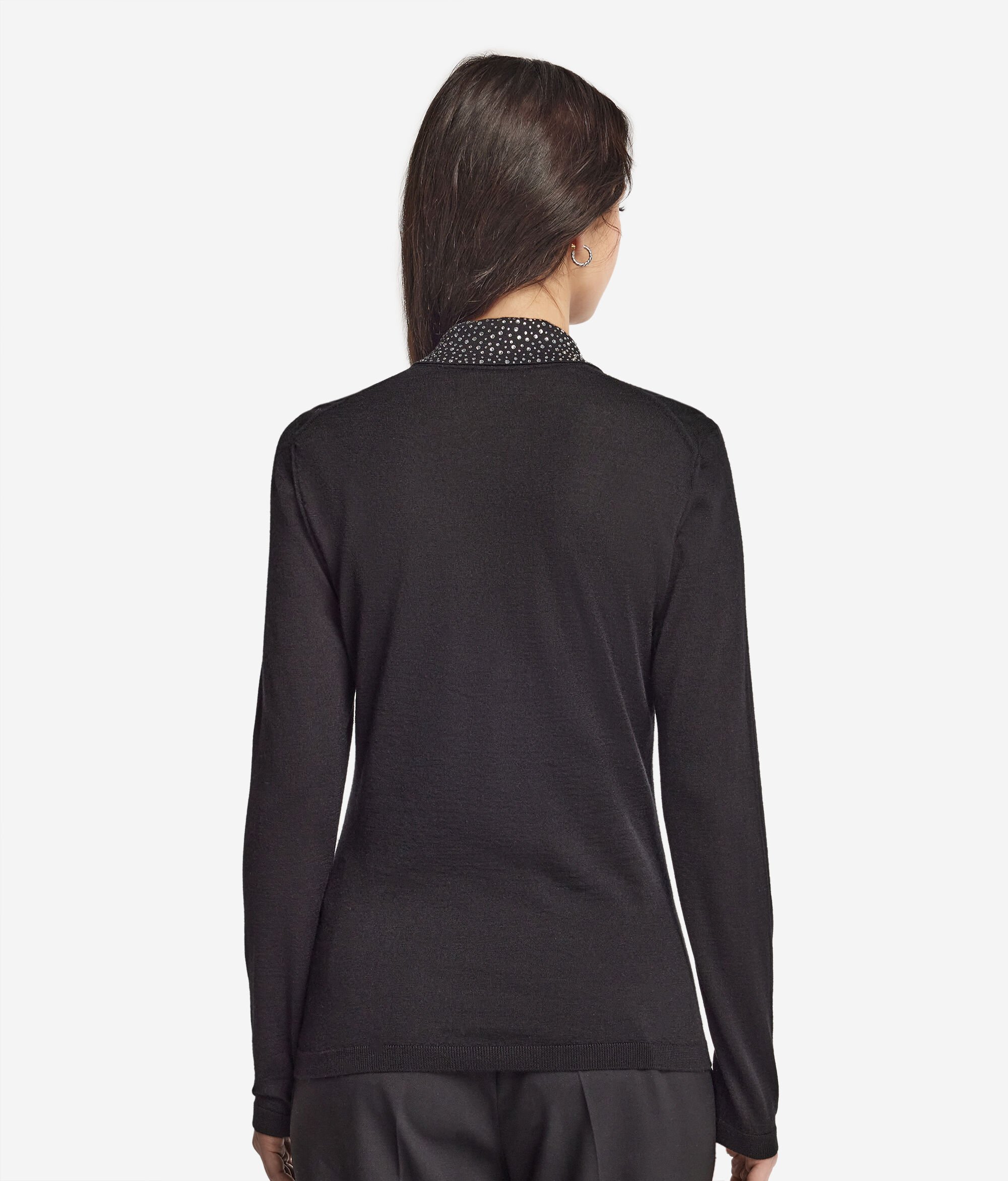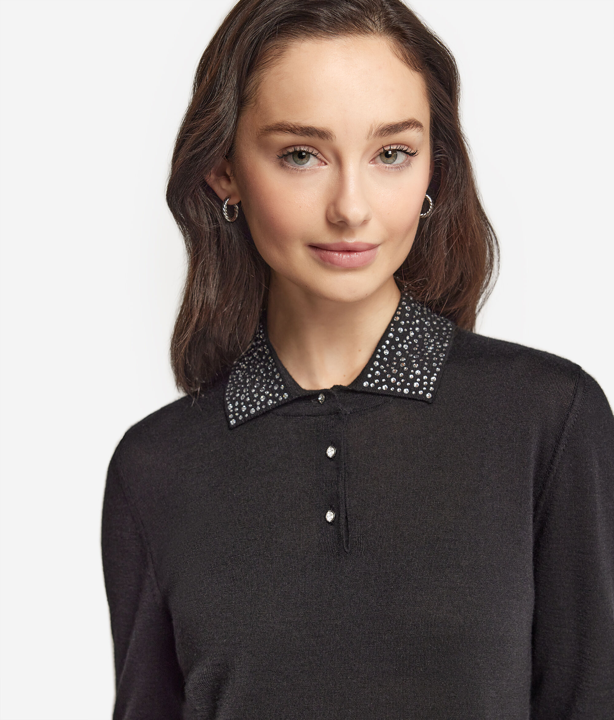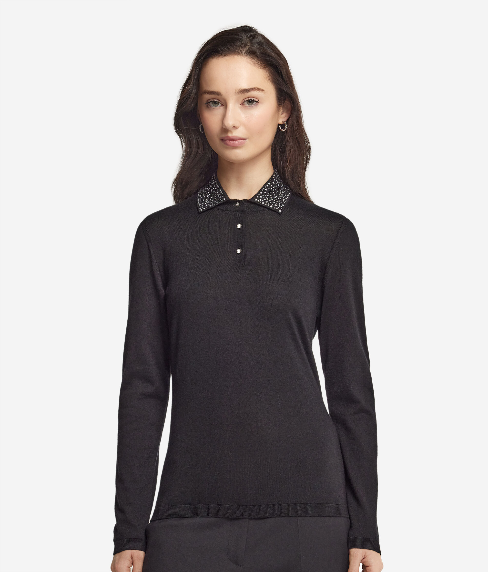 Caracterizat prin stil și eleganță, acest polo cu mânecă lungă din cașmir ultrafin este un articol de îmbrăcăminte care combină rafinamentul și modernitatea. Gulerul tricotat este împodobit cu o aplicație elegantă de strasuri luminoase care adaugă rafinament articolului, în timp ce închiderea este personalizată de nasturi bijuterie prețioși la vedere. • Finisajul reiat de pe manșete și tiv garantează o potrivire perfectă, accentuând eleganța mereu actuală a articolului.