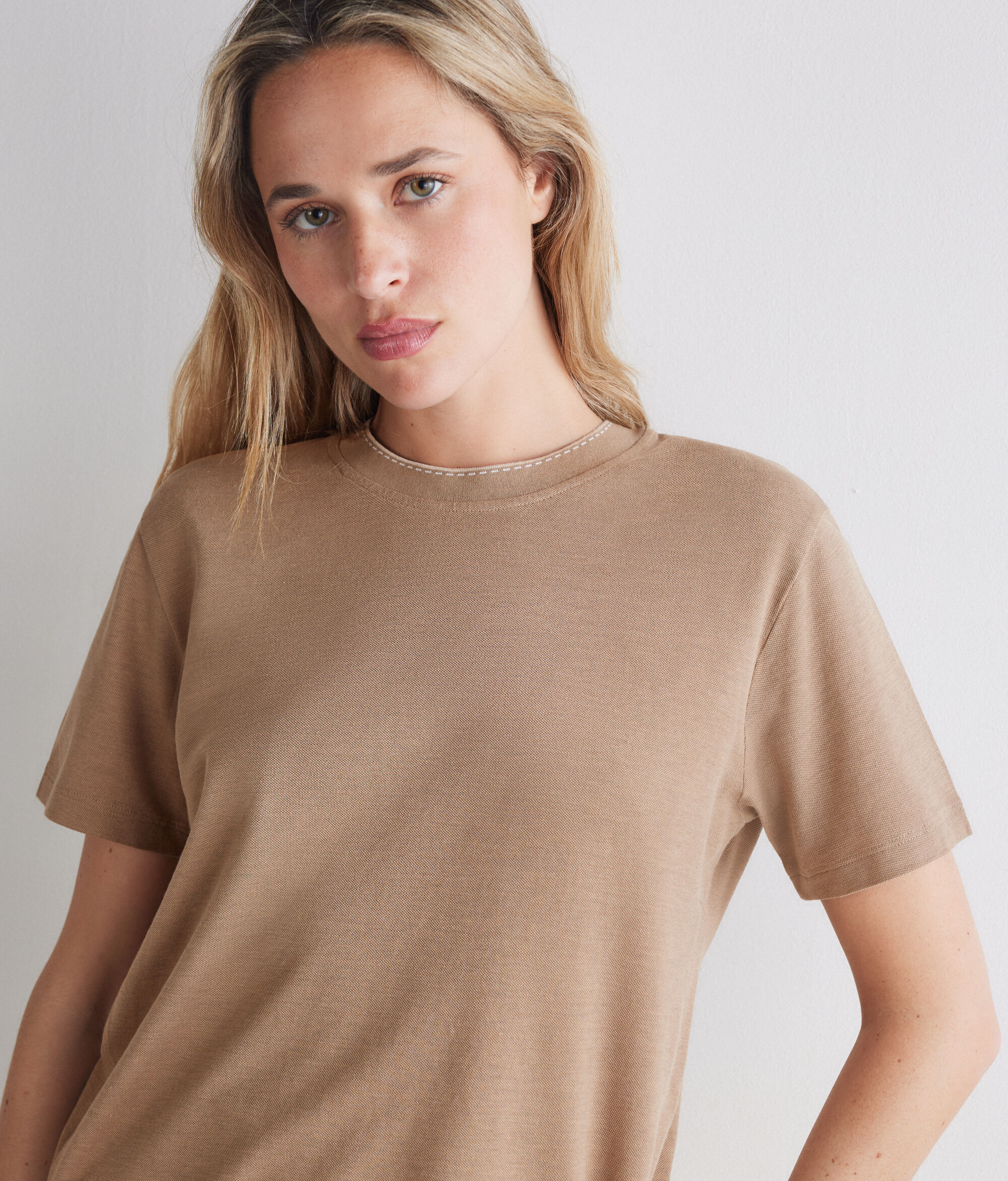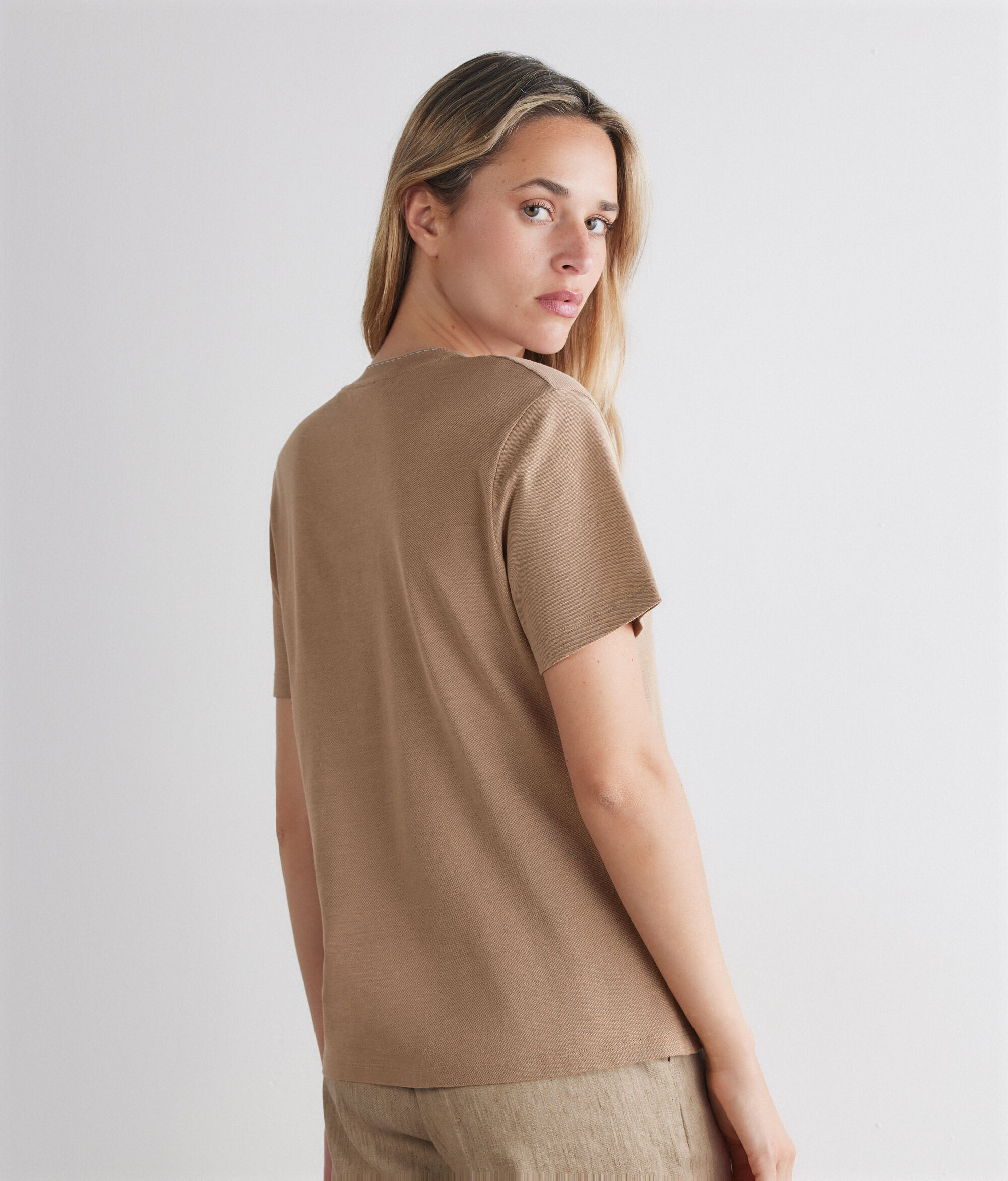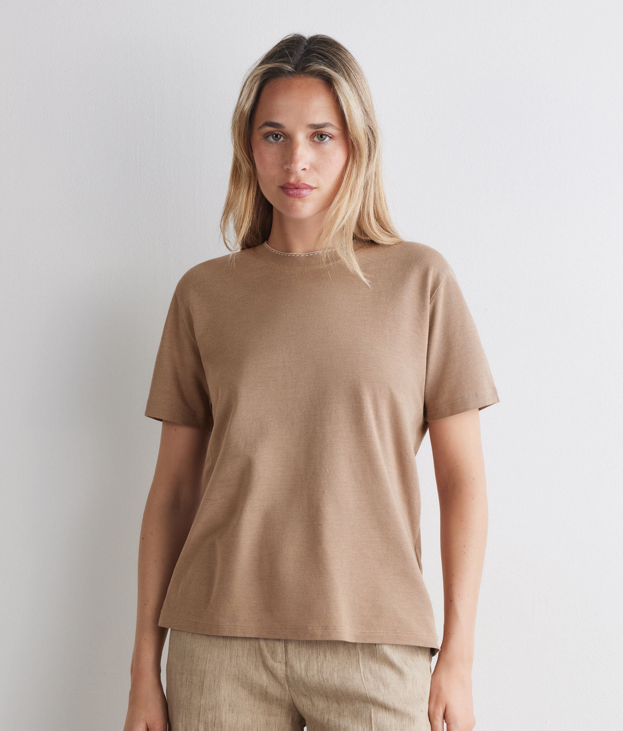 Tricou din piquet de bumbac și mătase (83% bumbac, 17% mătase), cu motiv contrastant delicat pe gulerul rotund, care pune în valoare estetica minimalistă a articolului.