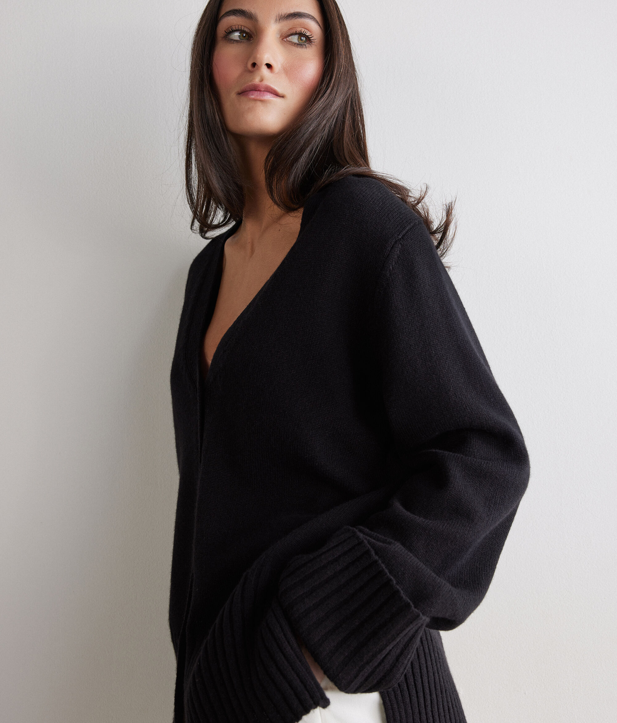 Luxurious Ultrasoft cashmere has been elegantly crafted into a soft V-neck cardigan with character. The front fastening with three tone-on-tone buttons adds a touch of elegance and sobriety, while the slits at the hem give the design fluidity and movement. Ribbing on the edge and reversed cuffs enriches the garment and gives it a refined and tidy appearance.