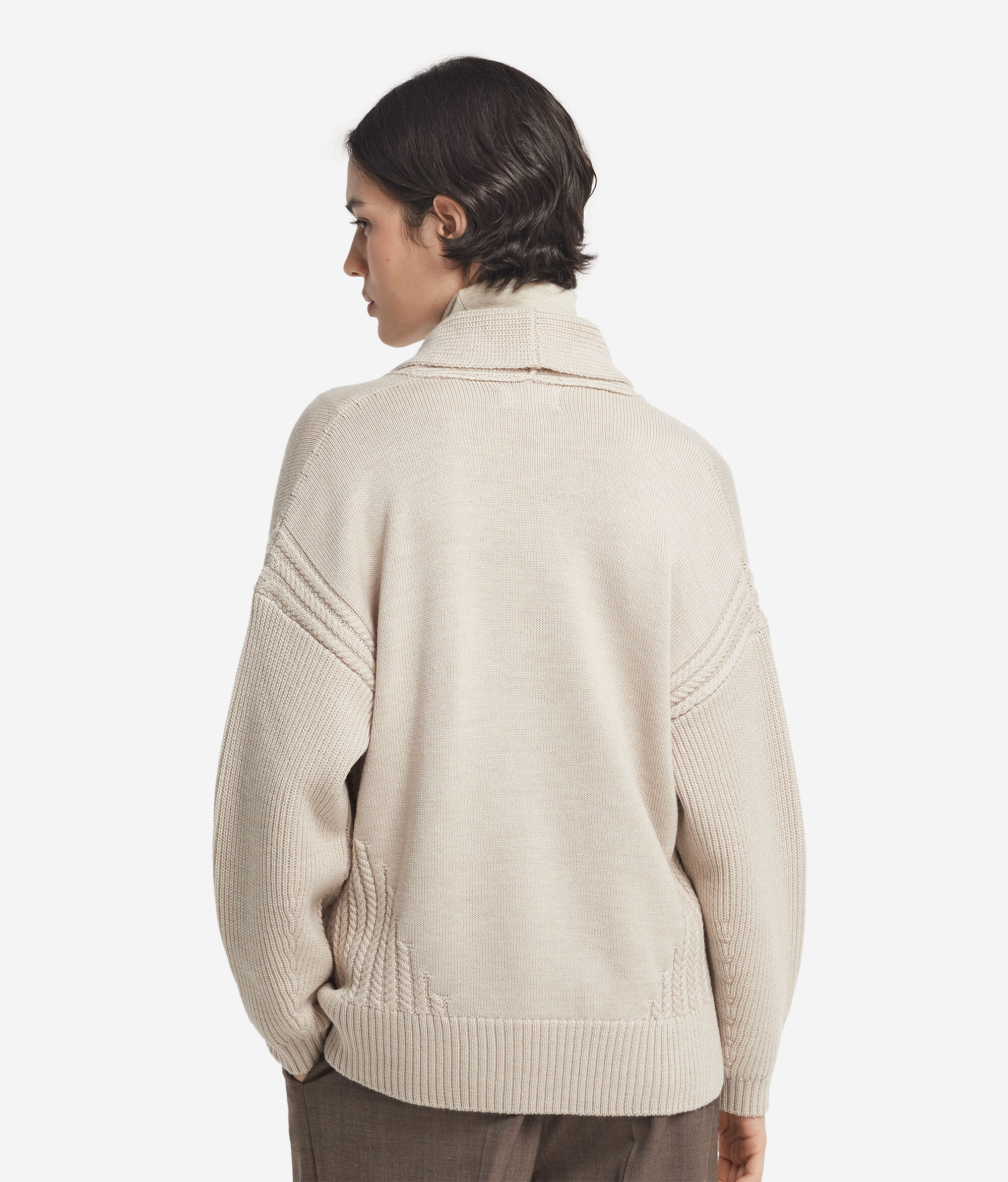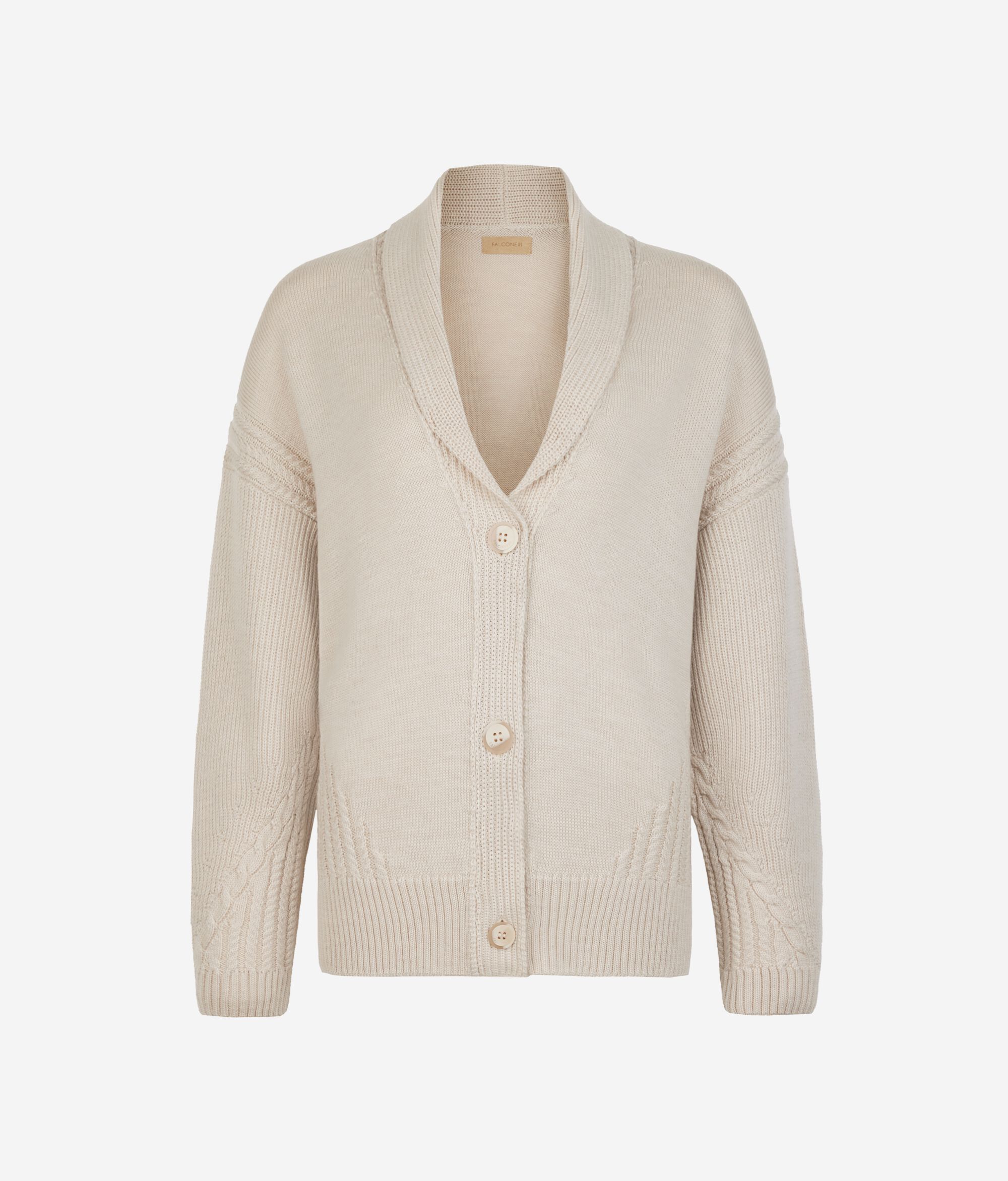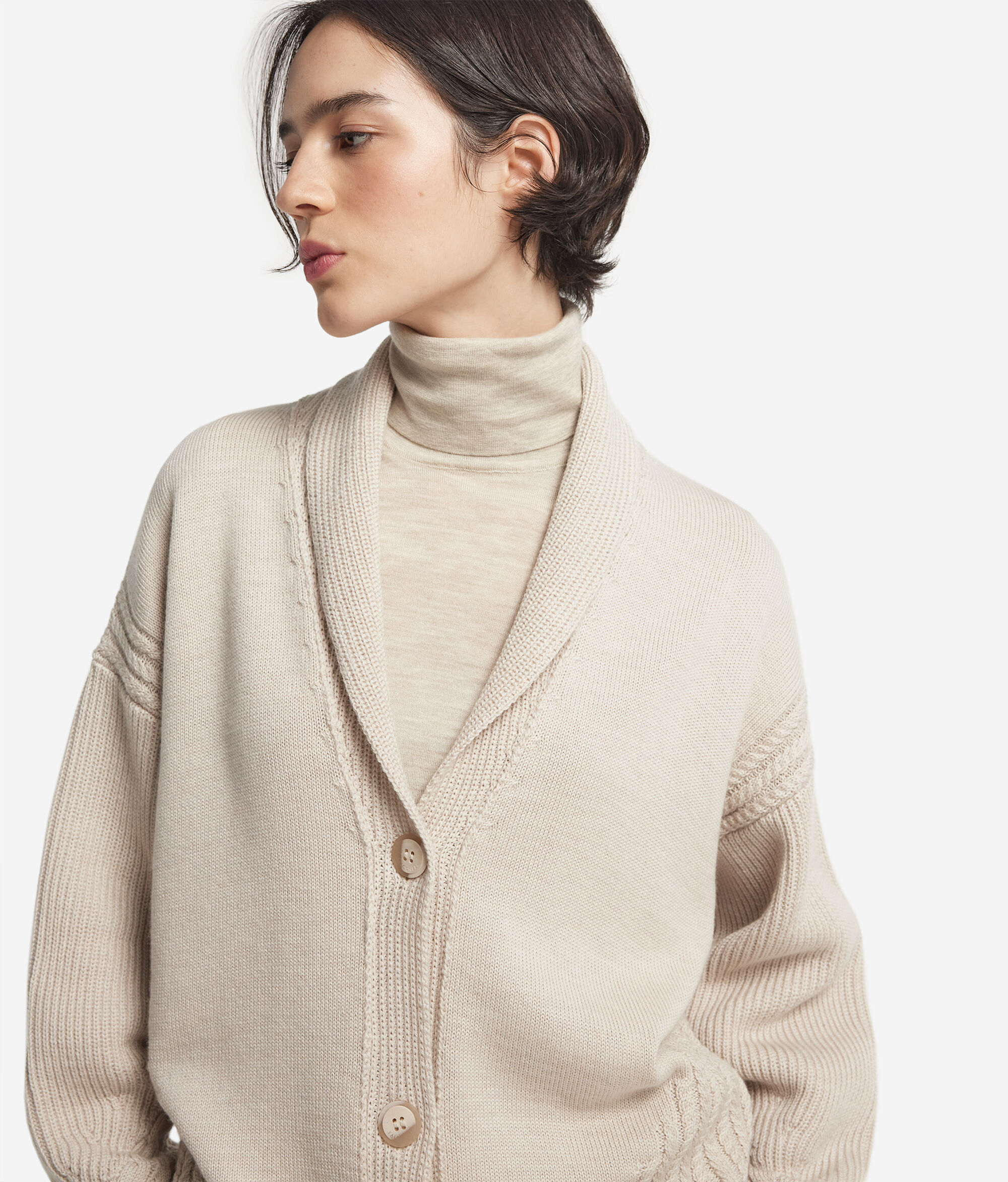 The turned-down neckline and button fastening give it an elegant allure, while the dropped shoulders and relaxed fit convey a modern, unrestricted style. The ribbed knit on the sleeves and the cable knit on the sides transform every detail into a true masterpiece of craftsmanship, enhanced by ribbed cuffs and hem.