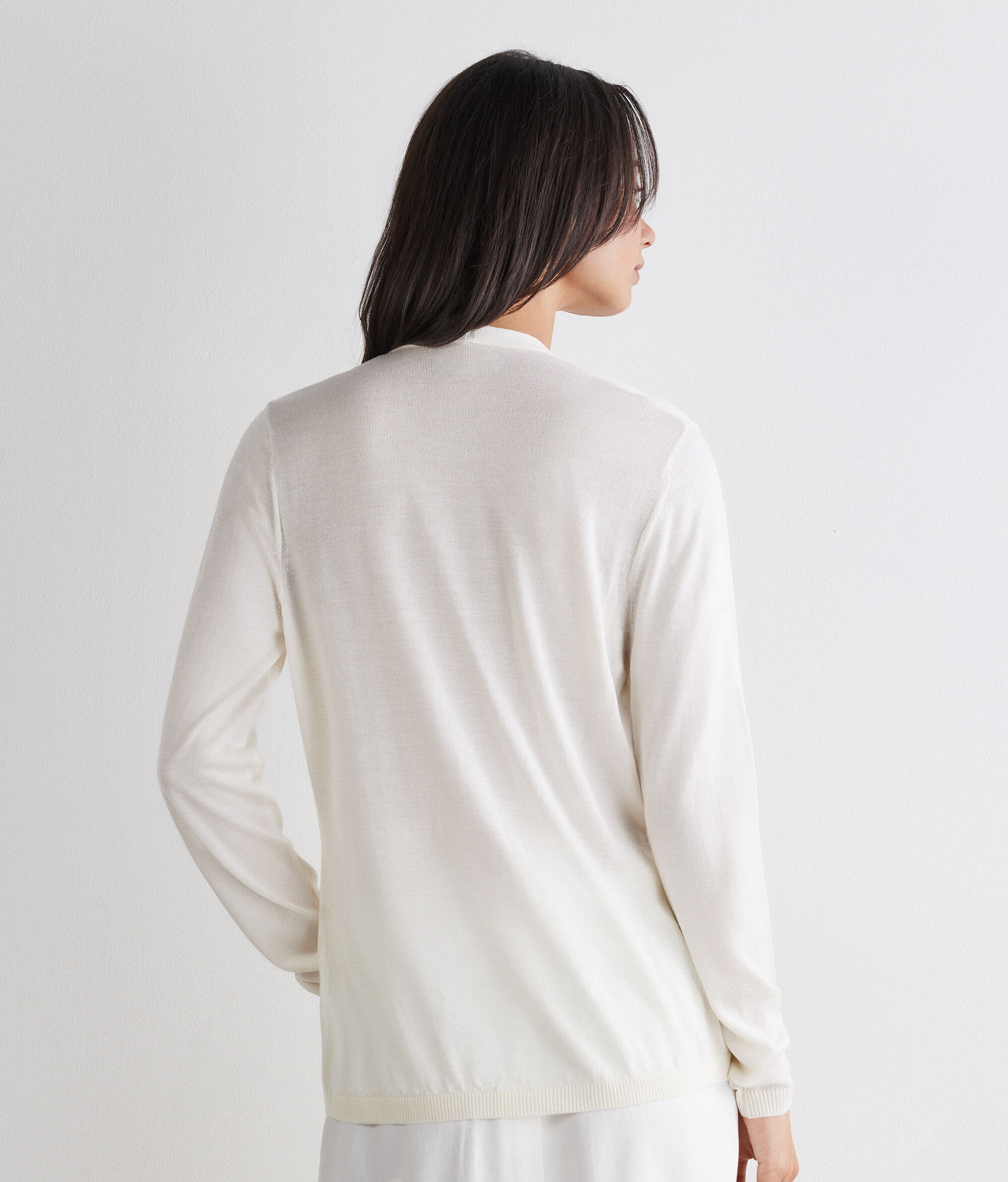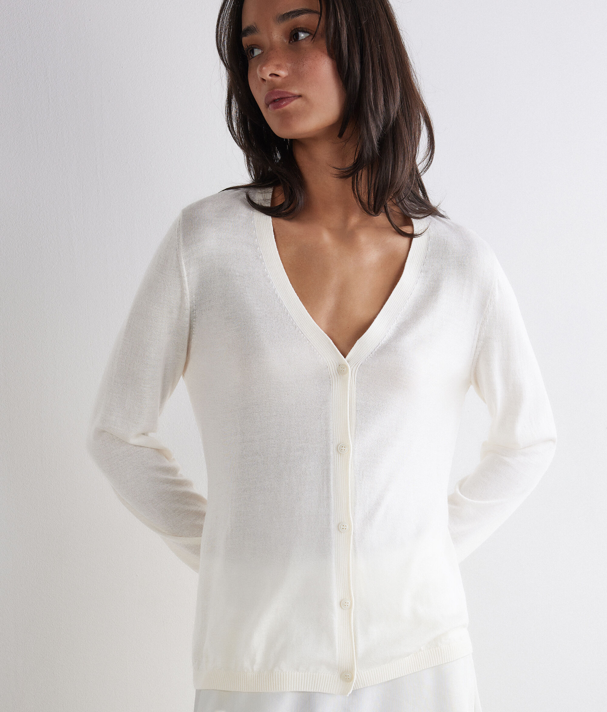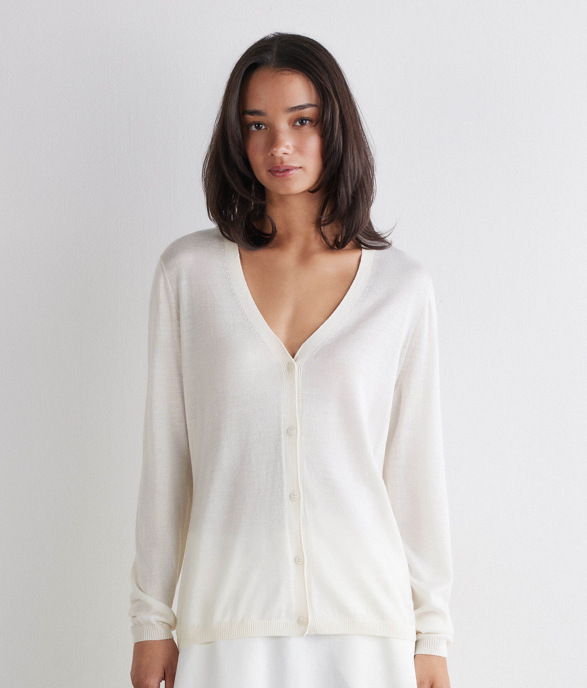 The softness of cashmere meets the sheen of silk in this timelessly charming sweater. Perfect for layering, it features a V-neck, front button fastening and ribbed trim, while the regular fit ensures comfort and a balanced silhouette.