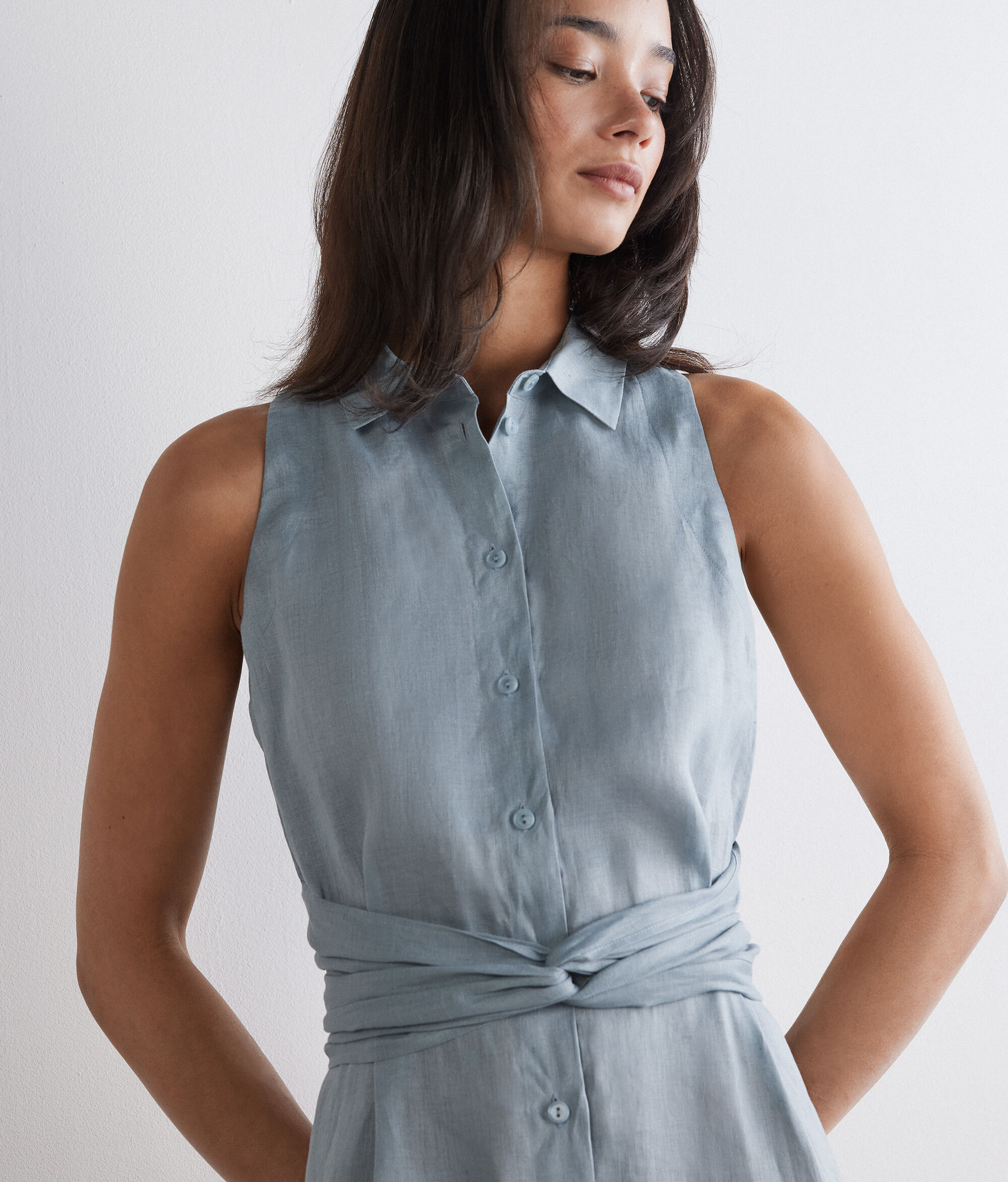 This refined, lightweight linen dress drapes beautifully and offers natural breathability – perfect for warmer days. The front button closure and classic collar add timeless elegance. The wide skirt flows gracefully outward, while the belt accentuates the waist.