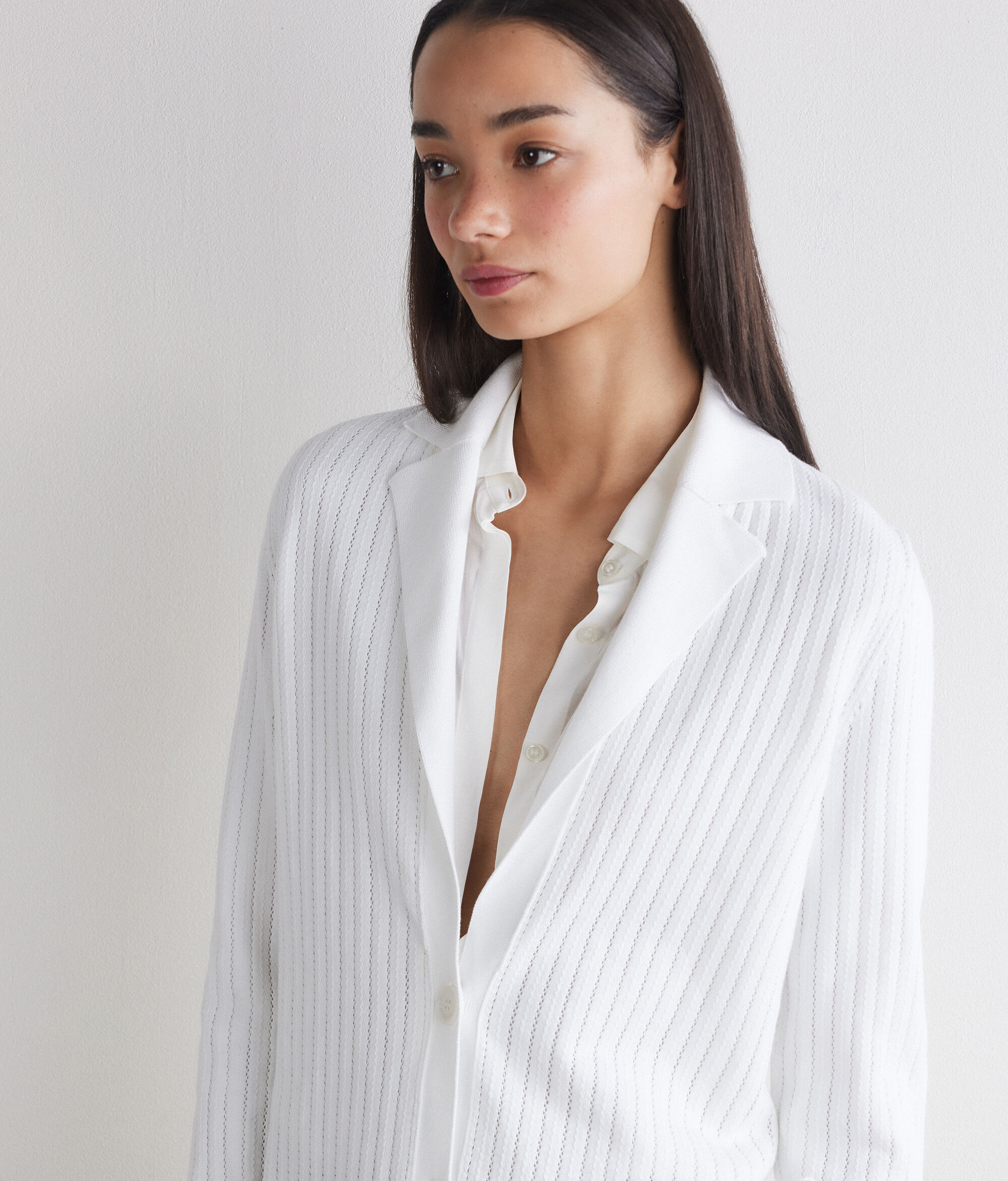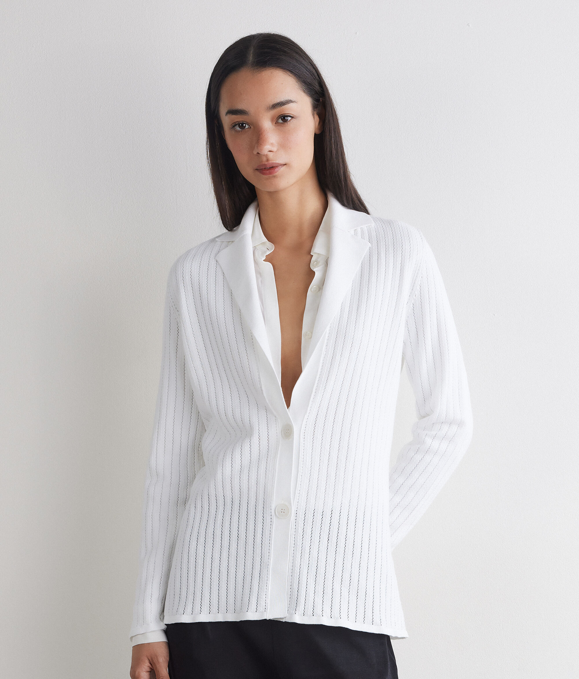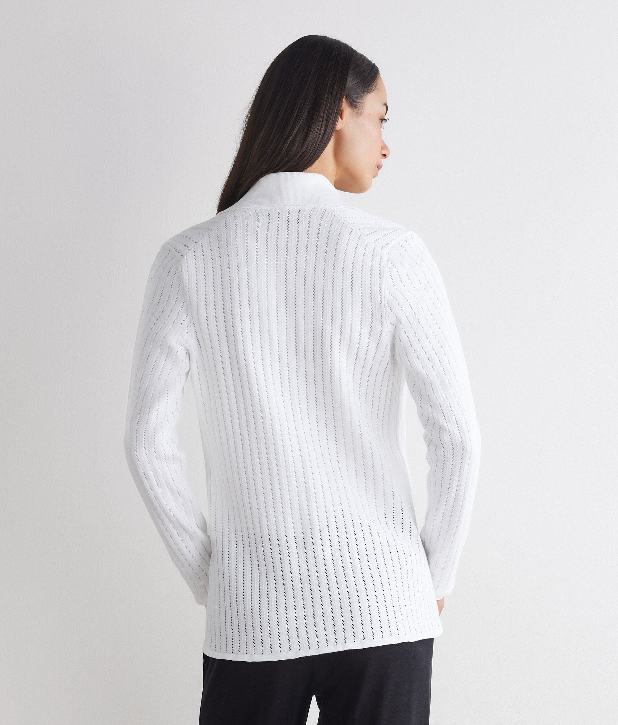 Jacket in striped openwork cotton knit (100% cotton), a light and breathable fabric. Ribbed cuffs and hem complete this regular-fit garment.