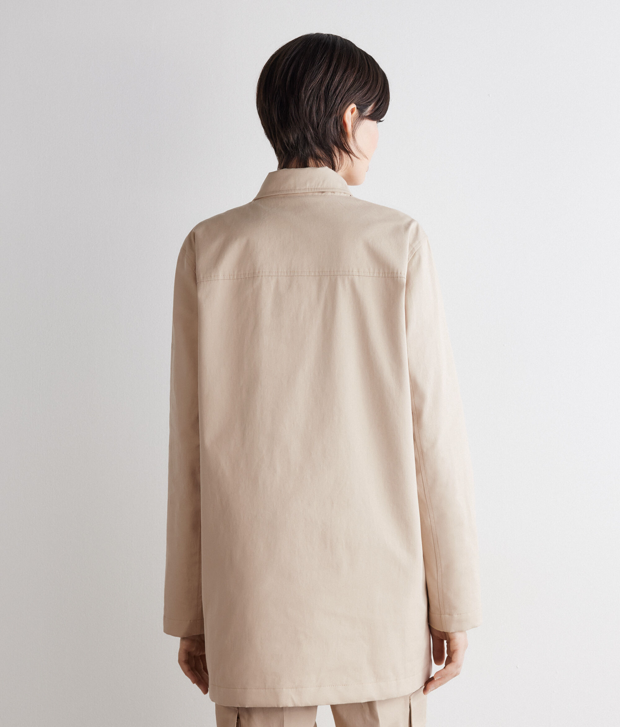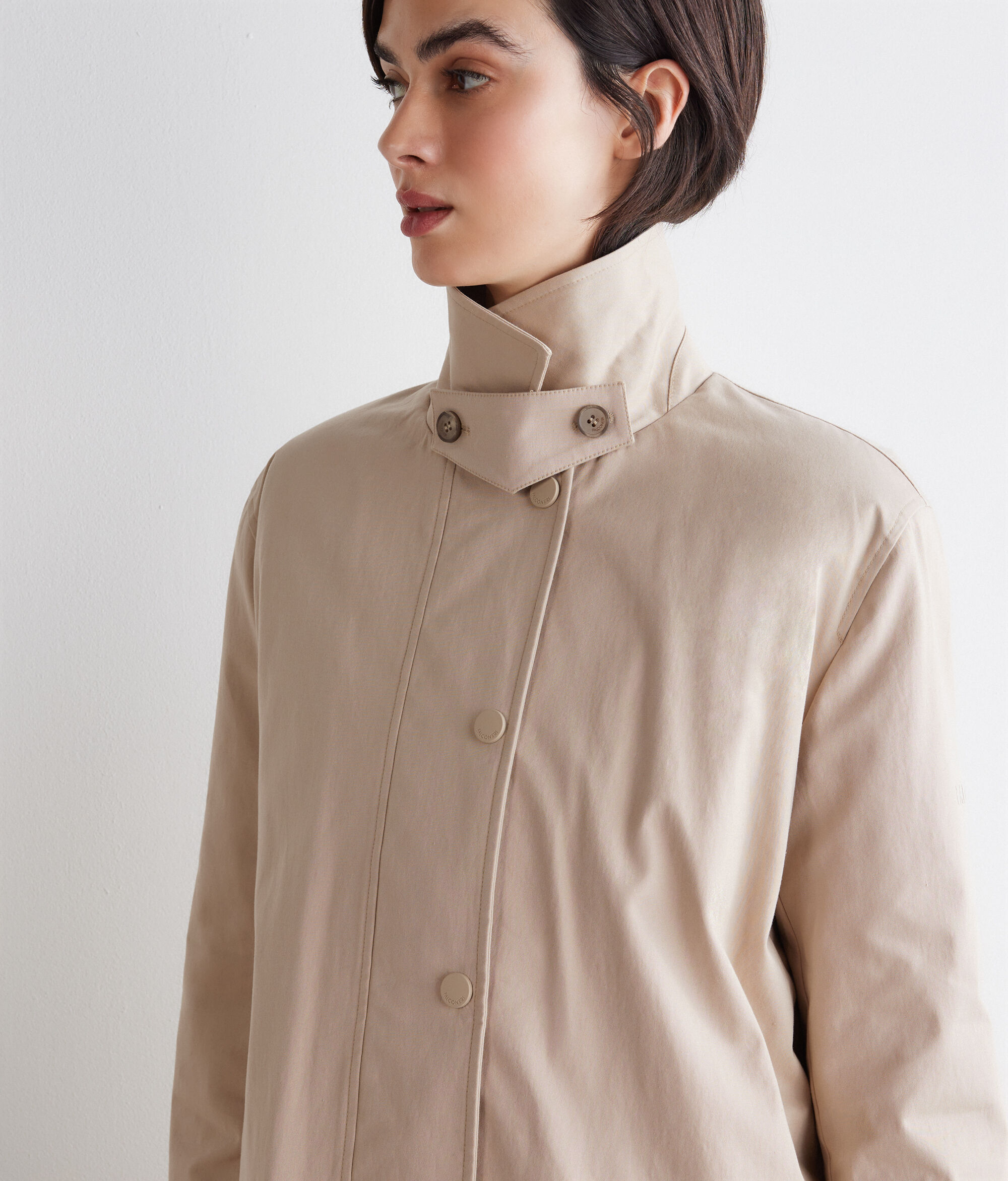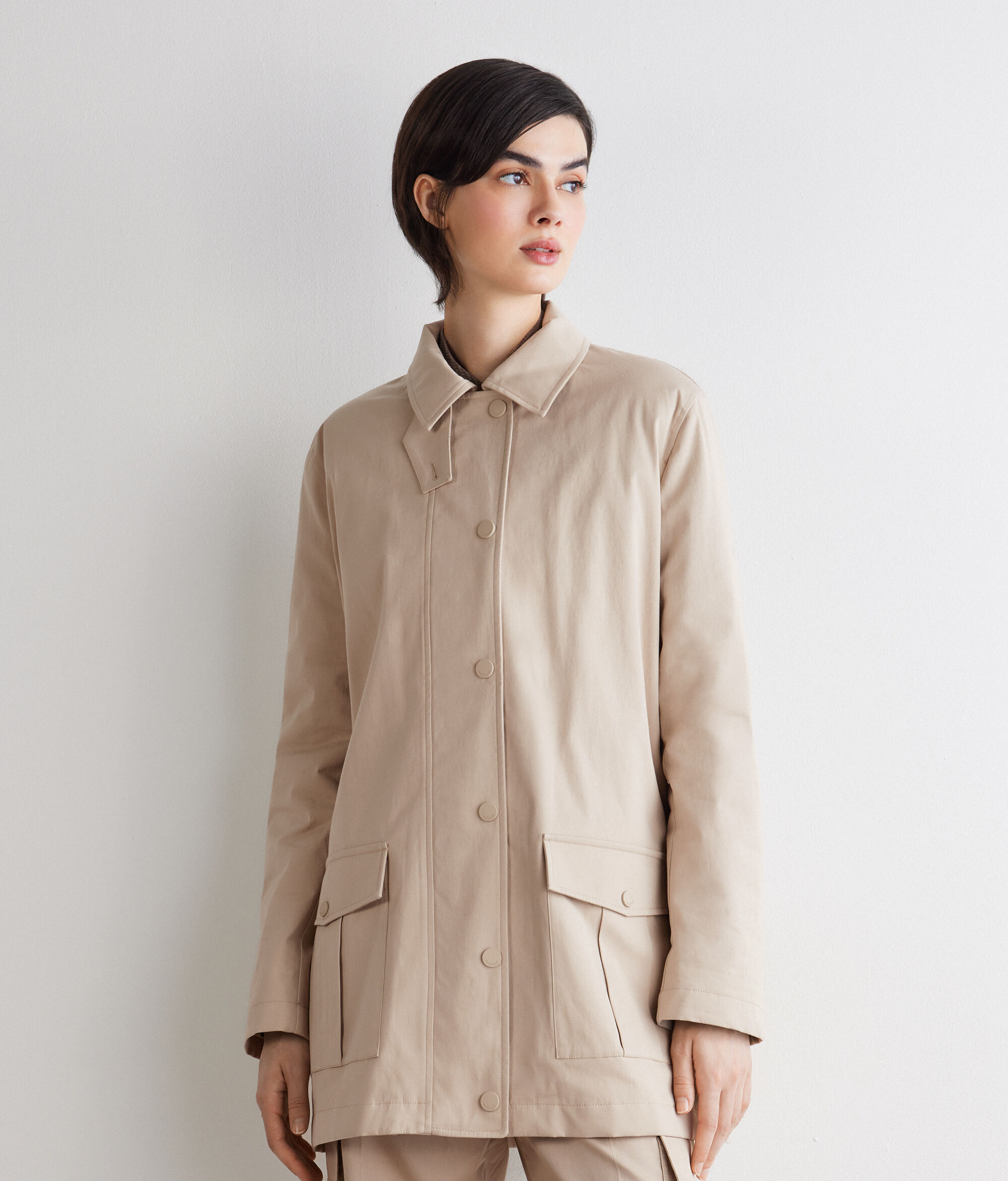 Technical jacket in water-repellent cotton fabric with Ultrafine Cashmere lining – the perfect balance between warmth and protection. Functional elements, such as the zip and snap button fastening, the chin strap and the patch pockets enrich the model’s versatile and contemporary design.