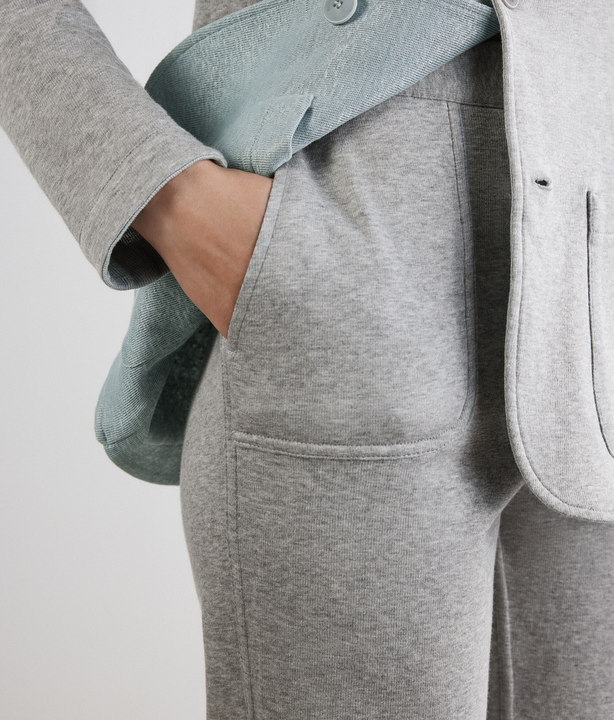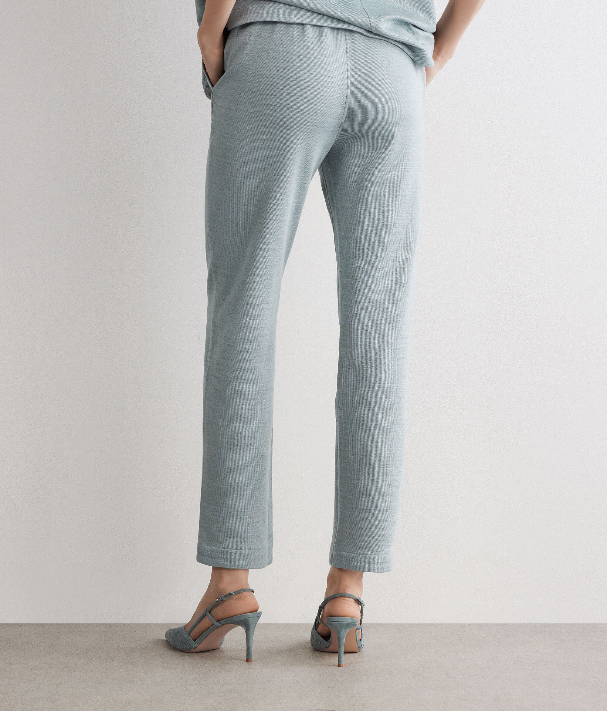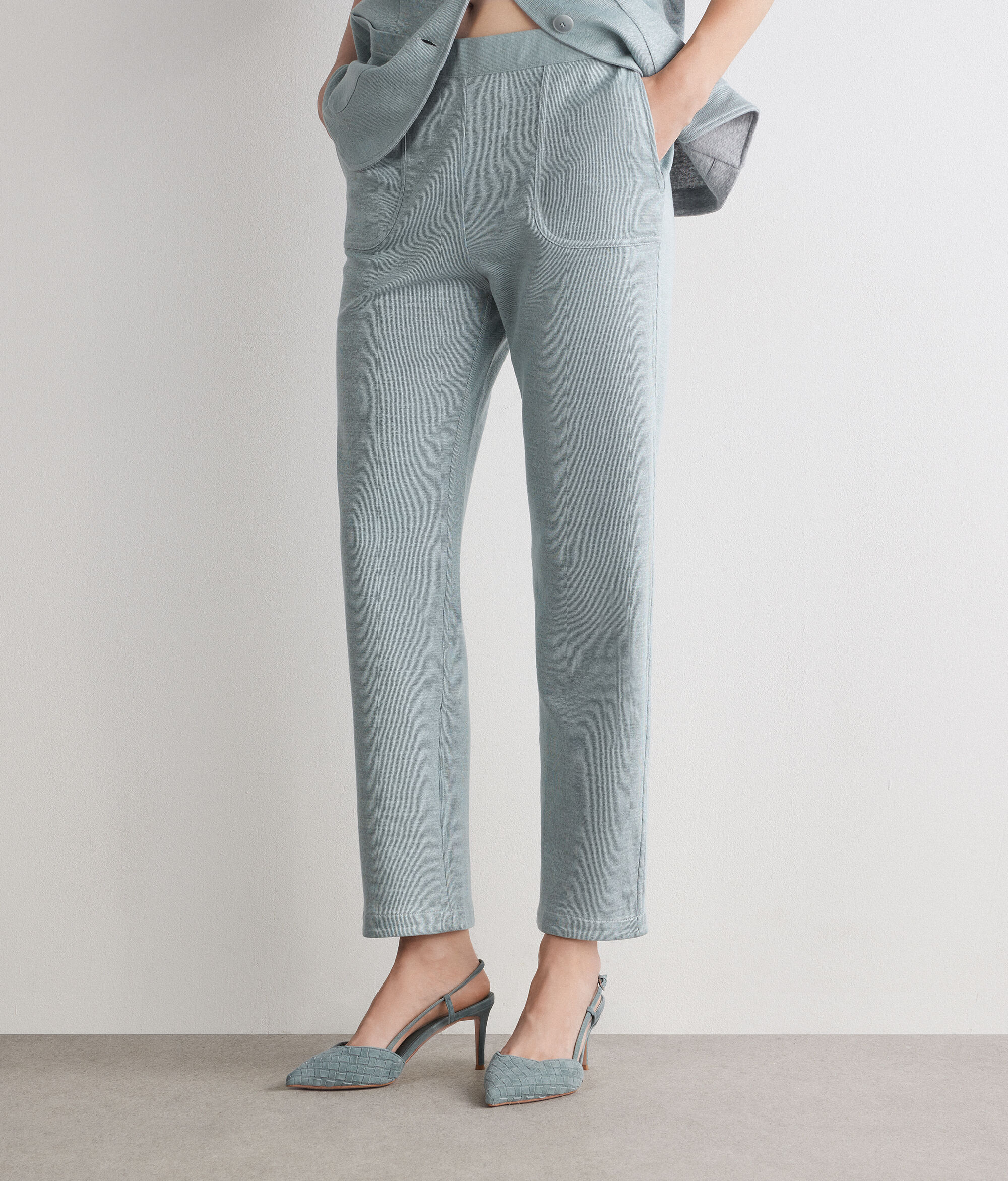 Two-tone, reversible trousers, designed for versatile, contemporary elegance. The linen exterior and cotton interior offer two distinct looks, while the cigarette fit and elasticated waistband at the back help to enhance the silhouette. The slant patch pockets complete the design with character, transforming the garment into a modern and sophisticated must-have.