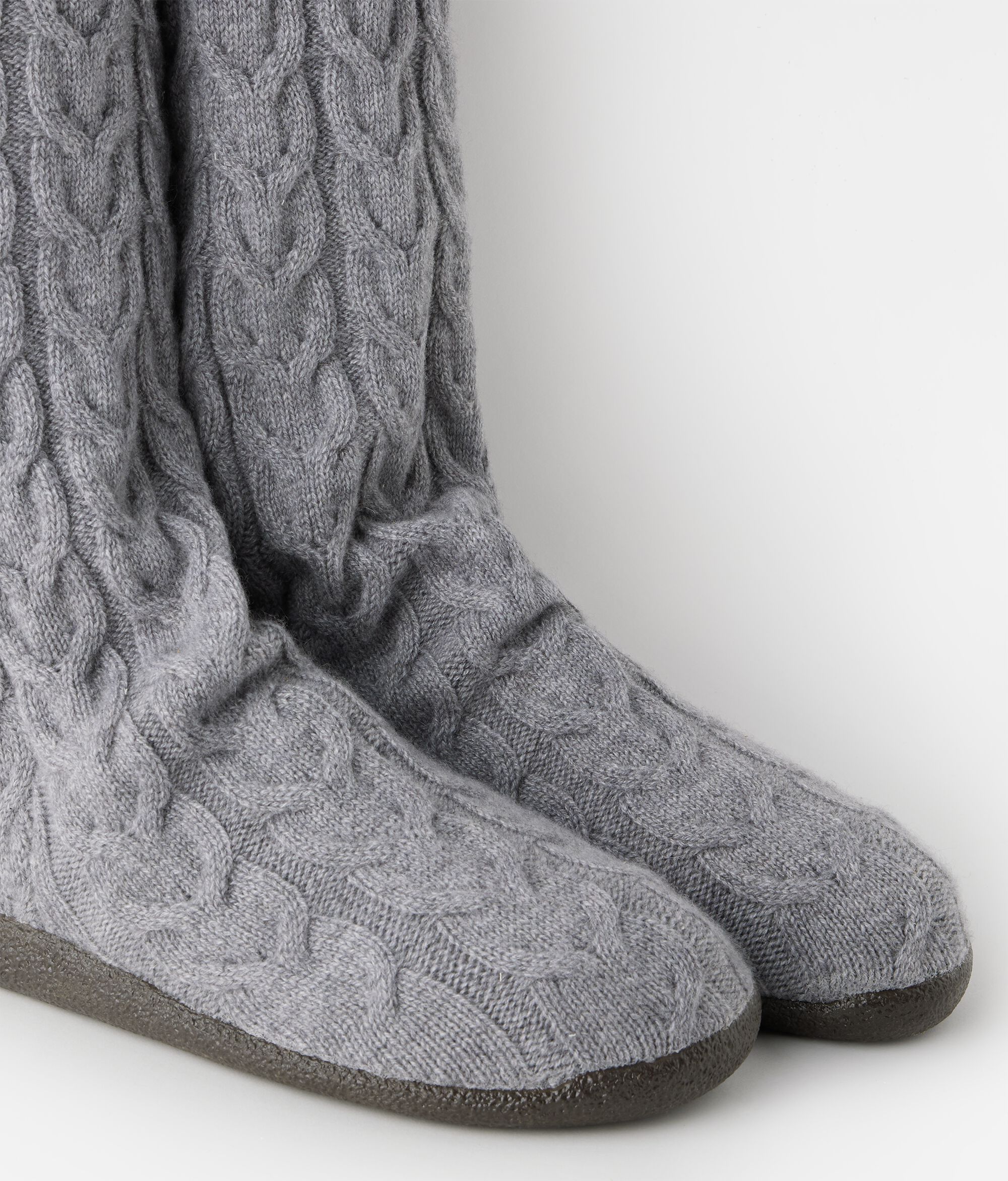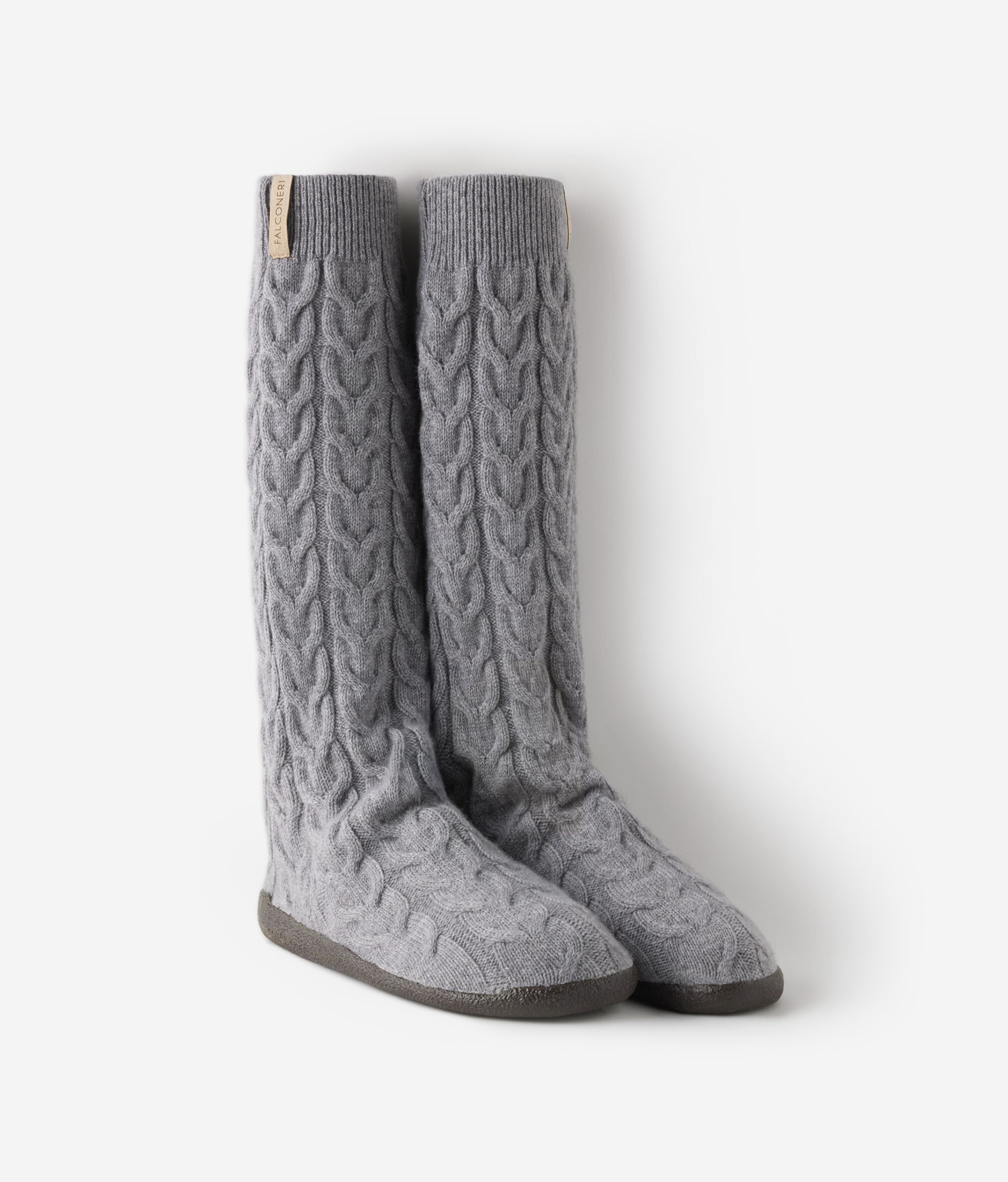Made from Ultrasoft Cashmere, these boots reinterpret the softness of cashmere as an accessory. The vertical cable-knit detail and ribbed finish add texture and definition, creating a sophisticated and contemporary play of volumes. The below-the-knee height and matching rubber sole accompany every step with elegance, transforming even the simplest look into an act of refined style.