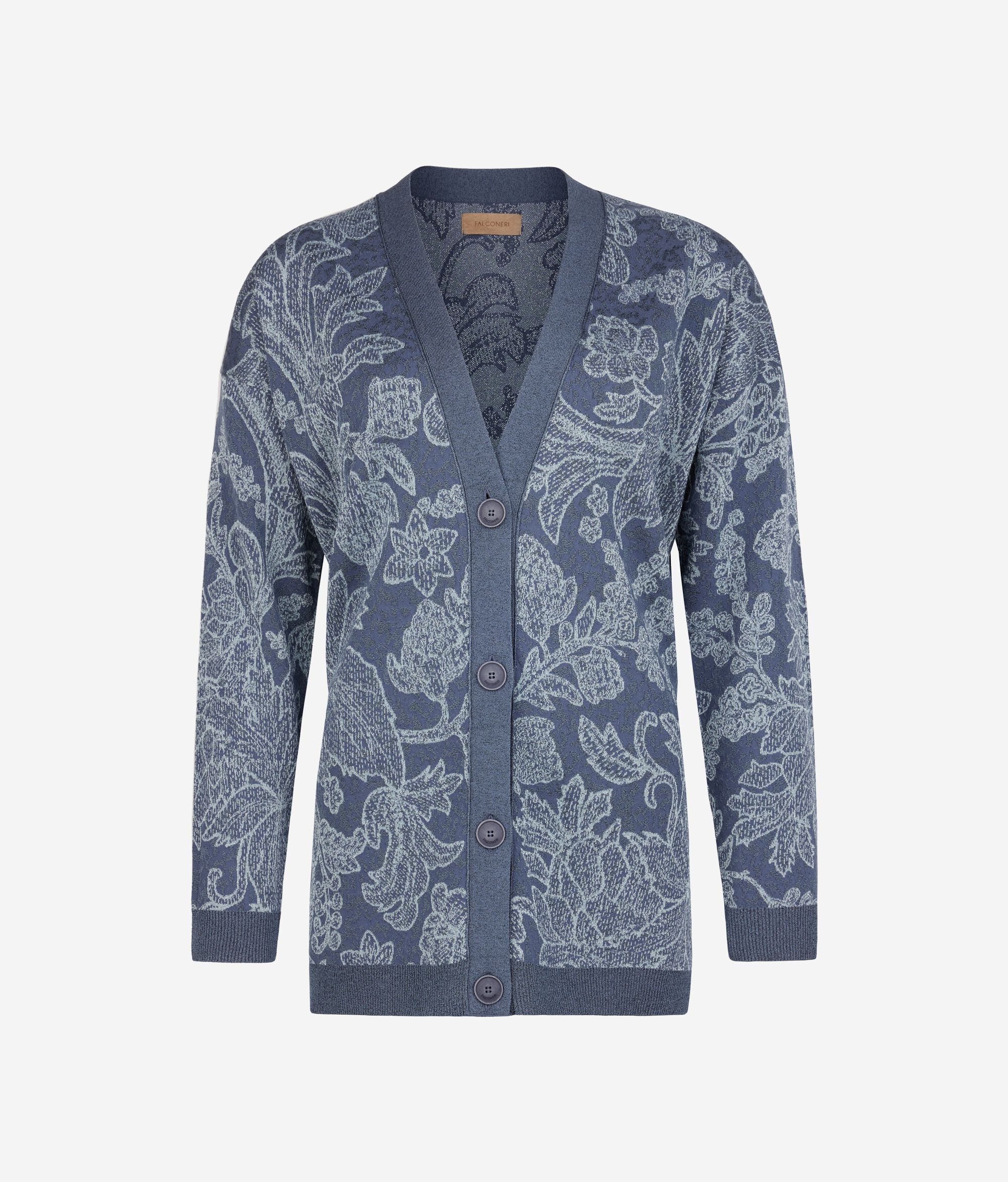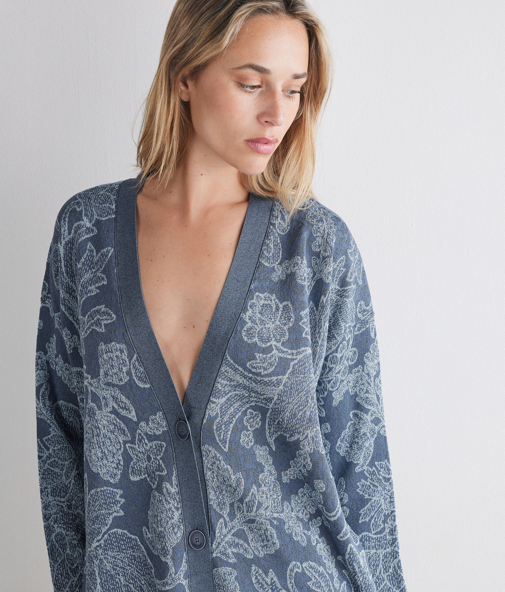Lame iplik ve rafine botanik nakış ile süslenmiş, jakarlı viskon ve pamuk triko hırka. Şal yaka ve dört düğmeli kapamanın yanı sıra yaka, etek ucu ve manşetlerde kontrast lame ribana kenarlar giysinin tasarımını güçlendiren detaylardır. Düşük omuz ve kalça altı boy, çağdaş ve konforlu bir stil için rahat kalıpla tamamlanan akışkan bir silüet oluşturur.
