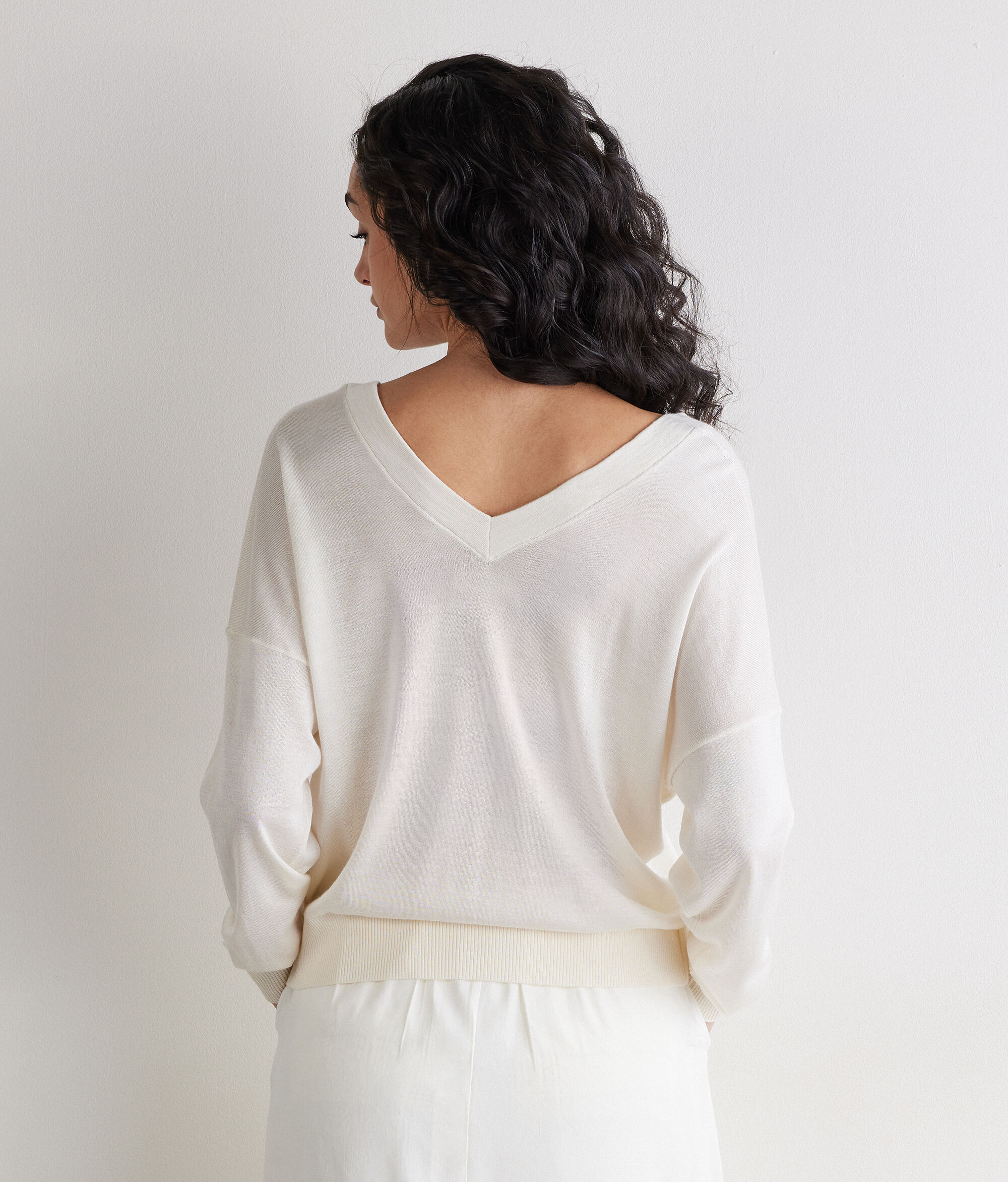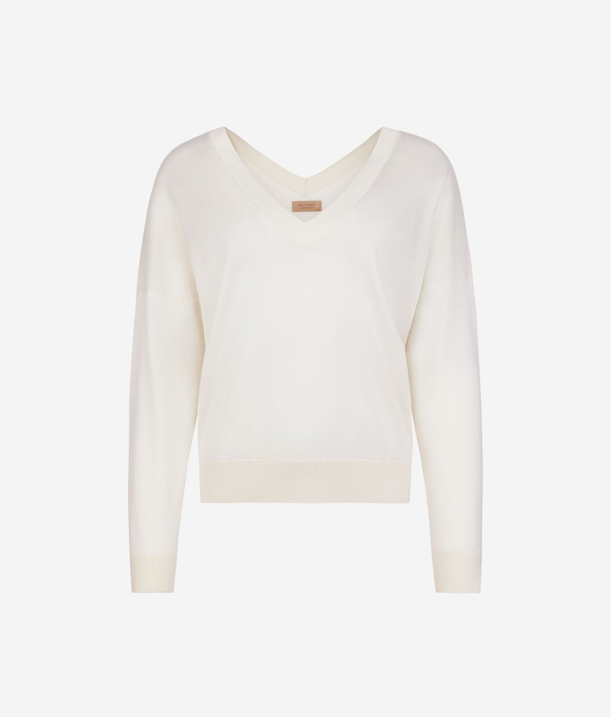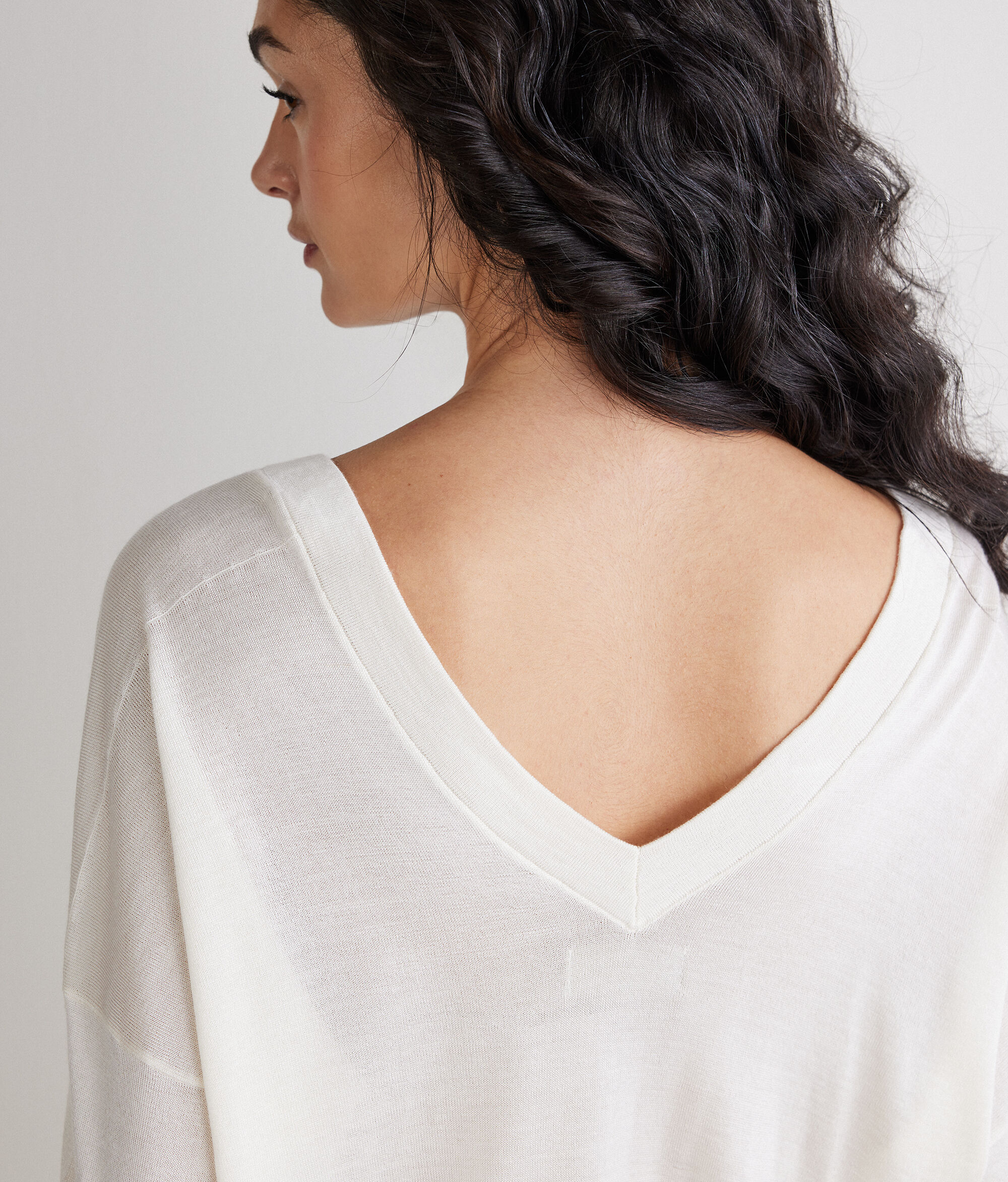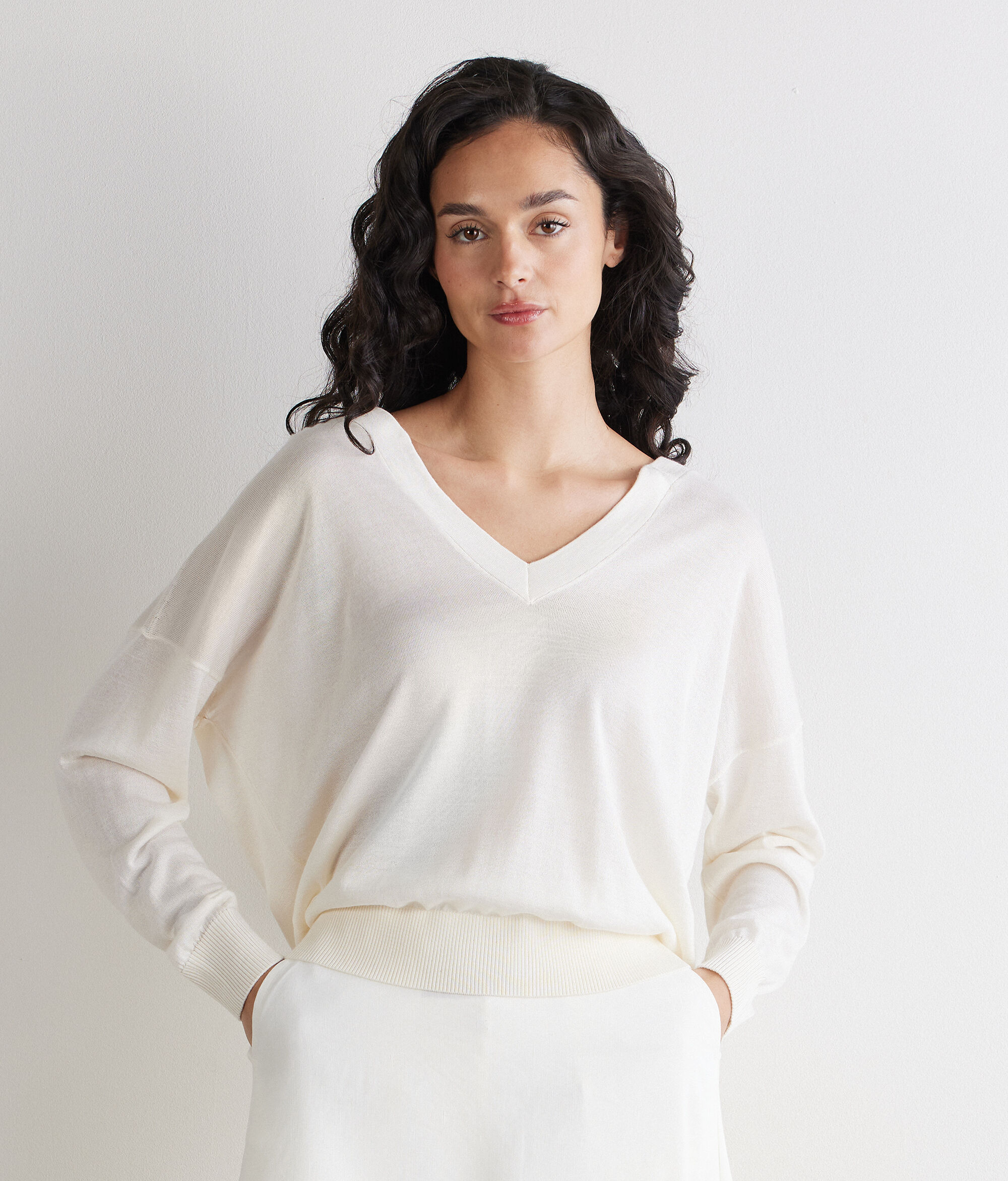Kaşmir ve ipekten üretilen bu lüks kazak, çekici ve hafif tasarımıyla öne çıkar. Çift V yaka, görsel bir derinlik oluşturarak dekolteyi öne çıkarırken, düşük omuz ve rahat kalıp, parçaya konforlu ve çağdaş bir siluet kazandırır. Kalça hizasında olan boy, parçanın çok yönlülüğünü vurgular ve her sezonda stil sahibi bir şekilde yorumlanabilecek, zamansız çekiciliğe sahip temel bir parça haline getirir.