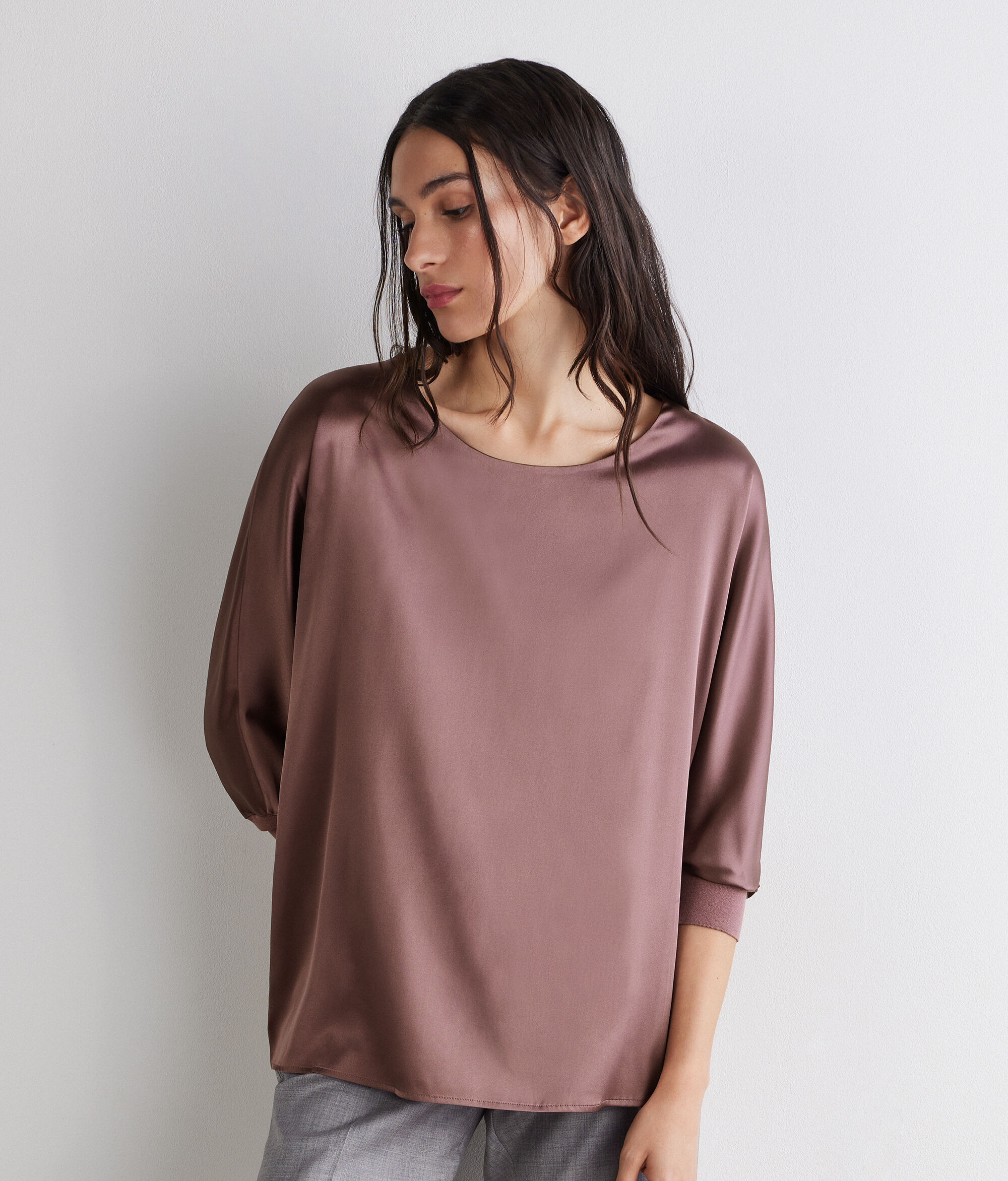 Zarif ve seçkin stili, bu ipek saten yuvarlak yaka kazağı ön plana çıkarır. Tasarım, örgü manşetler, parçaya akışkanlık ve karakter katan kimono kollar gibi özenle seçilmiş detaylarla zenginleştirilmiştir. Rahat kalıp, yumuşak ve kadınsı silueti vurgulayarak çağdaş bir dokunuş katar.