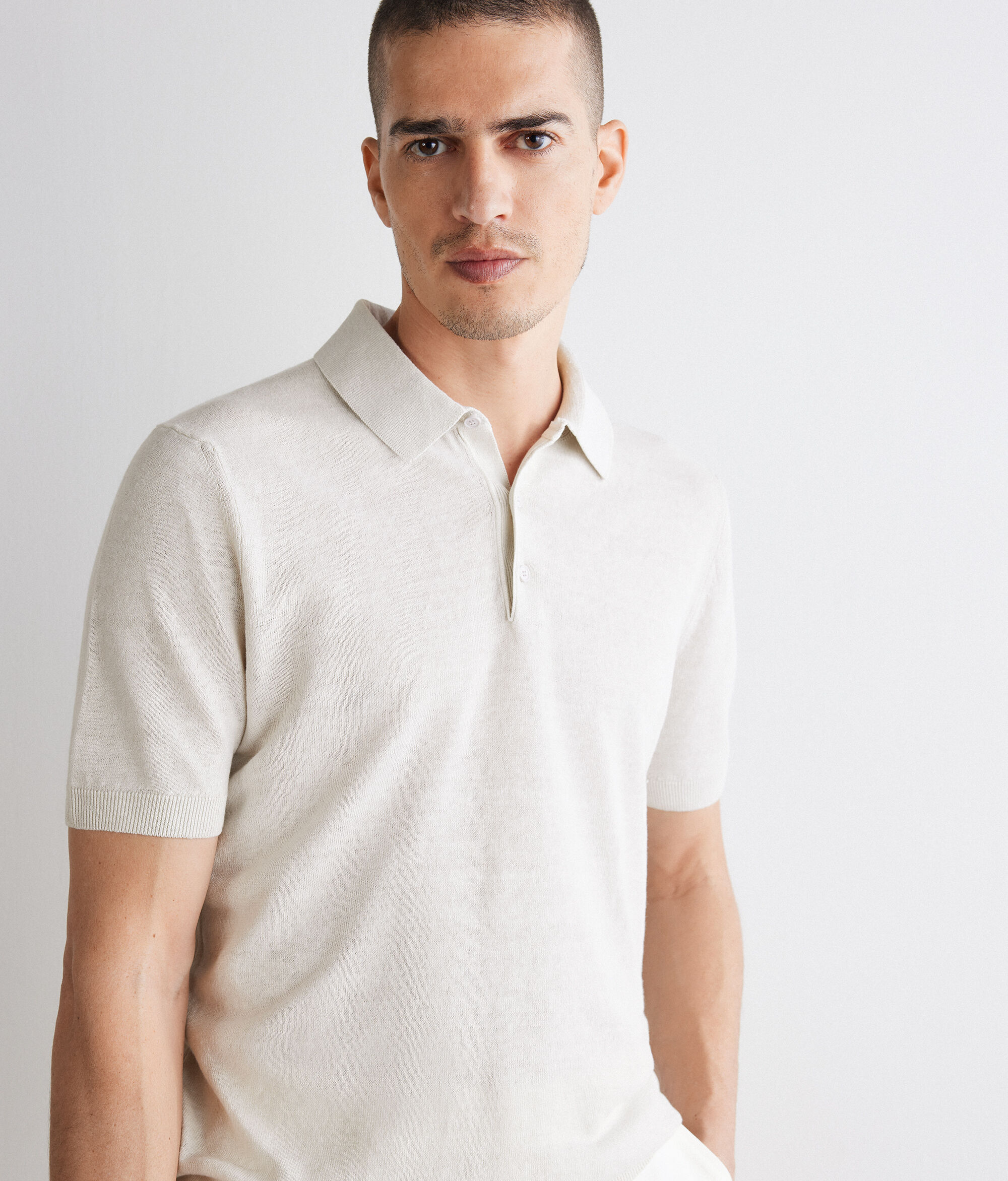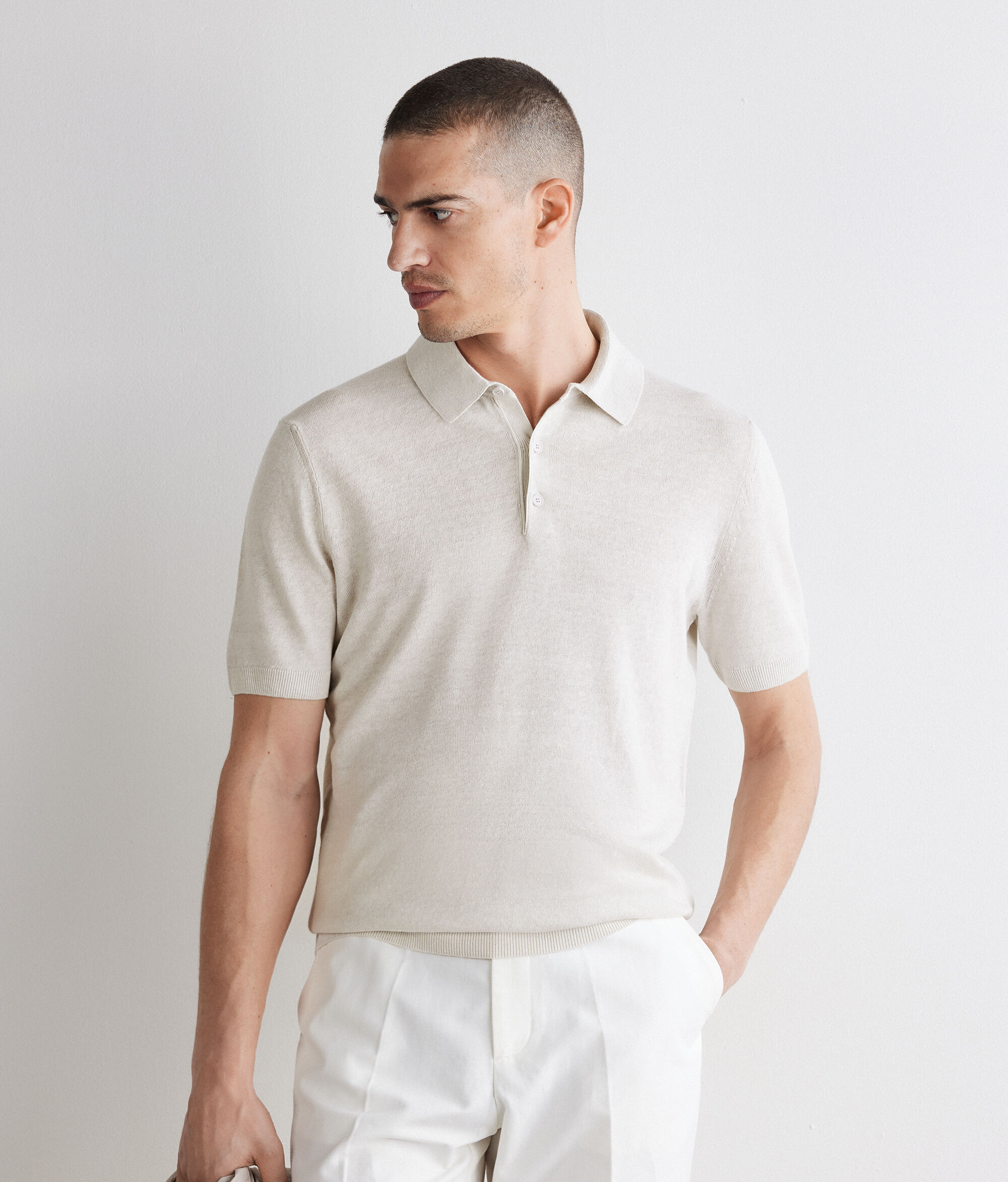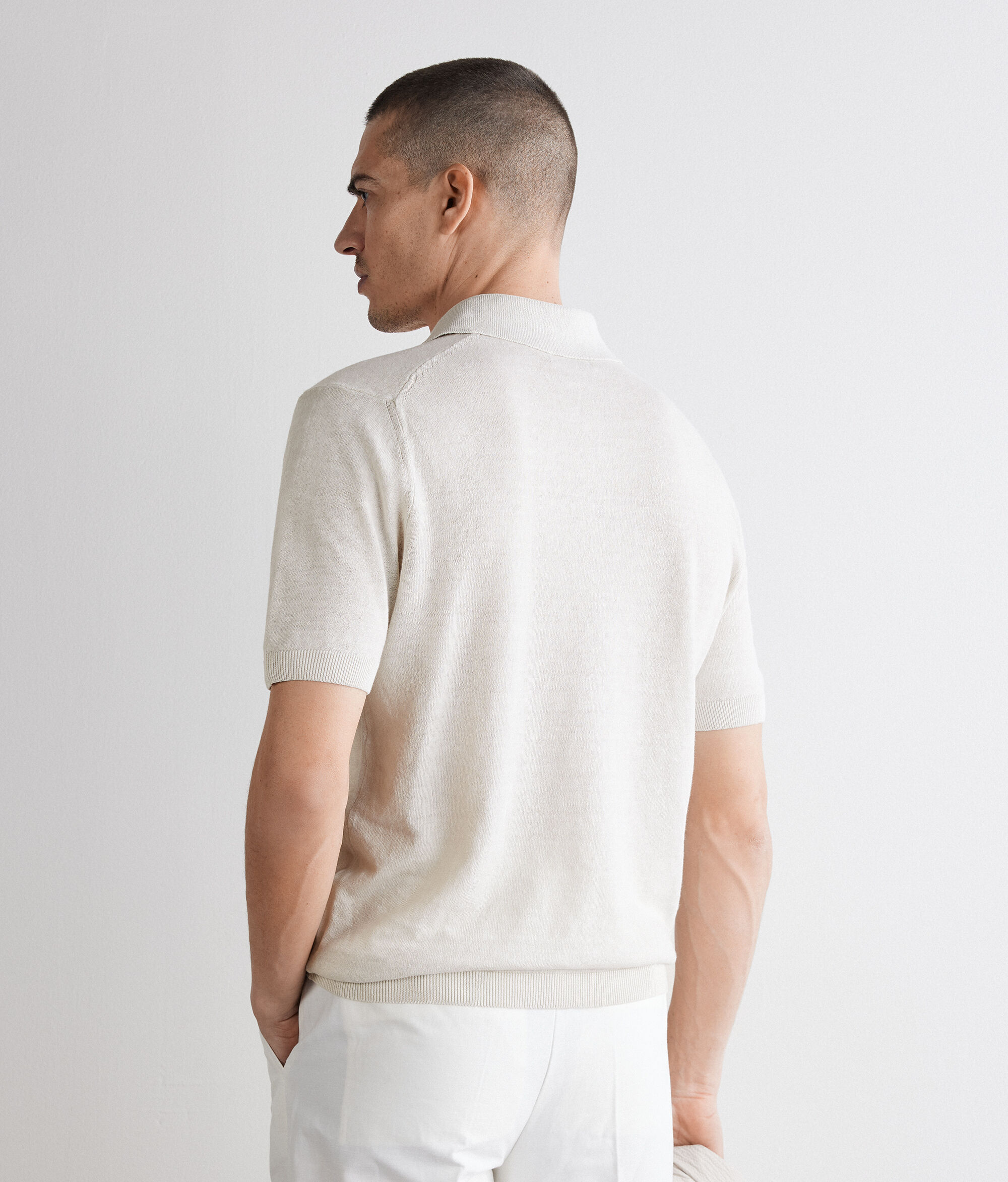Keten ve pamuktan çalışılmış (%63 keten, %37 pamuk) hafif ve nefes alabilen polo. Standart kalıp bu model, ribana kenarlarla tamamlanmıştır.