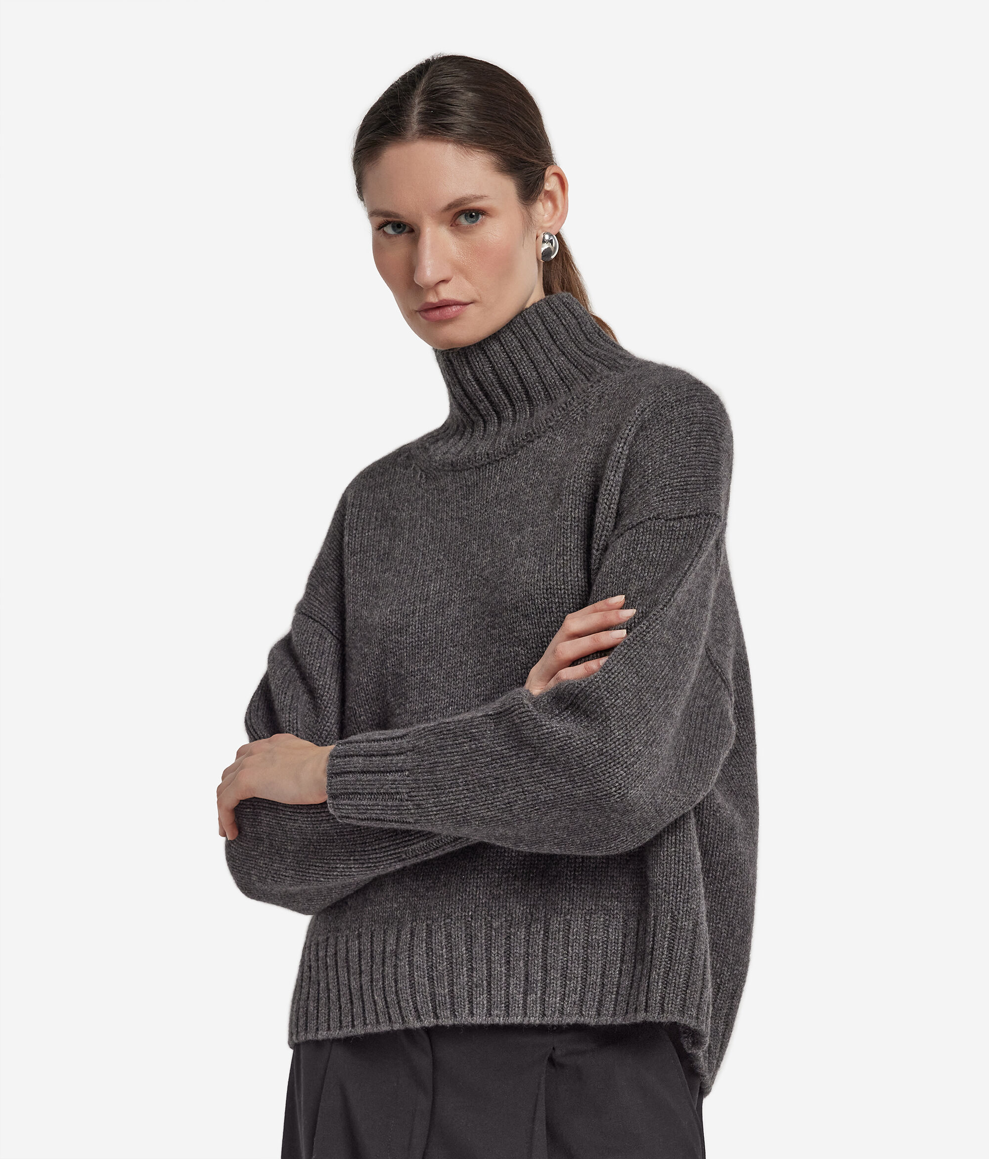 Triko Ultrasoft Cashmere'in lüks yapısı bu yüksek yakalı kazağın modern çizgileriyle buluşur. Klasik bir zevkle ipliğin doğal yumuşaklığını ve yumuşak hacimlere sahip formu, günlük kullanımda parçanın konforlu olmasını sağlayan düşük omuzlarla birleştirir.