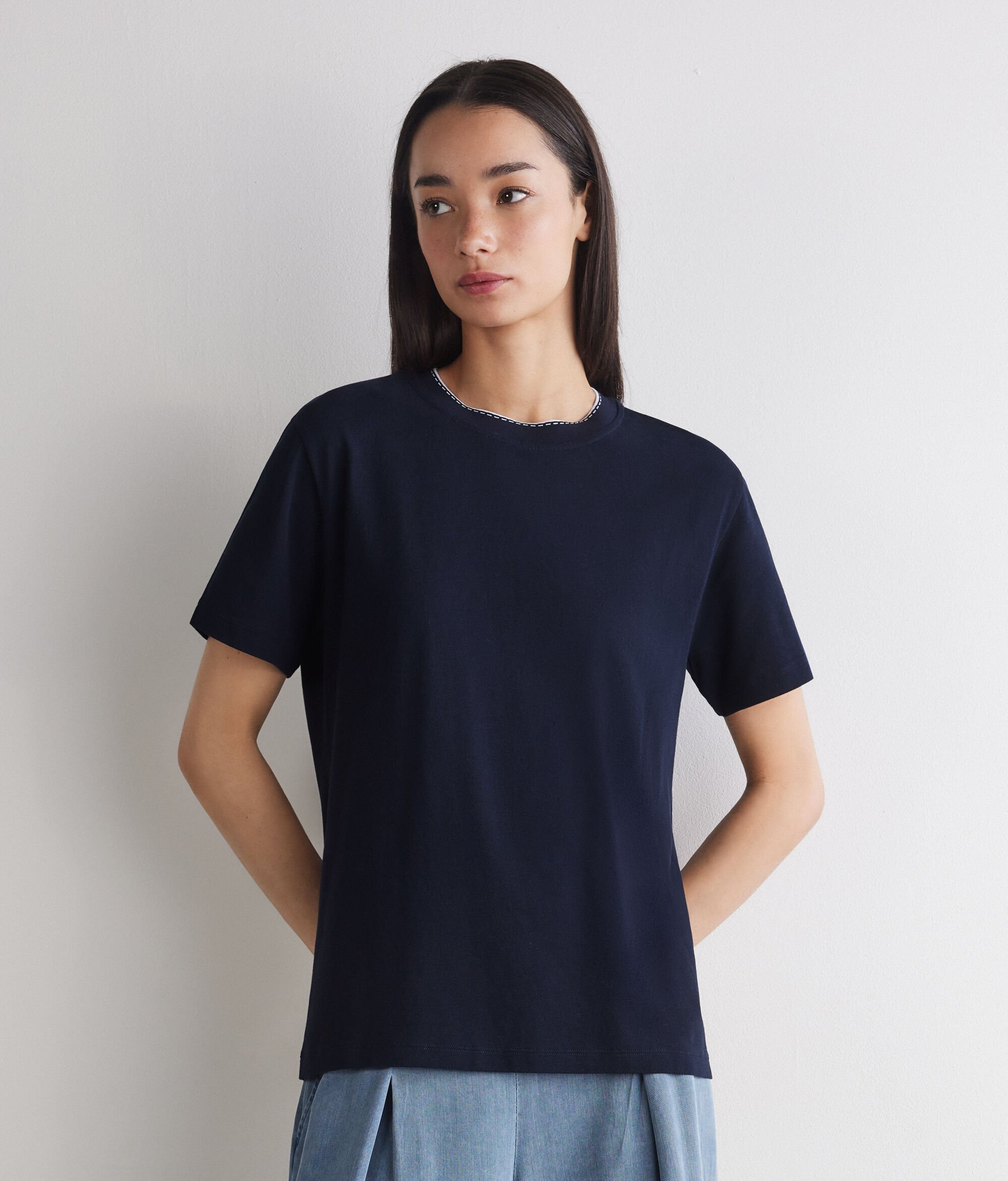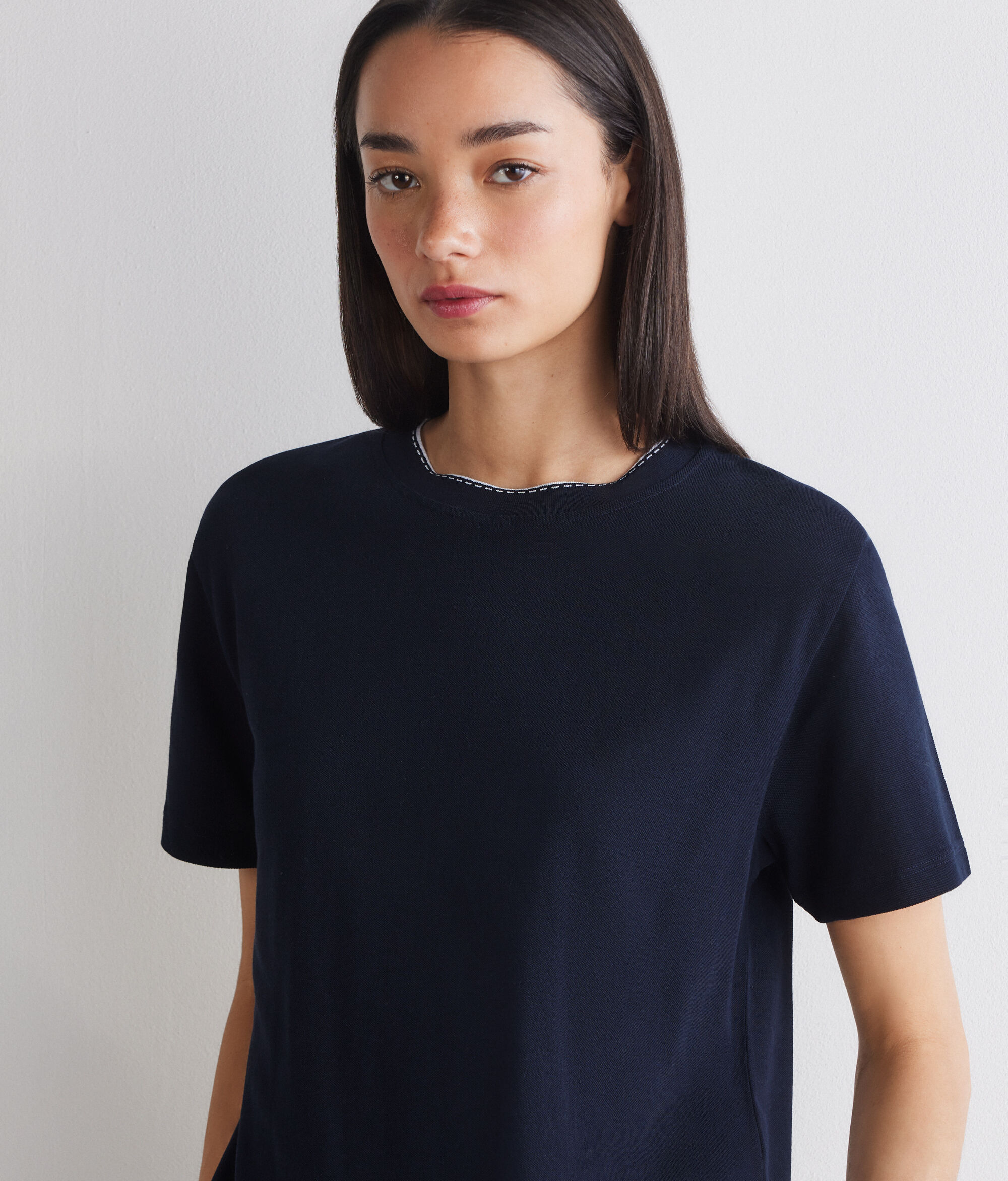 Giysinin minimalist estetiğini vurgulayan zarif kontrast desenli bisiklet yakayla zenginleştirilmiş pamuk ve ipek karışımı (%83 pamuk, %17 ipek) pike kumaştan çalışılmış tişört.