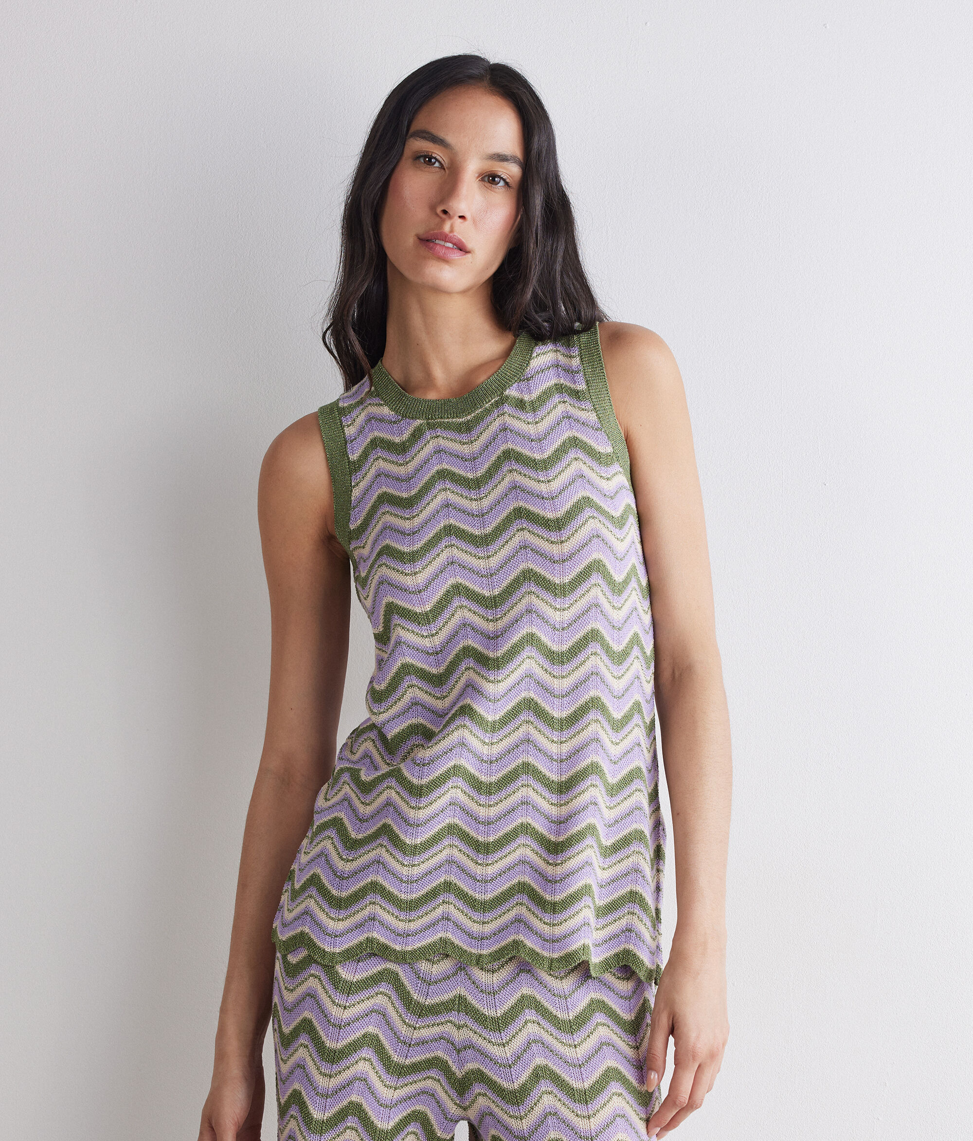 Cotton knit tank top with lamé yarn, embellished with a multicoloured chevron pattern. The slightly flared line is enhanced by contrasting ribbed finishes.