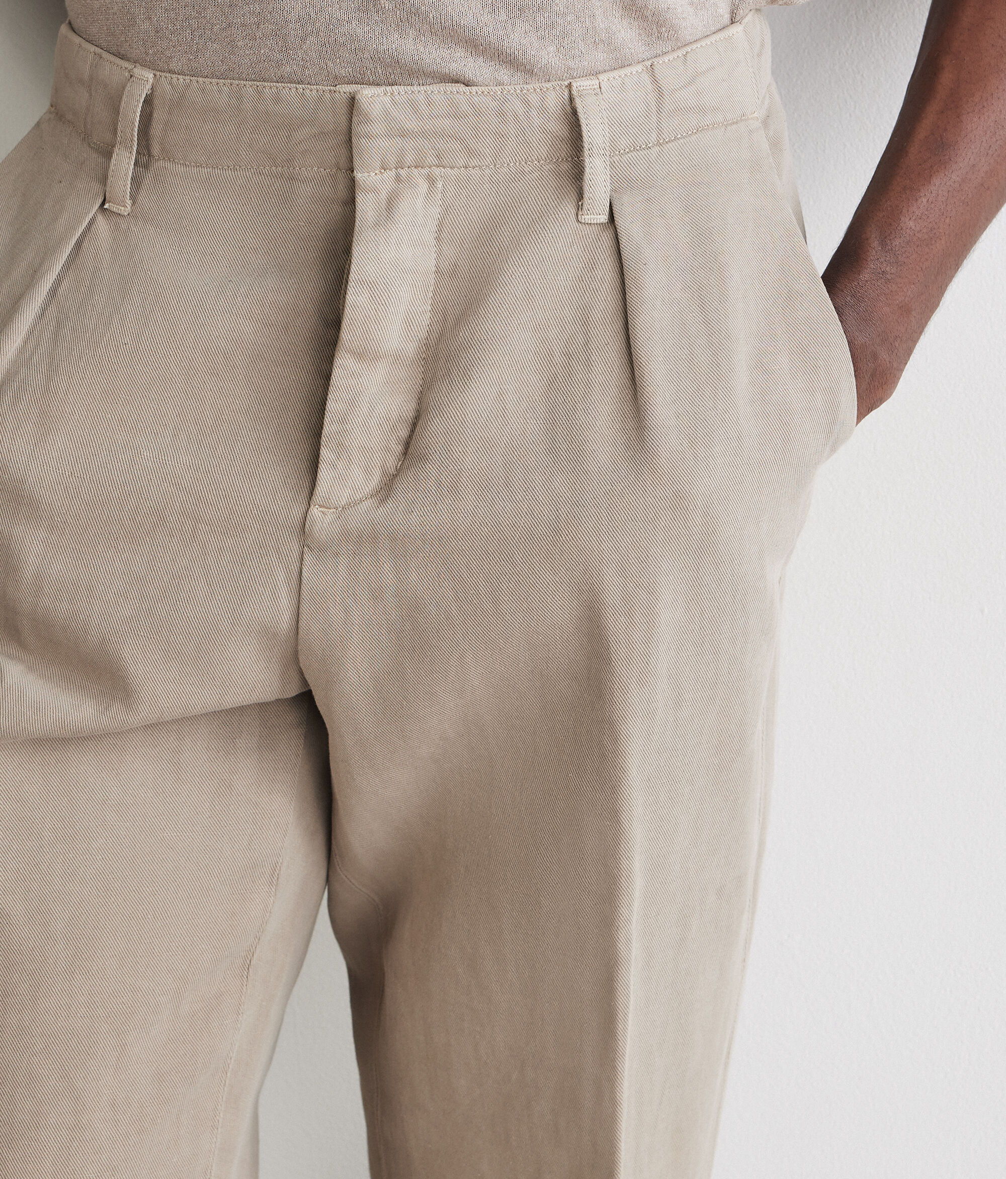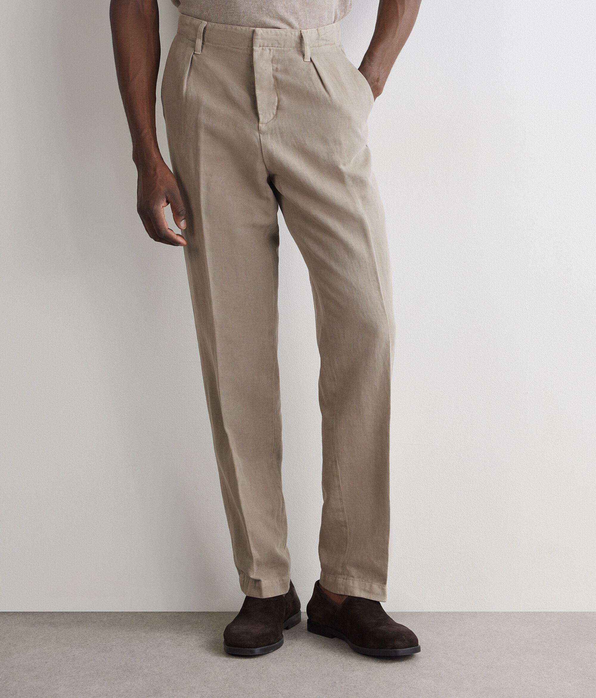 Cotton and linen tailored trousers with a wide-leg cut. The design features a waistband with belt loops, slant pockets on the front and welt pockets on the back with button and loop fastening. The leg is defined by pleats and a central crease, while the waist fastens with a button and button fly front, ensuring a regular fit and an essential style.