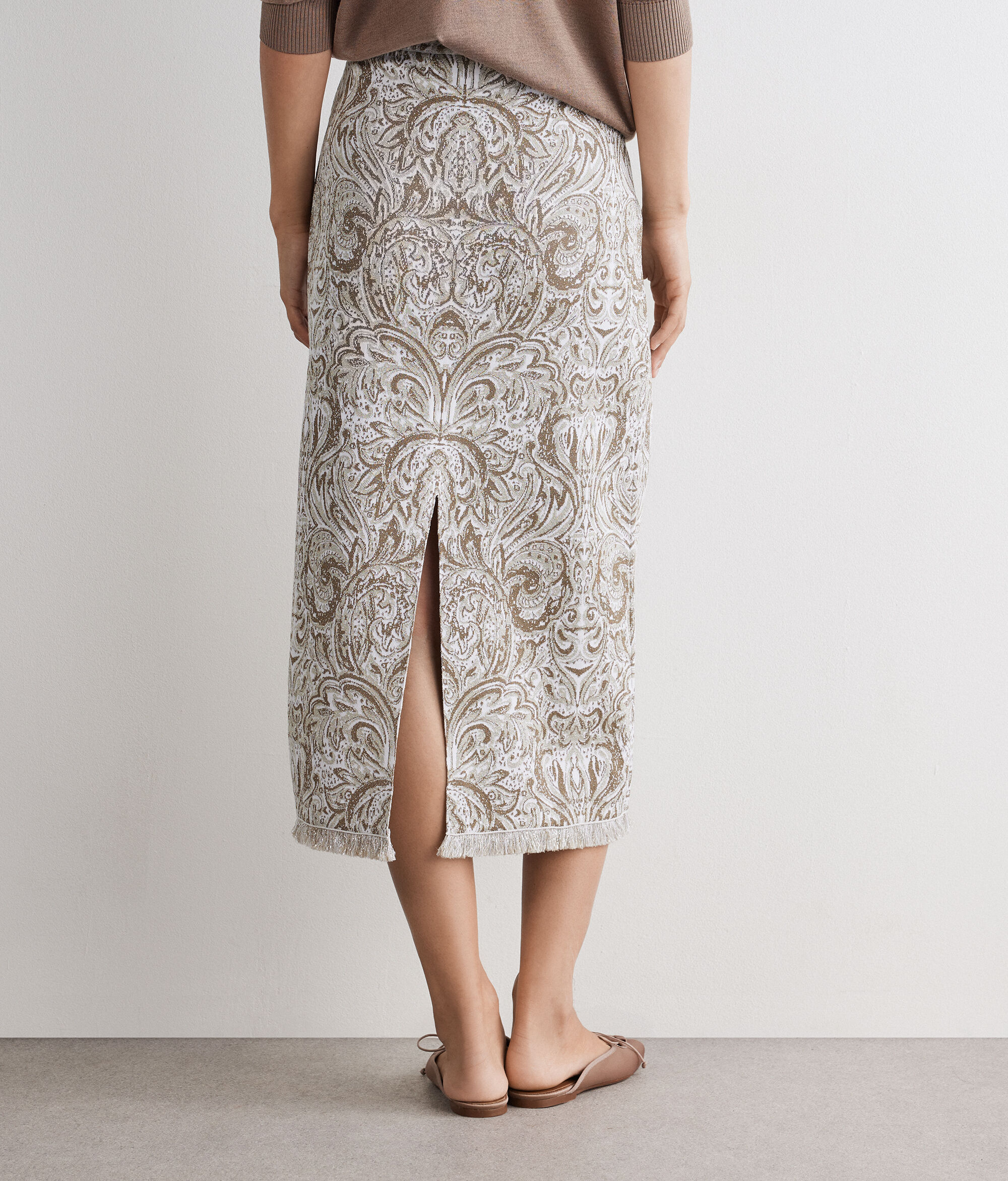Cotton viscose knit skirt with elegant jacquard effect, embellished with bright lamé yarn. The paisley pattern adds character to the design, while the elastic waist ensures comfort and a natural fit. The refined lamé fringe insert at the hem and the slit at the back complete the garment with femininity and movement.