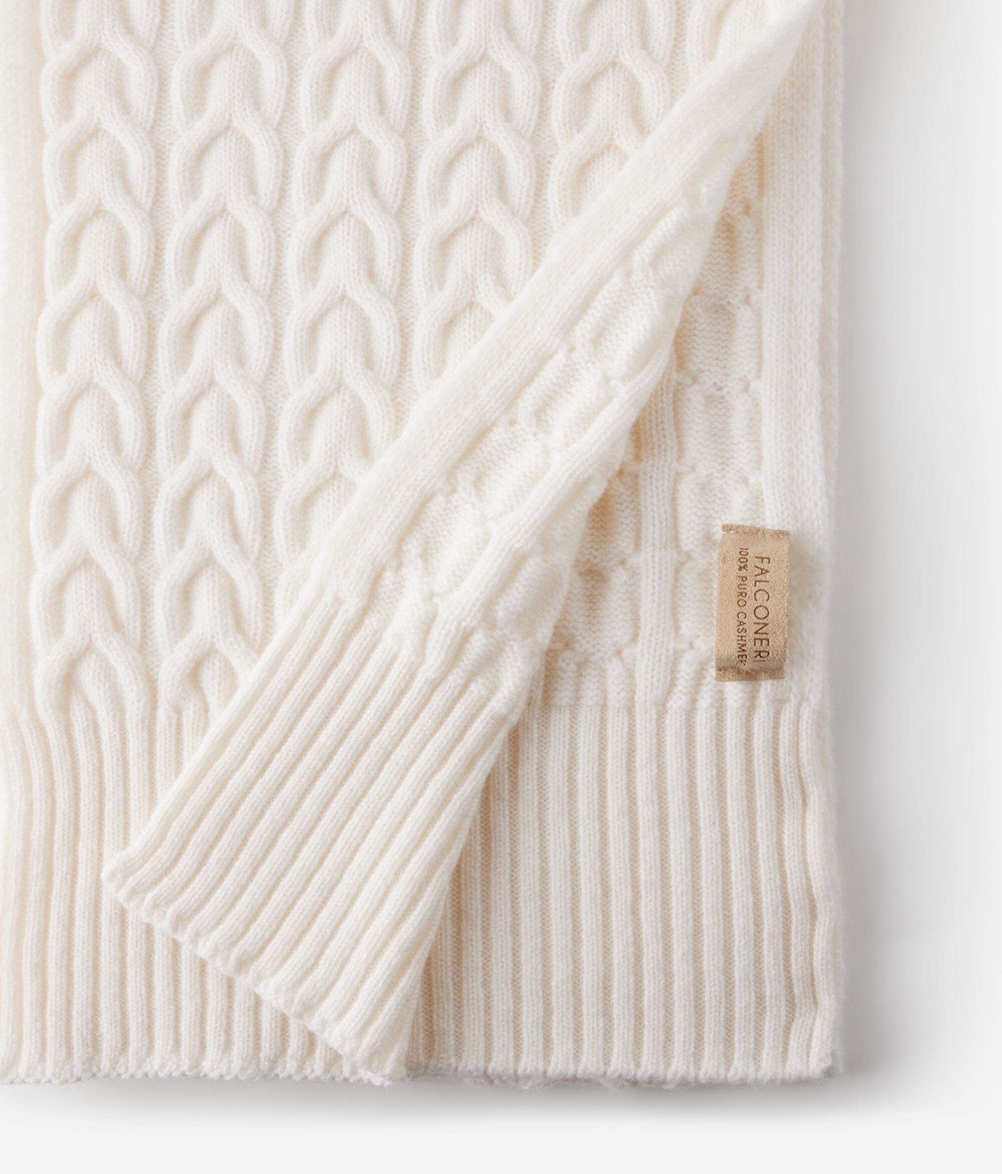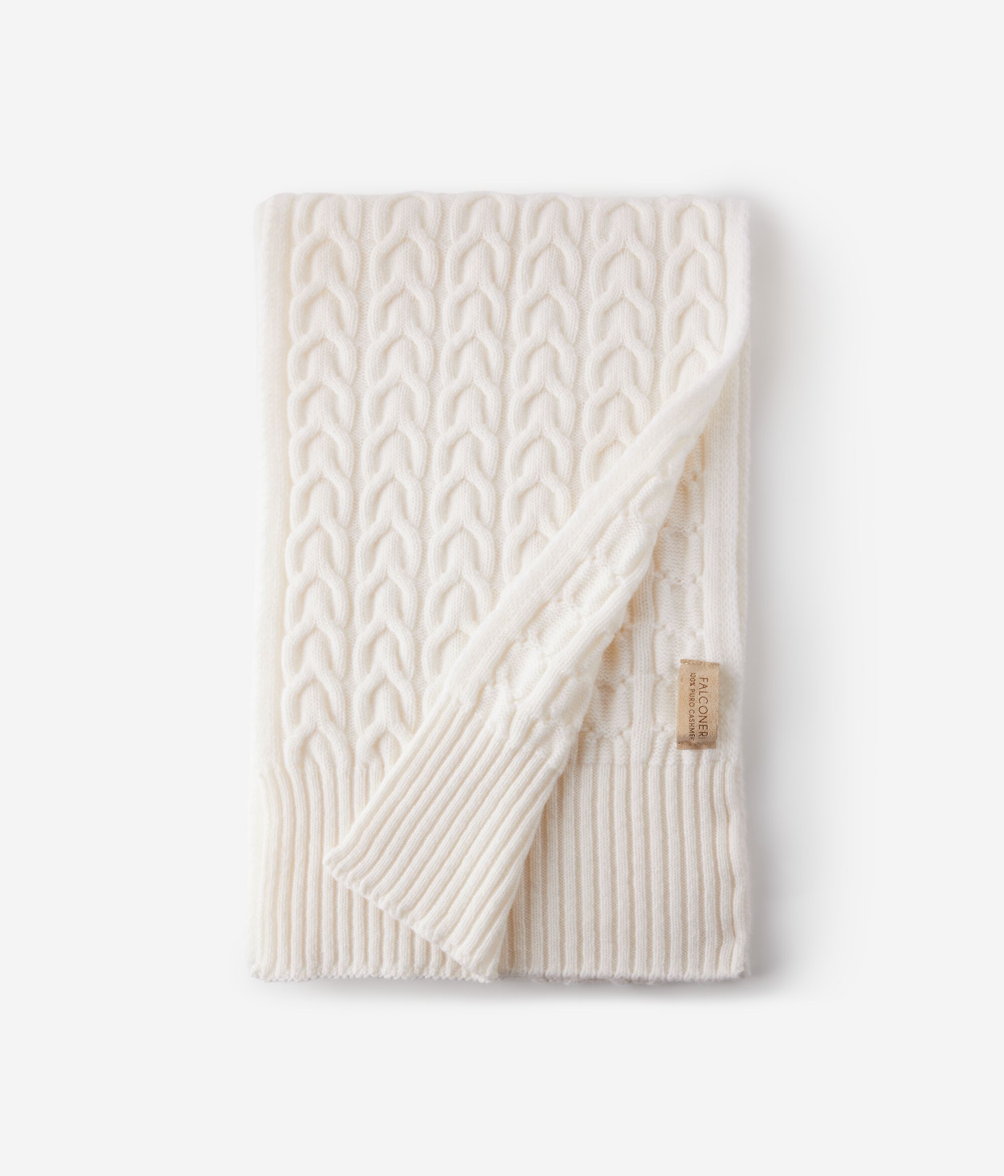 Made from exquisite Ultrasoft Cashmere, this scarf envelops you in unrivalled softness, elevating every gesture into a refined expression of style. The vertical cable knit sustains a refined visual rhythm, while the ribbing at the hem discreetly defines the contours, imparting harmony and character to the garment. A timeless accessory, designed for those who love to combine comfort and sophistication on every occasion.