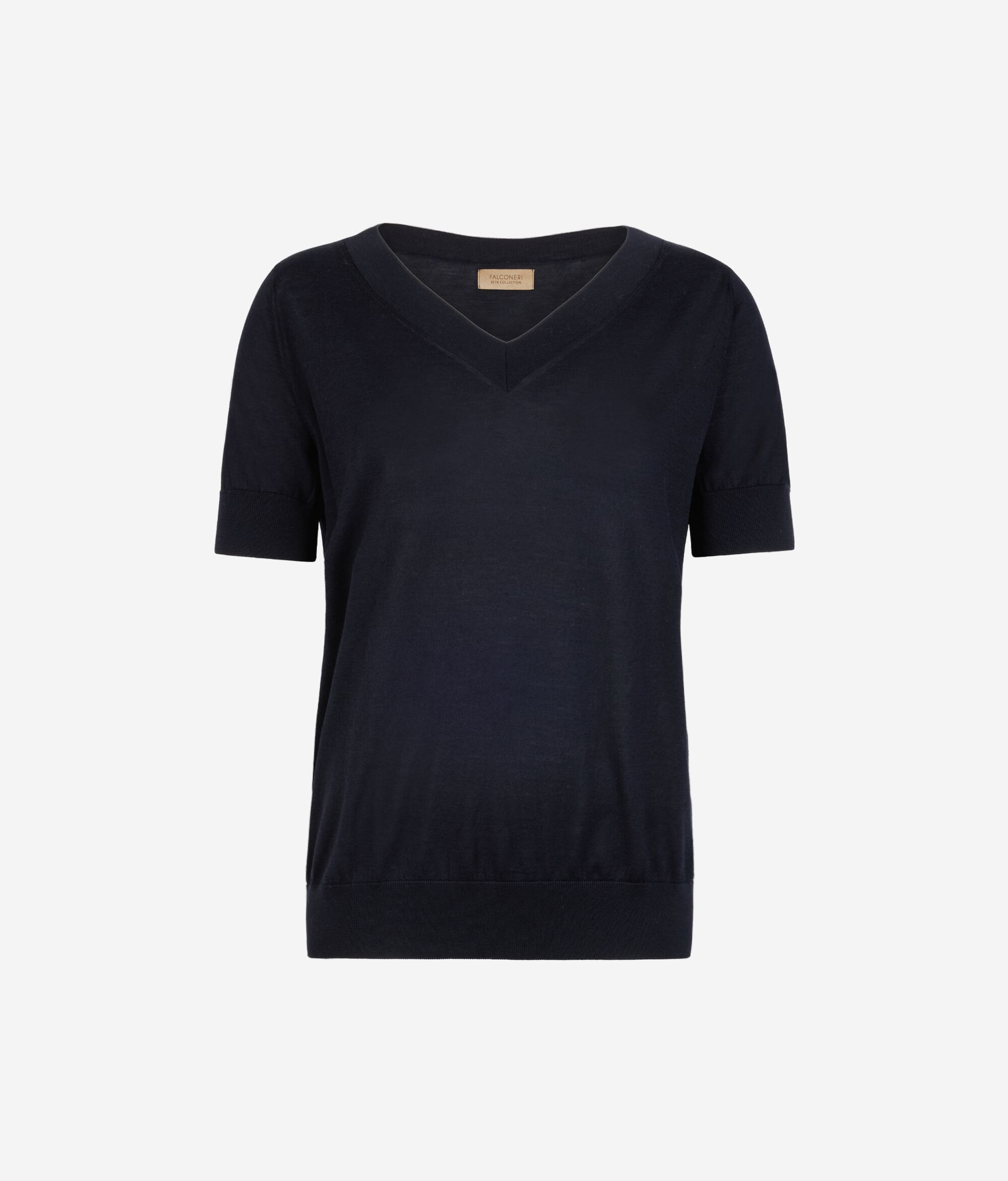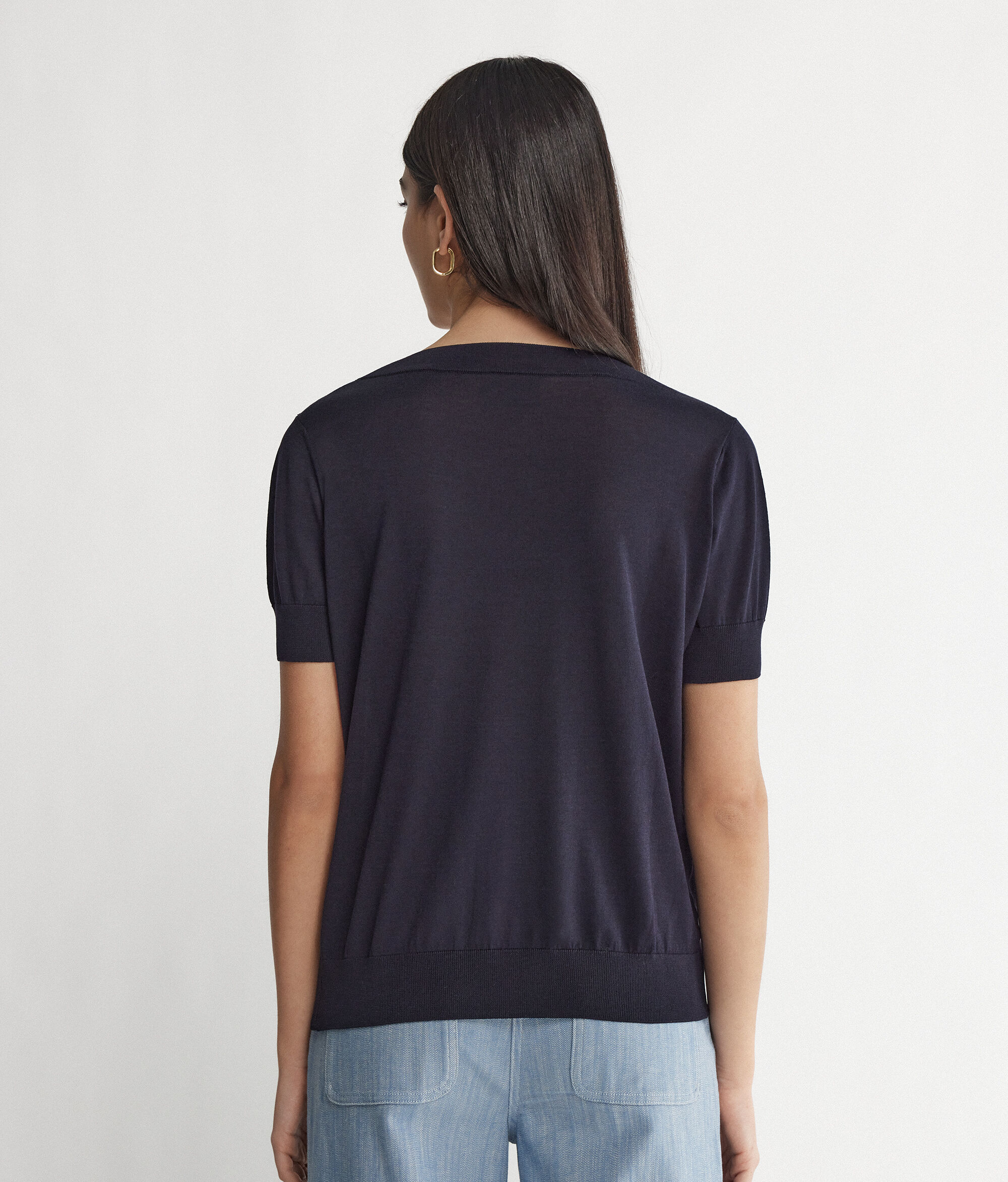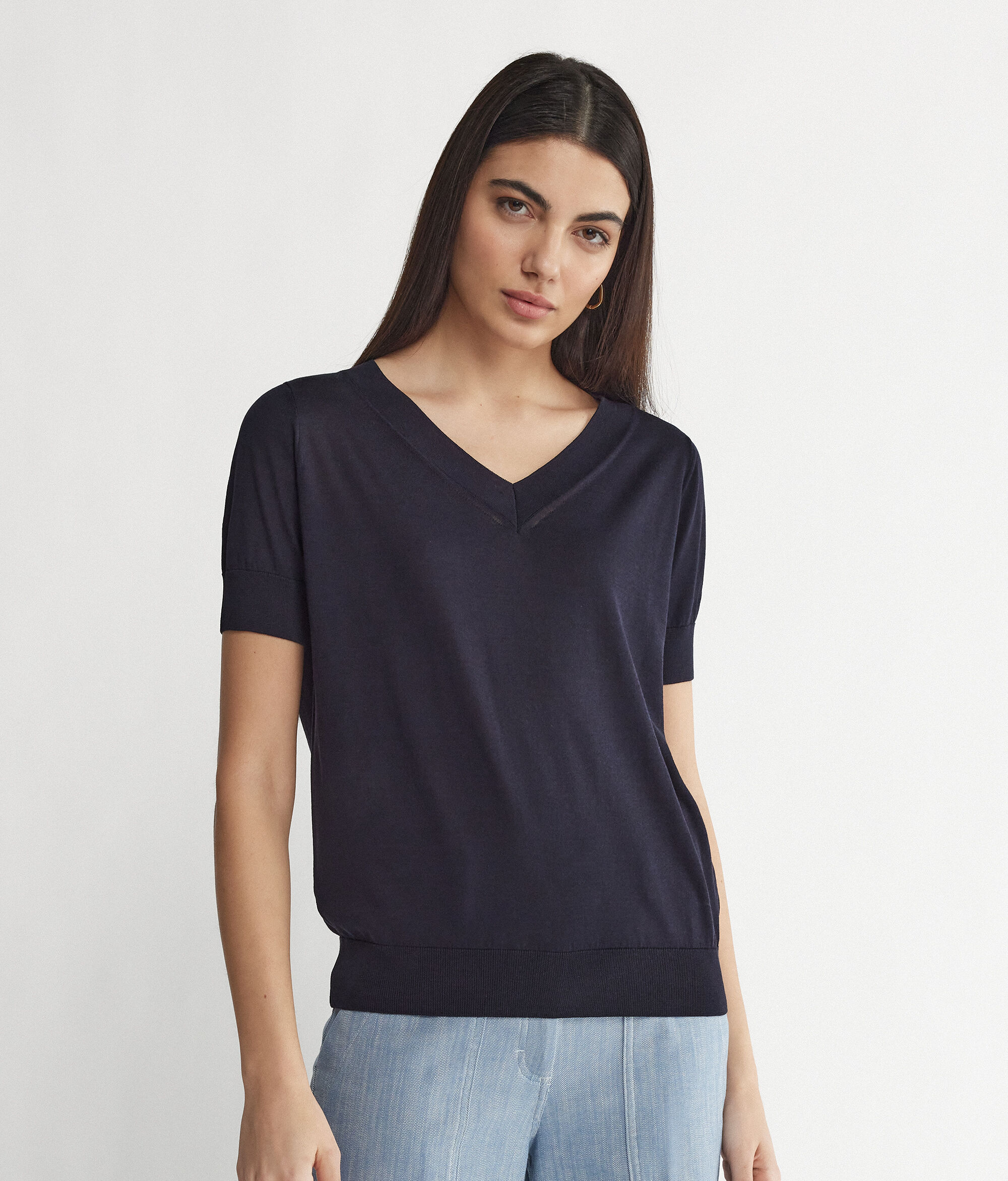 Short-Sleeved V-Neck Silk and Cotton Jumper