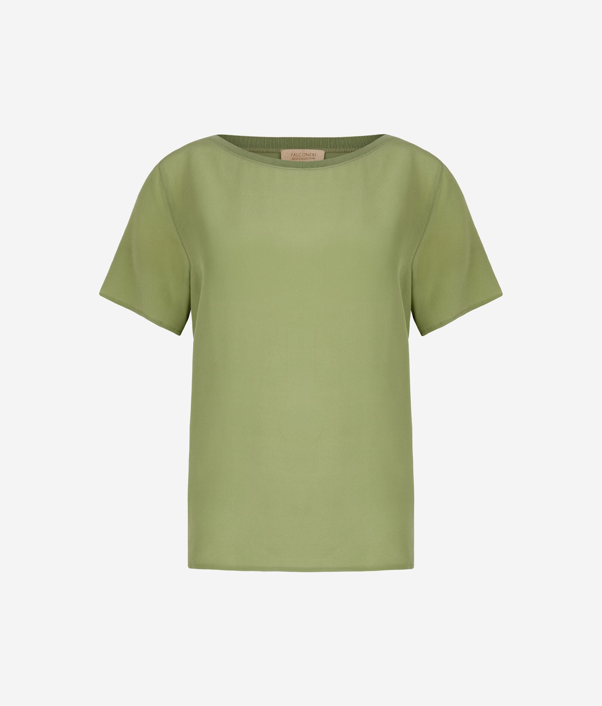 Perfect for wearing on its own or under a jacket, this T-shirt combines refinement and lightness. The crêpe de chine front and sleeves offer a matte texture and fluid drape, while the modal back adds softness and breathability. The boat neckline with ribbed finish completes the garment, creating a clean and sophisticated line.