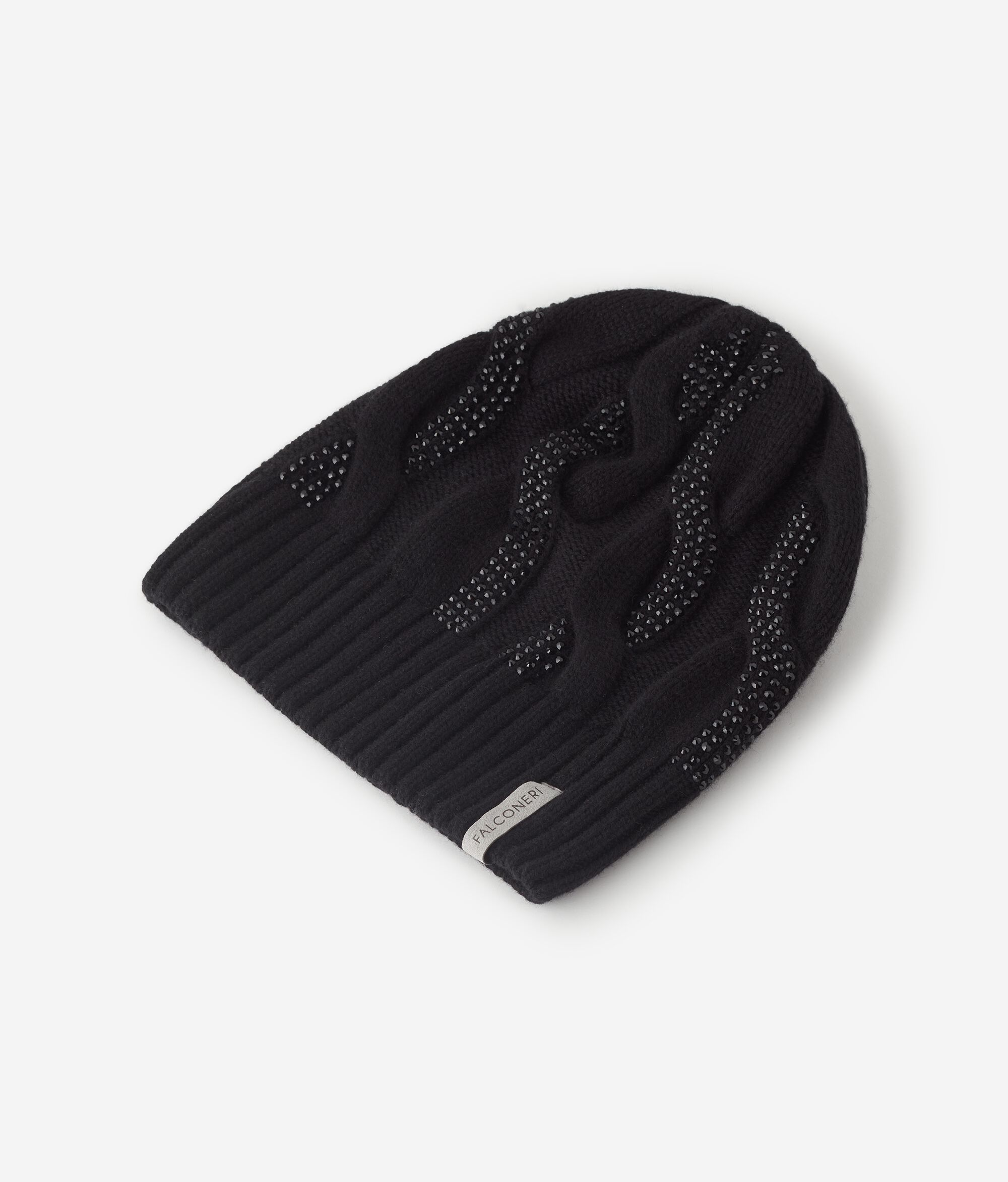 Soft, light and super chic. Crafted from Ultrasoft Cashmere, this hat envelops your head like a warm embrace. The vertical cable knit adds character and movement, while the rhinestones transform an everyday accessory into a luxurious embellishment. The ribbed finish ensures a perfect fit and an urban look, ready to complete city outfits with a touch of contemporary luxury.