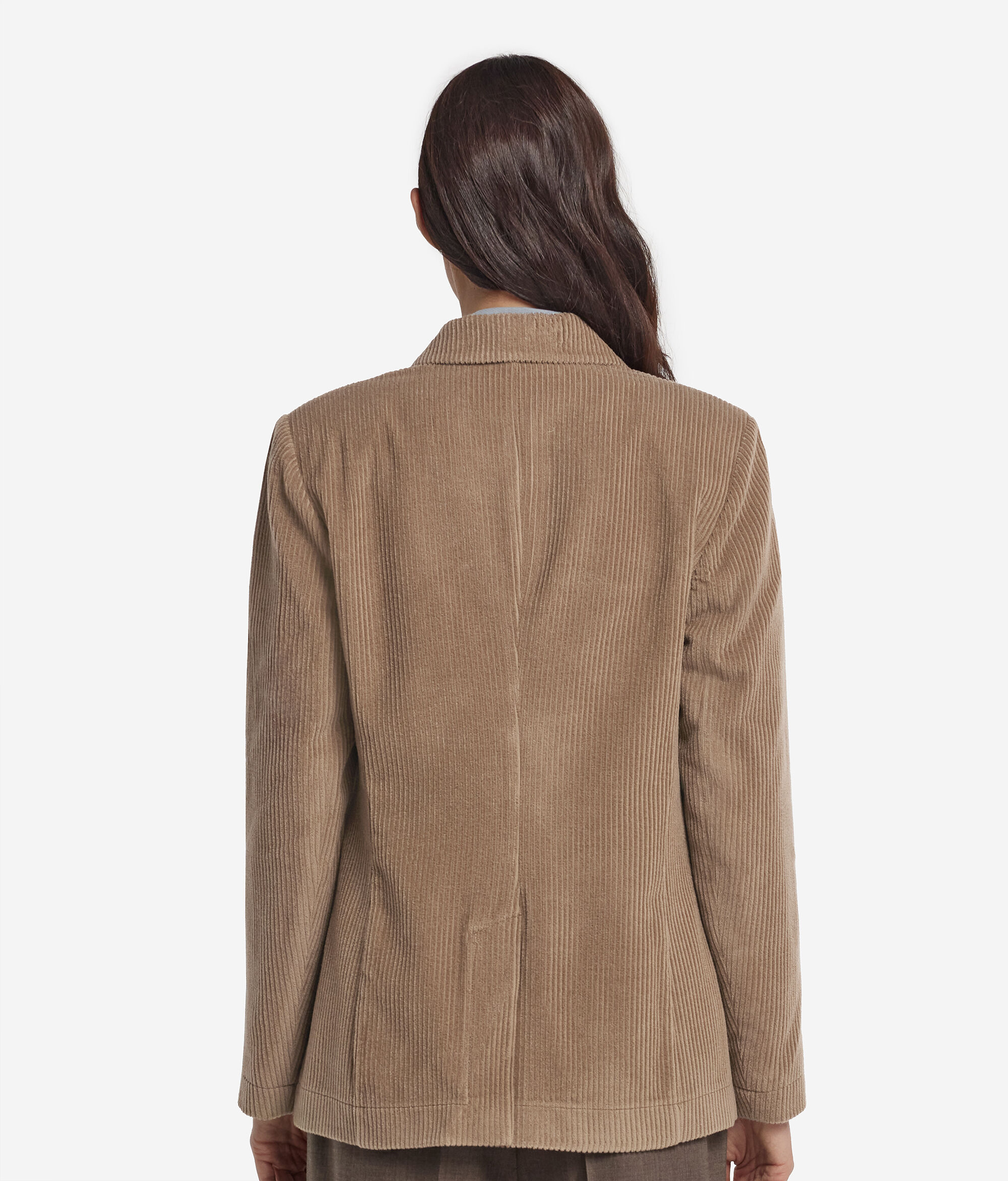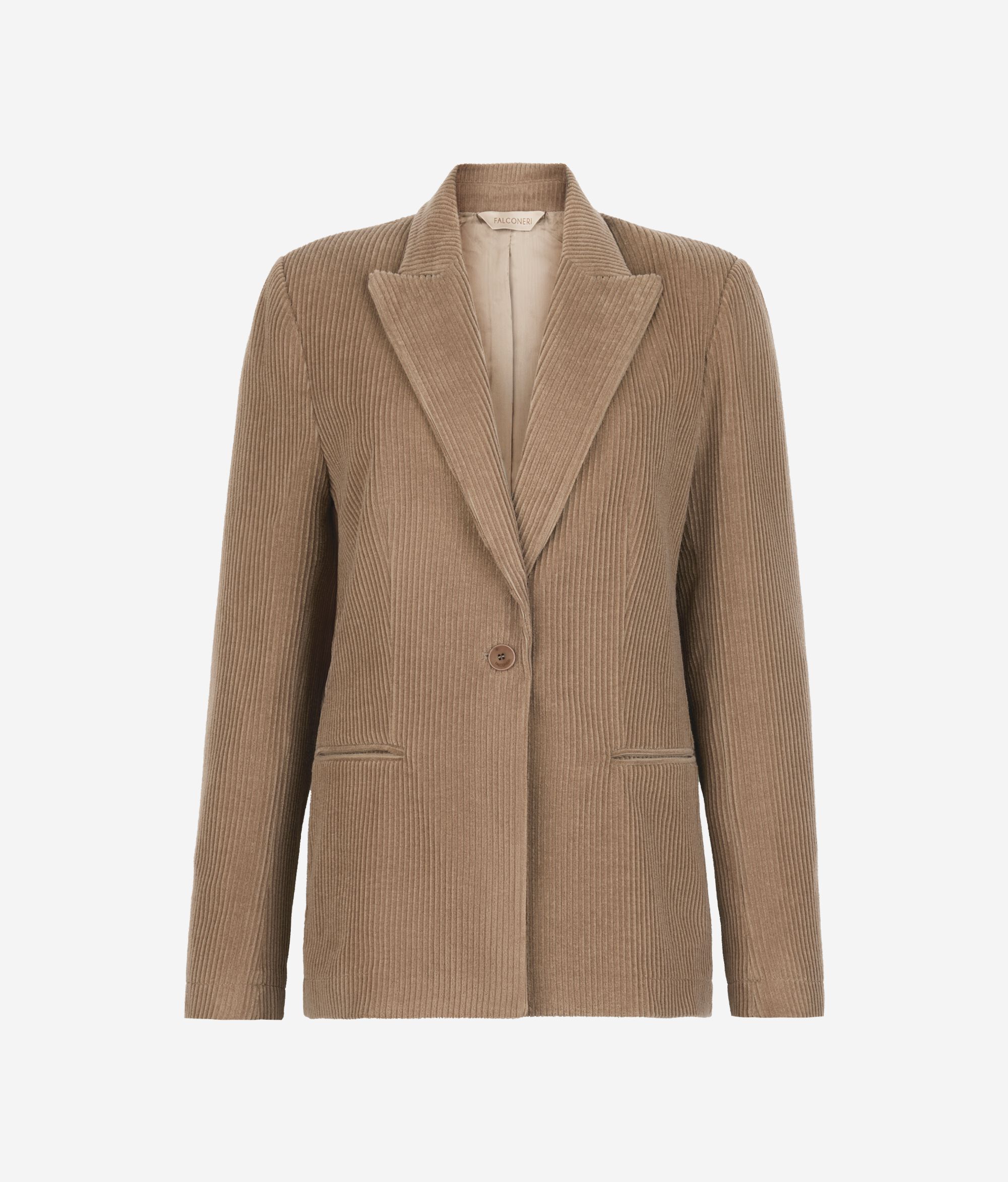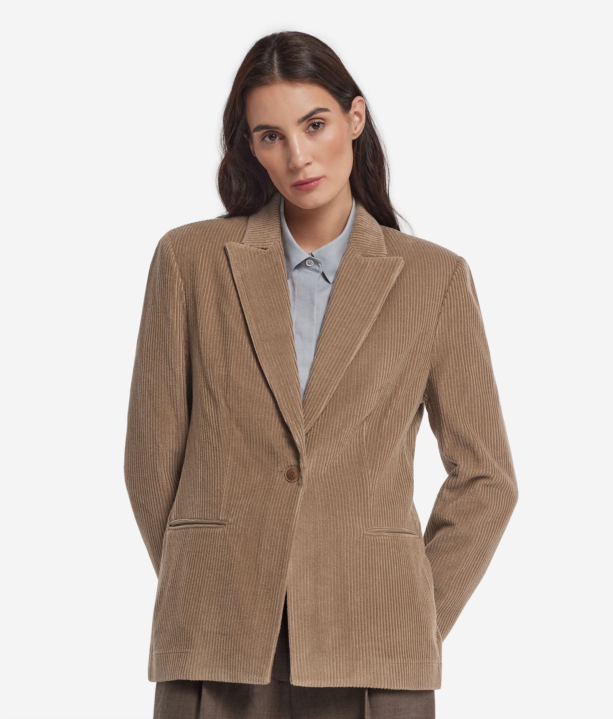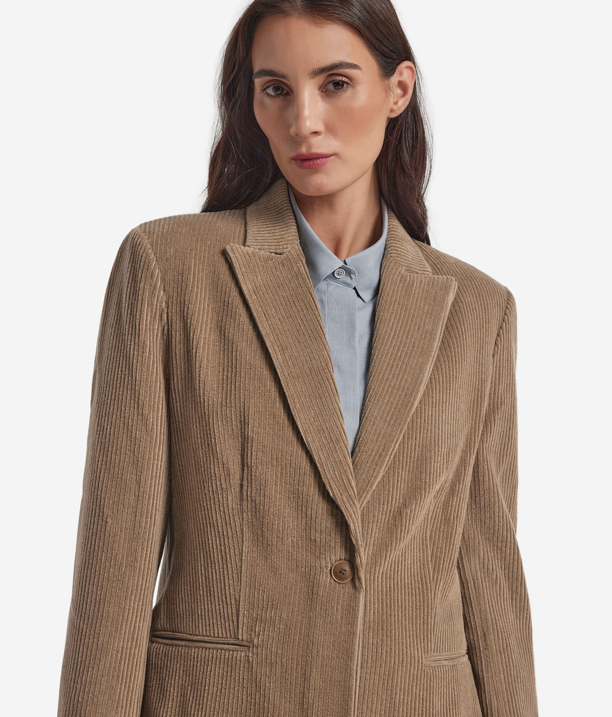 A piece that reinterprets traditional tailoring with contemporary elegance. Made of wool and cashmere velvet, this jacket features a soft, luminous texture that blends warmth with sophistication. Classic lapels and a single-button closure define a sleek, modern silhouette, while welt pockets add a subtle, refined detail.