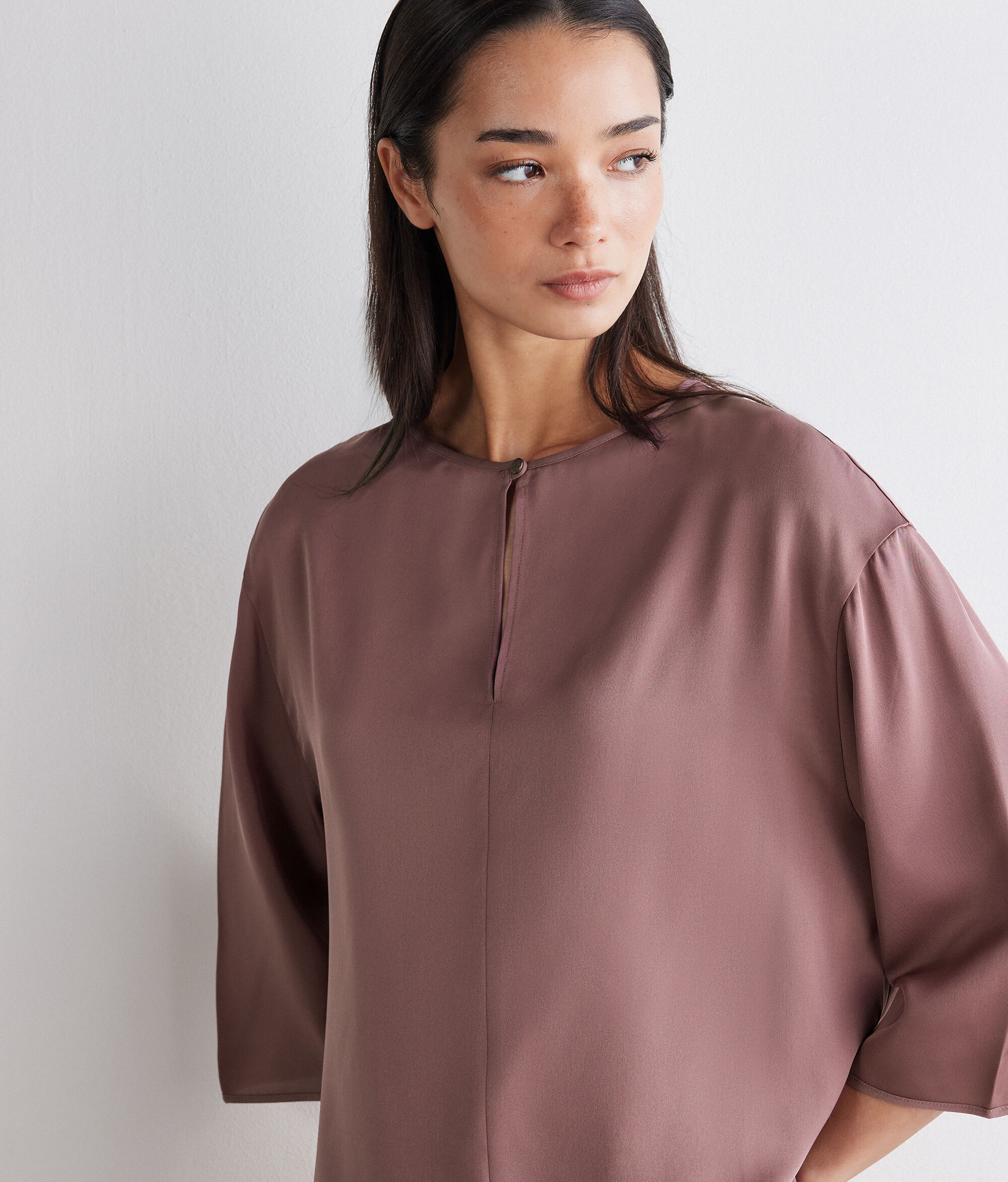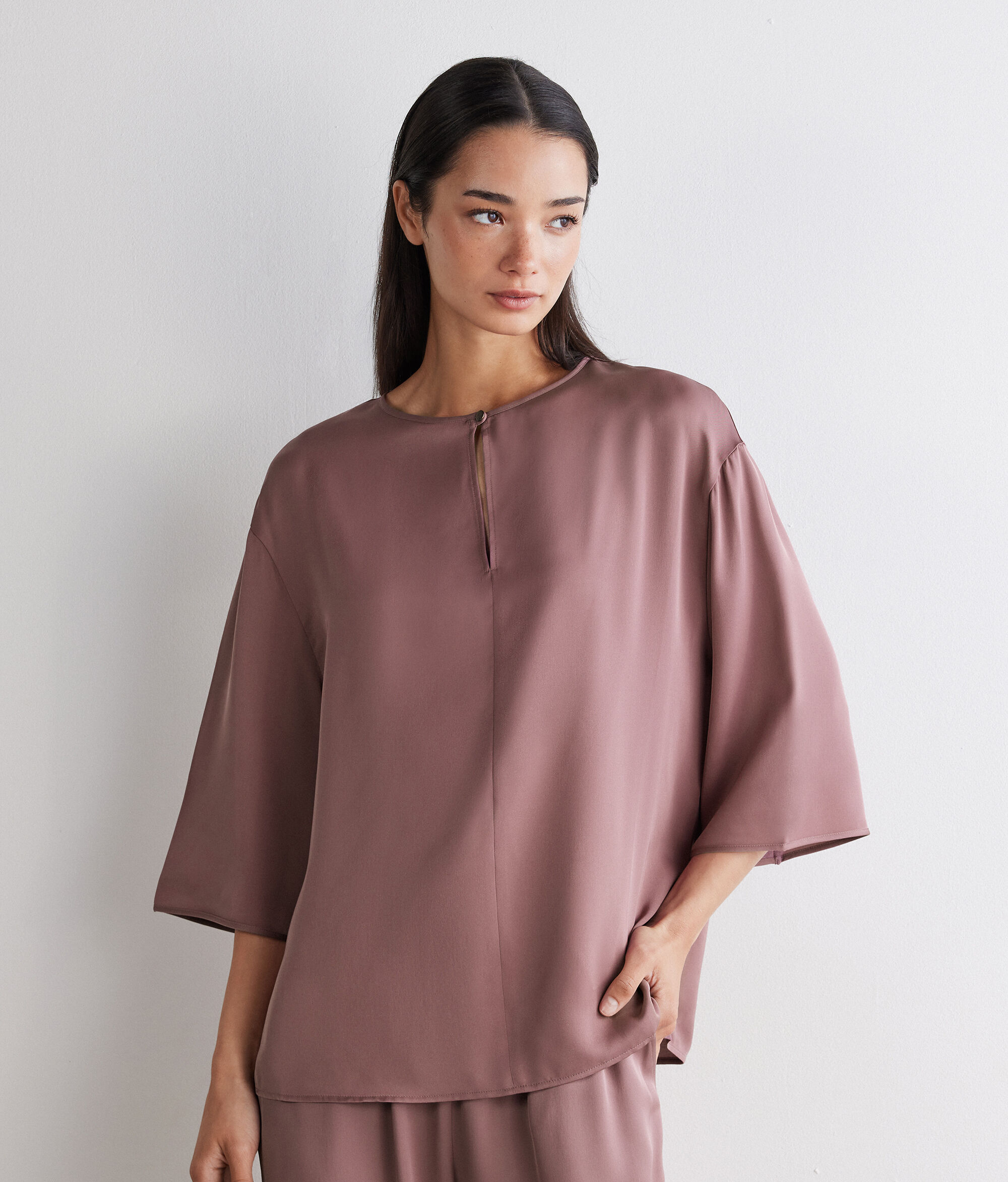Made of matte silk satin, this blouse combines femininity and lightness in a timeless design. Crewneck with a front teardrop opening and metal button adds a refined detail, while the relaxed fit ensures a fluid, natural silhouette.