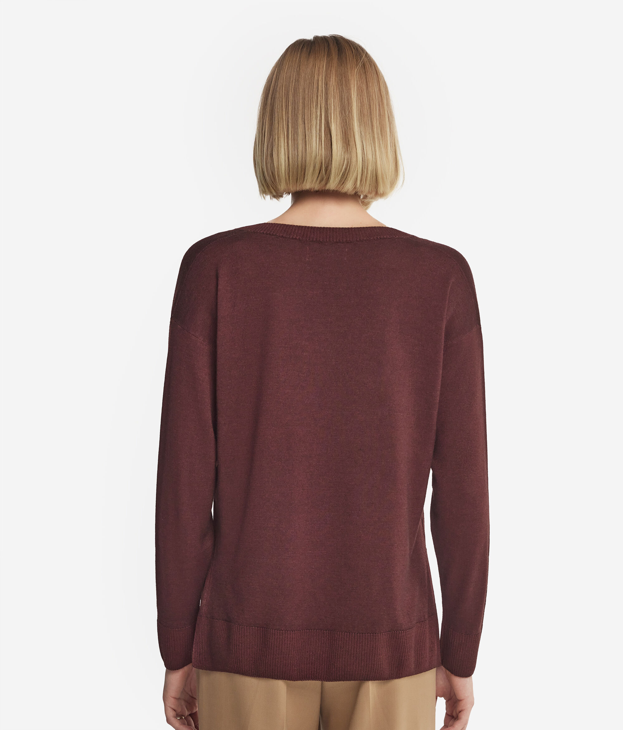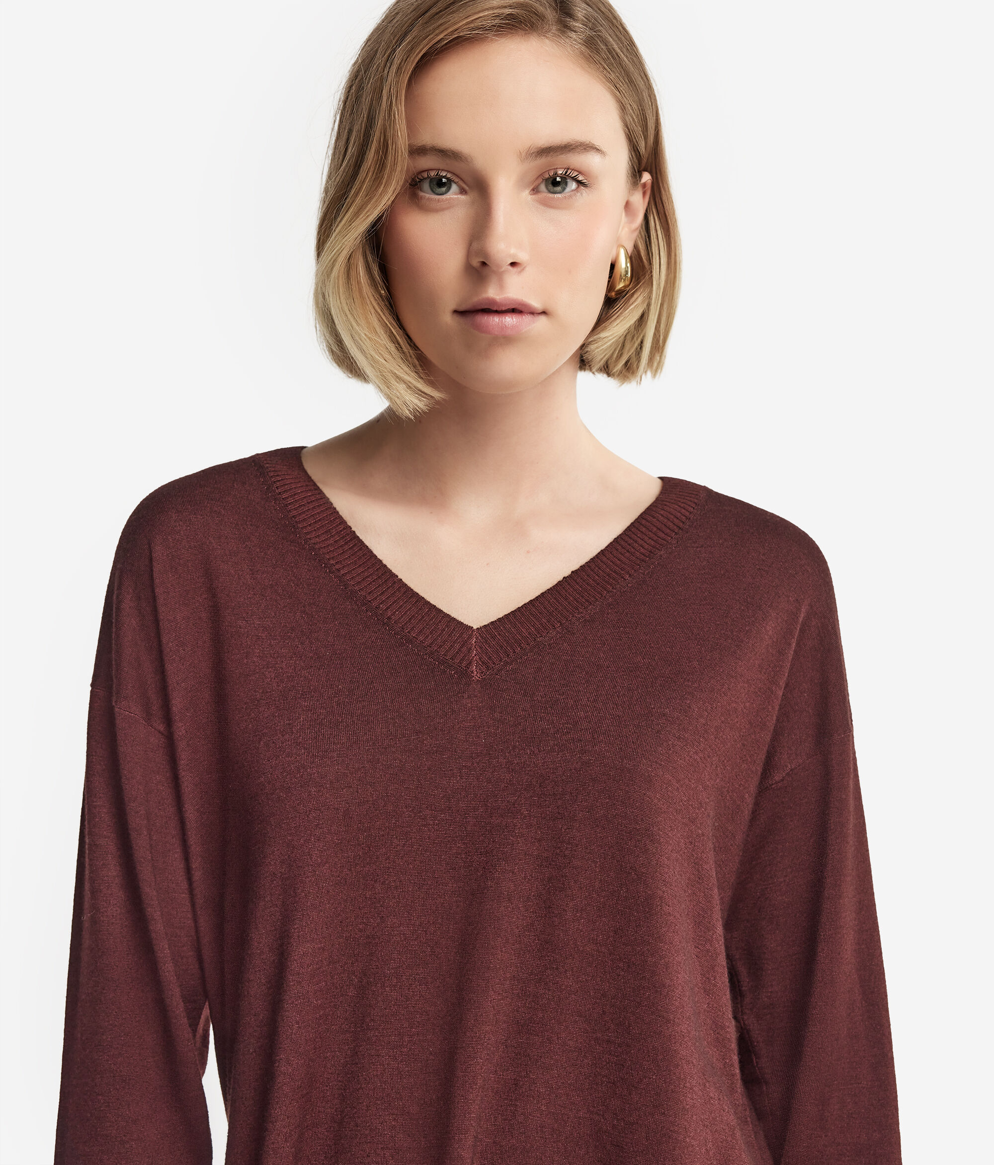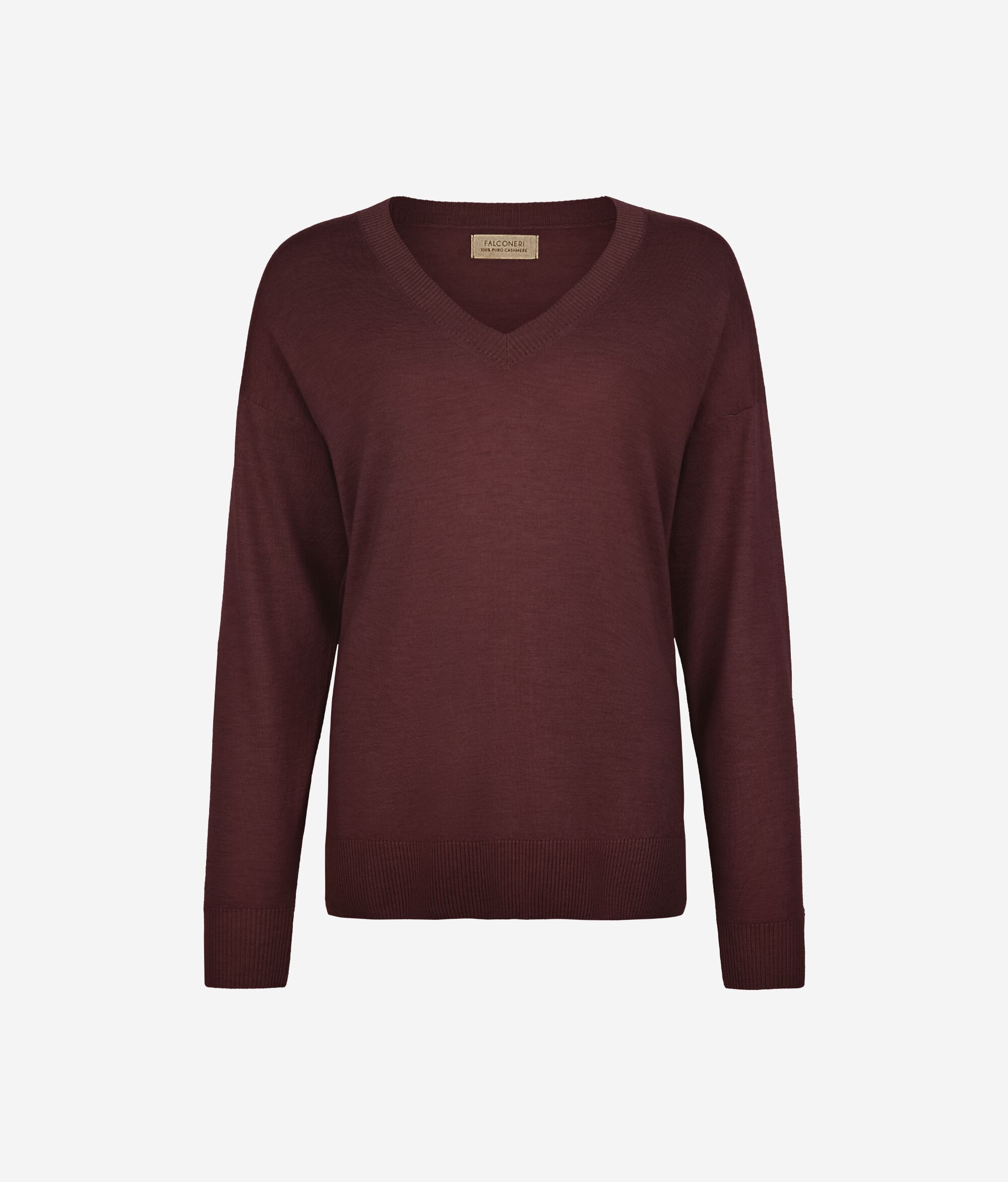 The long-sleeved, ultrafine cashmere V-neck sweater features ribbed details along the collar, cuffs, and hem. This piece is finished off with side slits. The shoulders are slightly dropped and it has a relaxed fit.