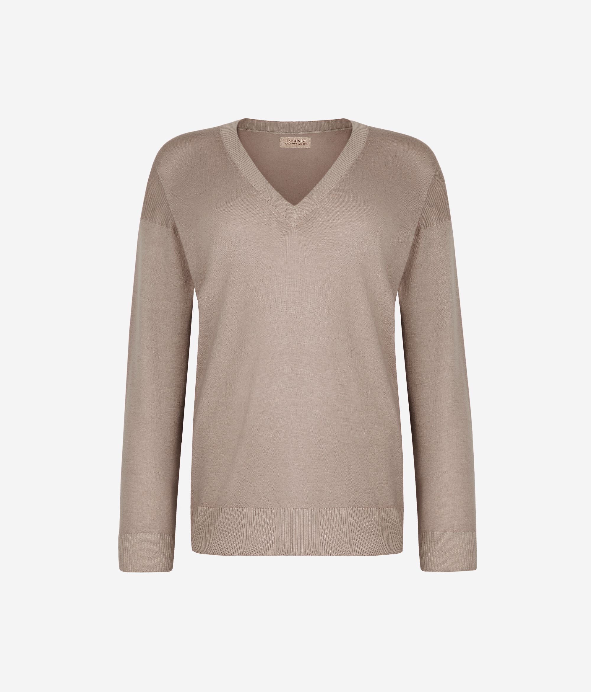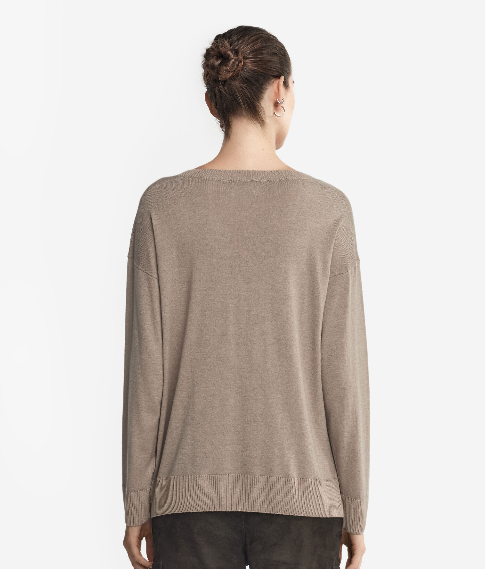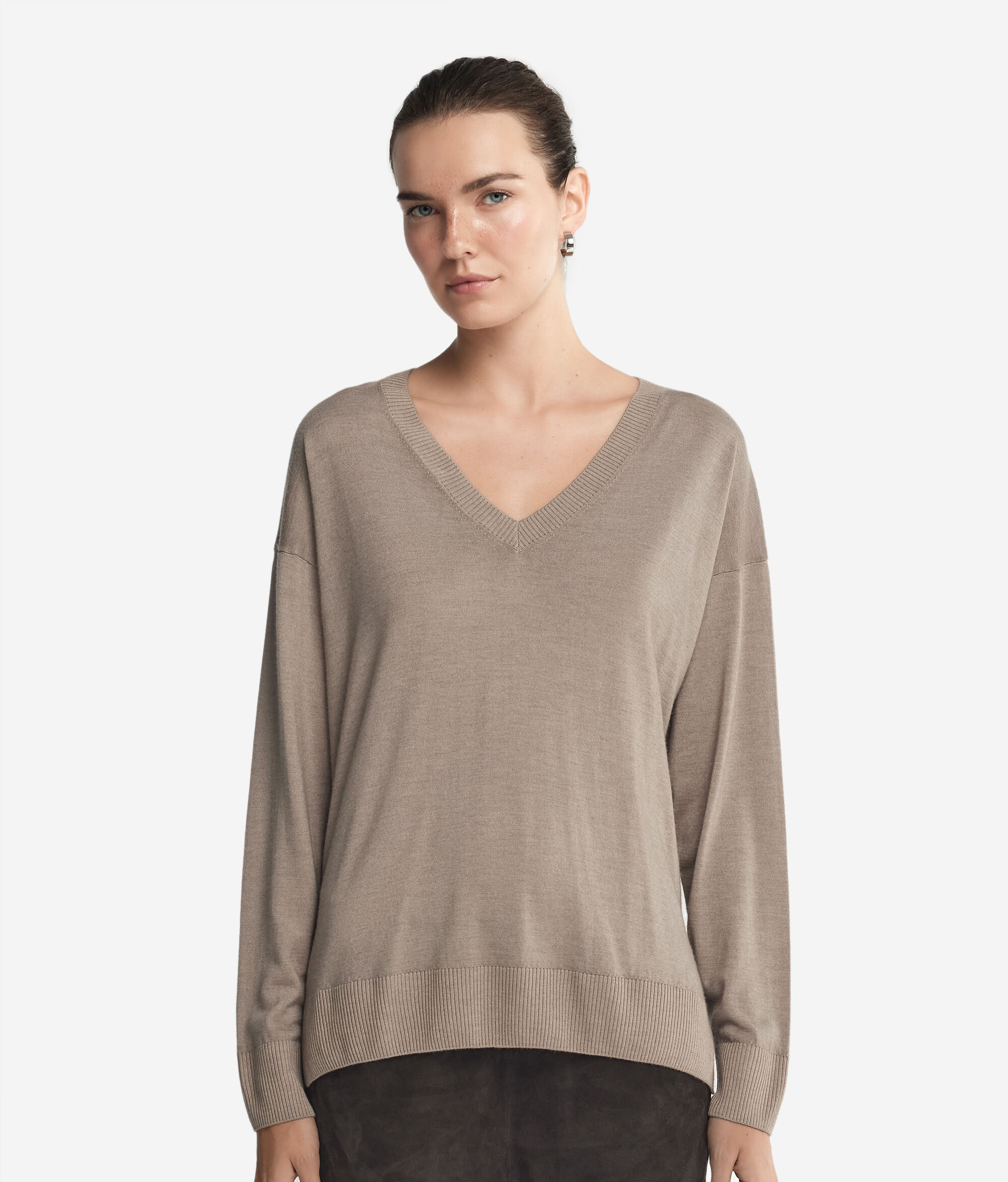 The long-sleeved, ultrafine cashmere V-neck sweater features ribbed details along the collar, cuffs, and hem. This piece is finished off with side slits. The shoulders are slightly dropped and it has a relaxed fit.