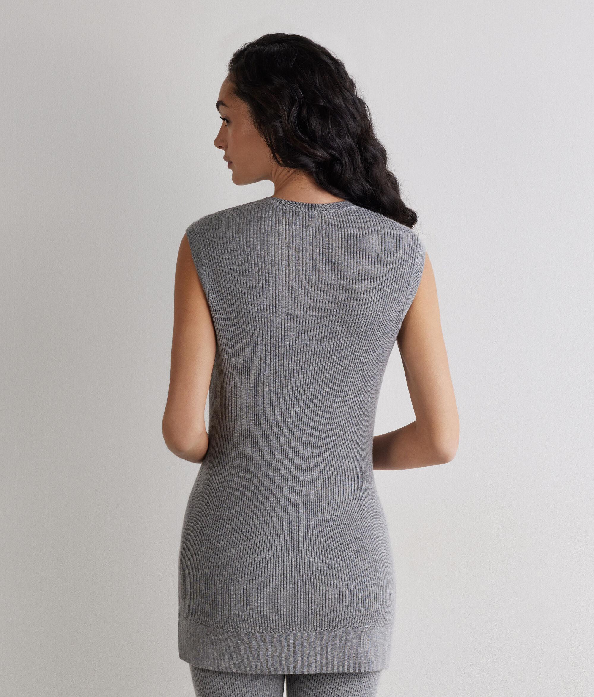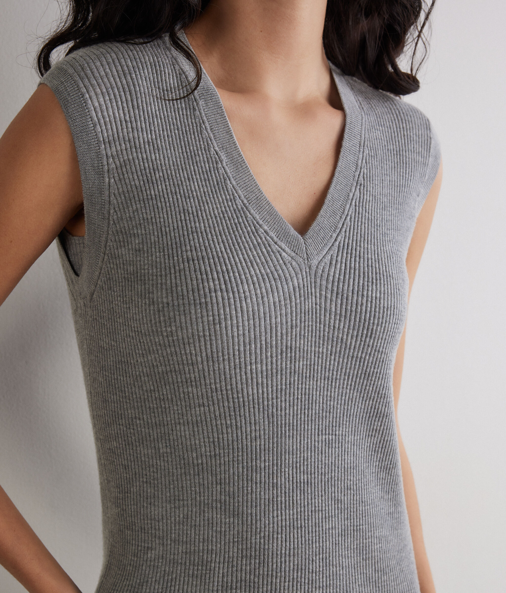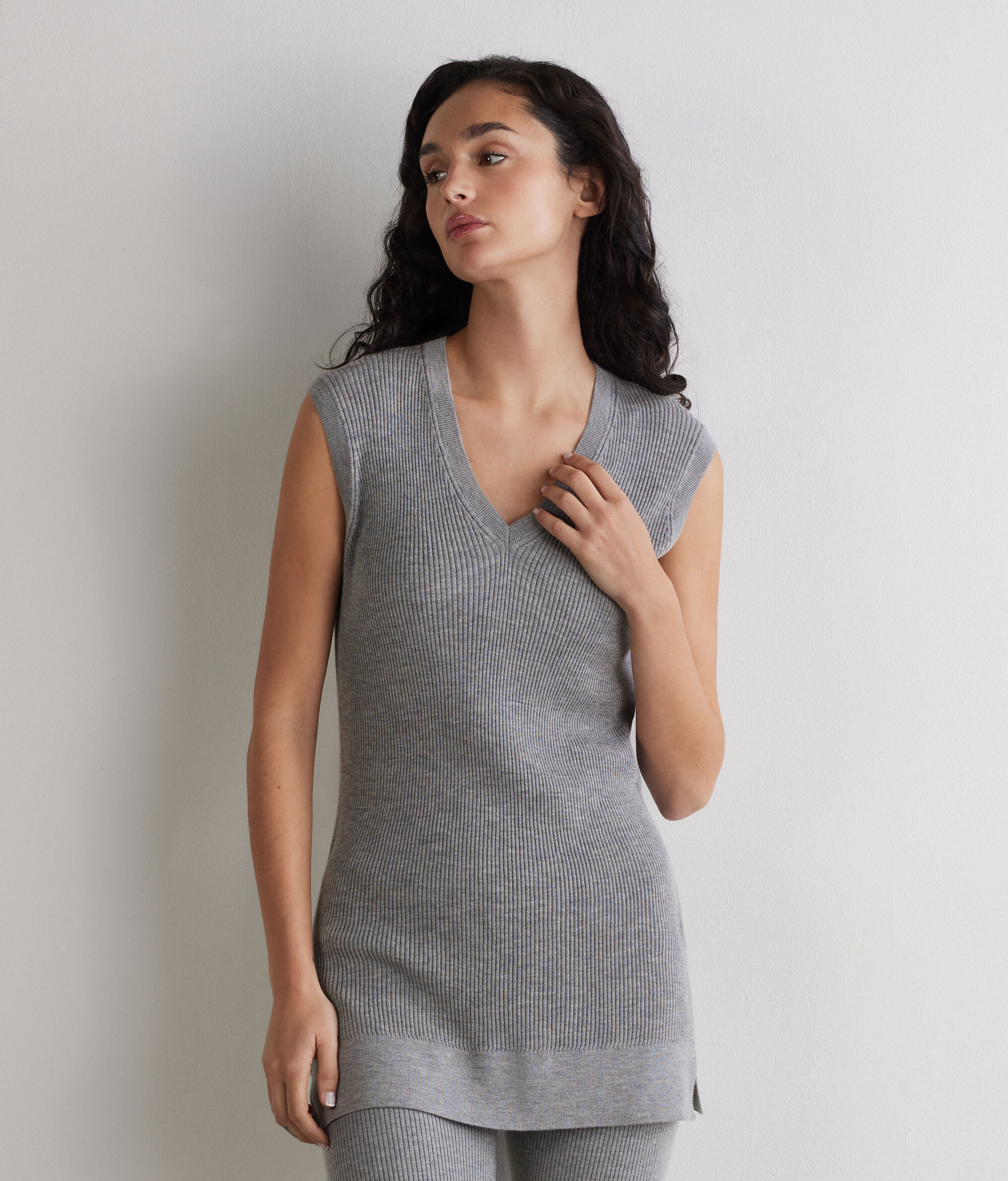 Ultrafine Cashmere vest, soft and comfortable, characterized by refined and essential lines. The V-neck and wide shoulder wrap the body naturally, while the slit at the bottom and length below the hips enhance the silhouette. Ribbed finishes on the neckline, armholes, and hem complete the design, making the piece ideal for layering and minimal, structured looks.