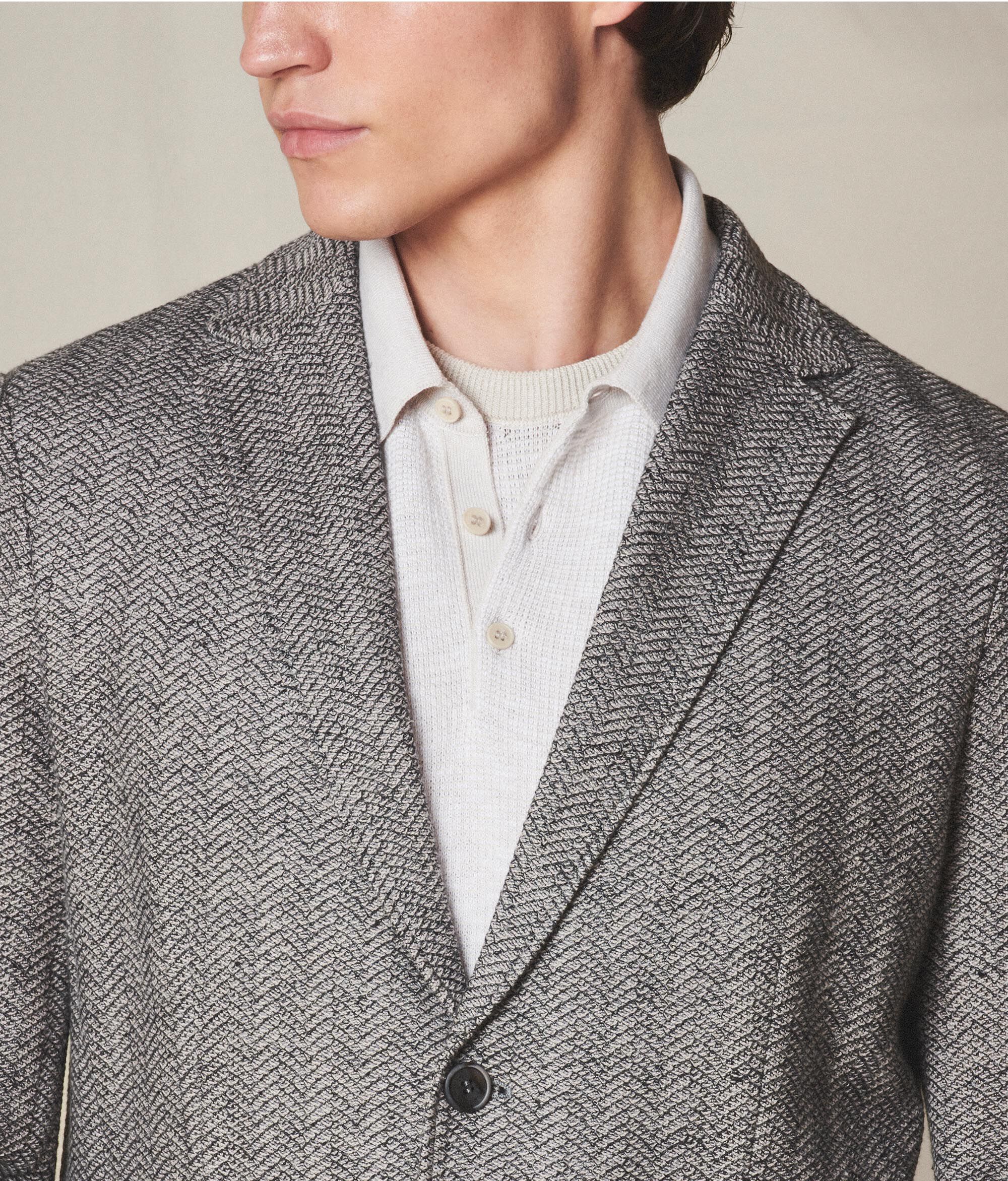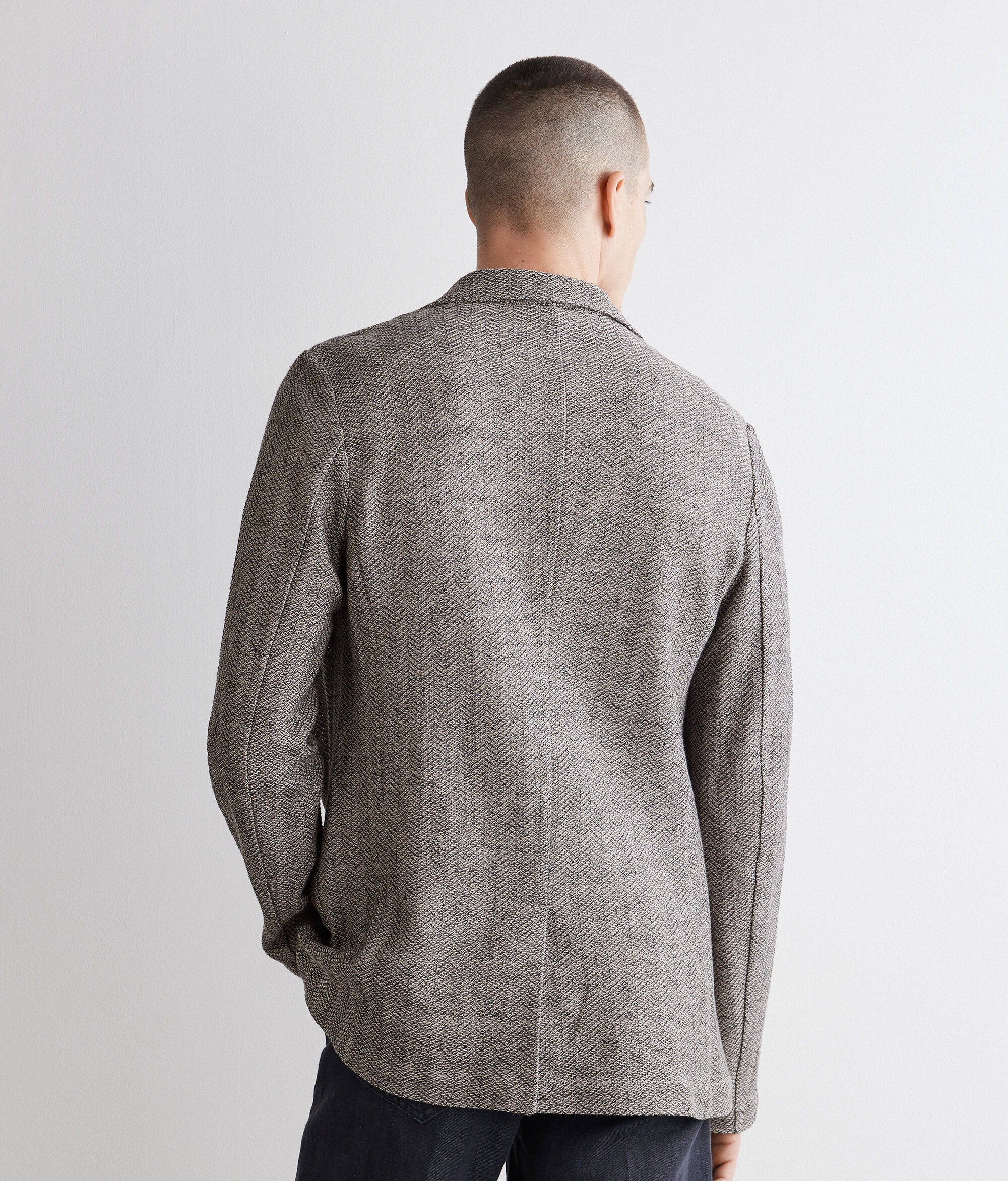 Linen and cotton jersey jacket with a refined herringbone texture, classic lapel collar and single-breasted two button fastener. Front patch pockets and an inside pocket combine style and functionality, while the fitted sleeves with a slit at the back ensure an elegant fit. The central back slit completes the piece, offering a regular fit.