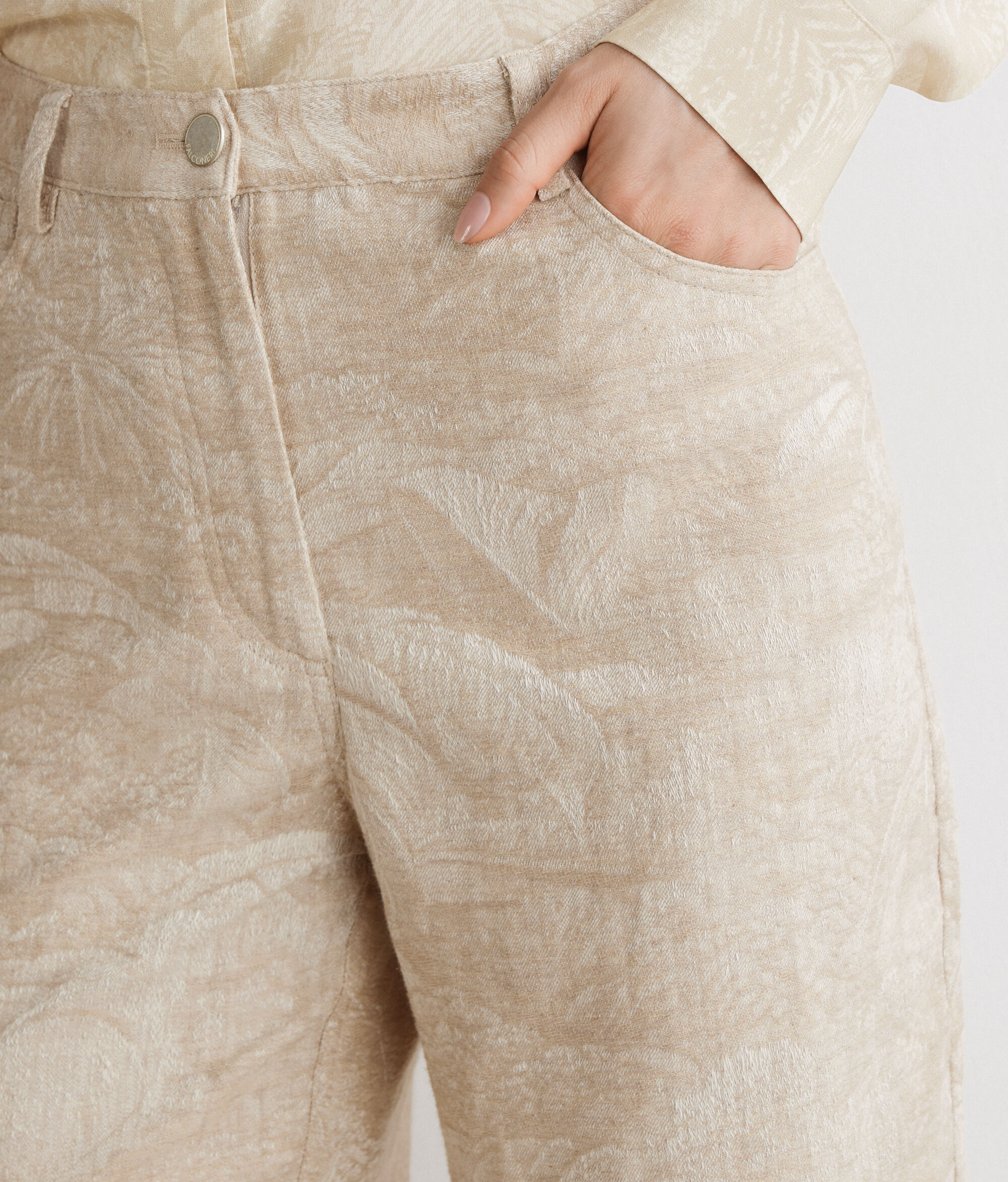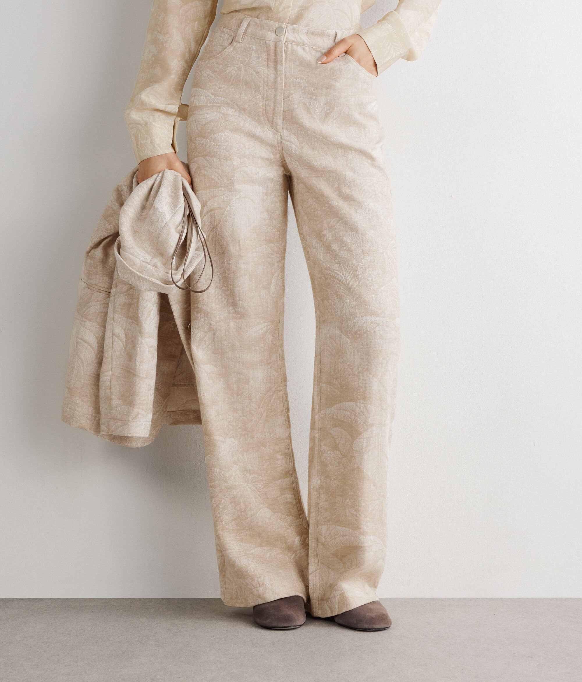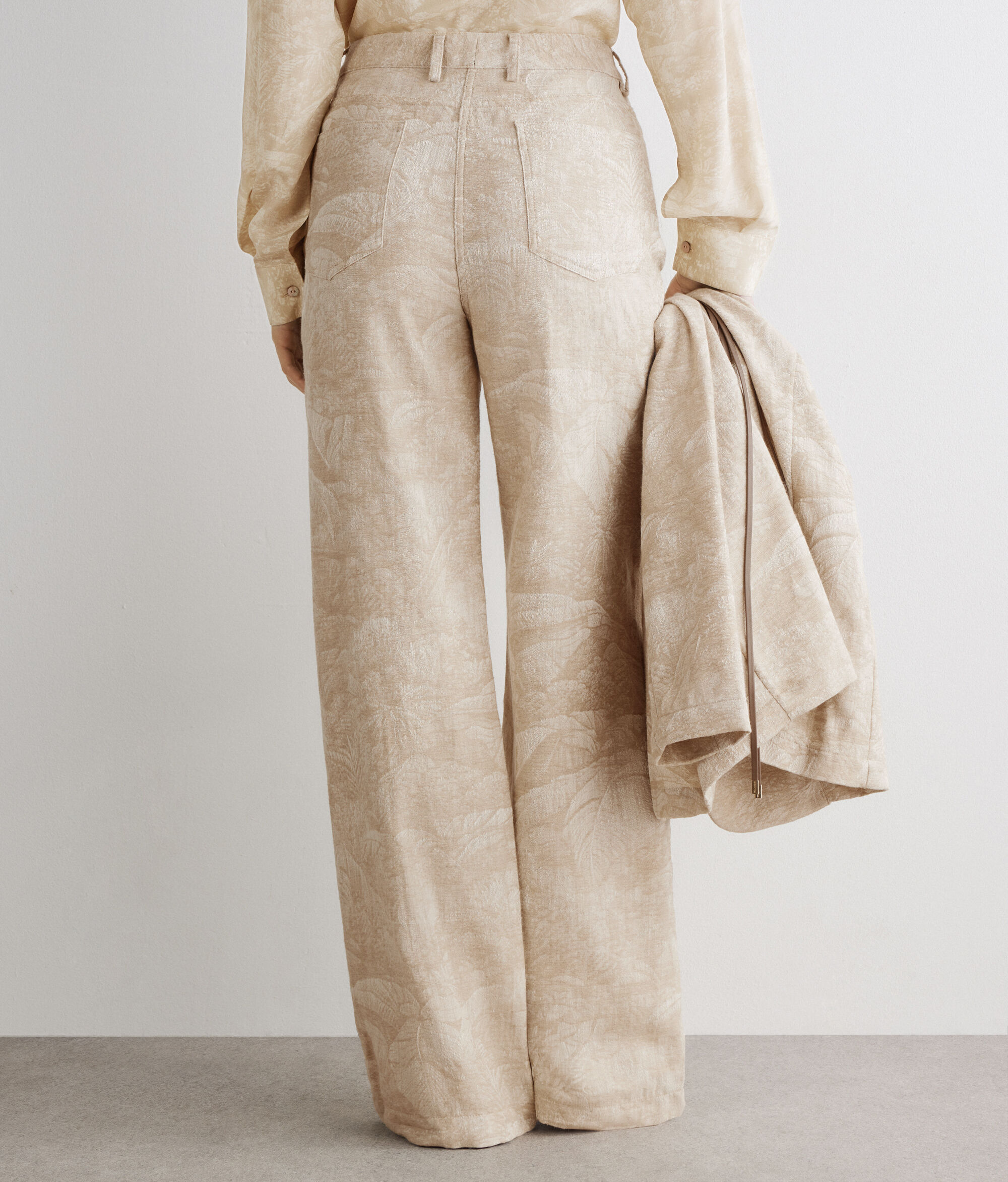 Cotton jacquard palazzo pants featuring a sophisticated character and sought-out texture. The wide, flowing line is completed by a waistband with belt loops and a zipper, flap and metal button fastener. The five pocket model combines functionality and tailored details for contemporary and exclusive looks.
