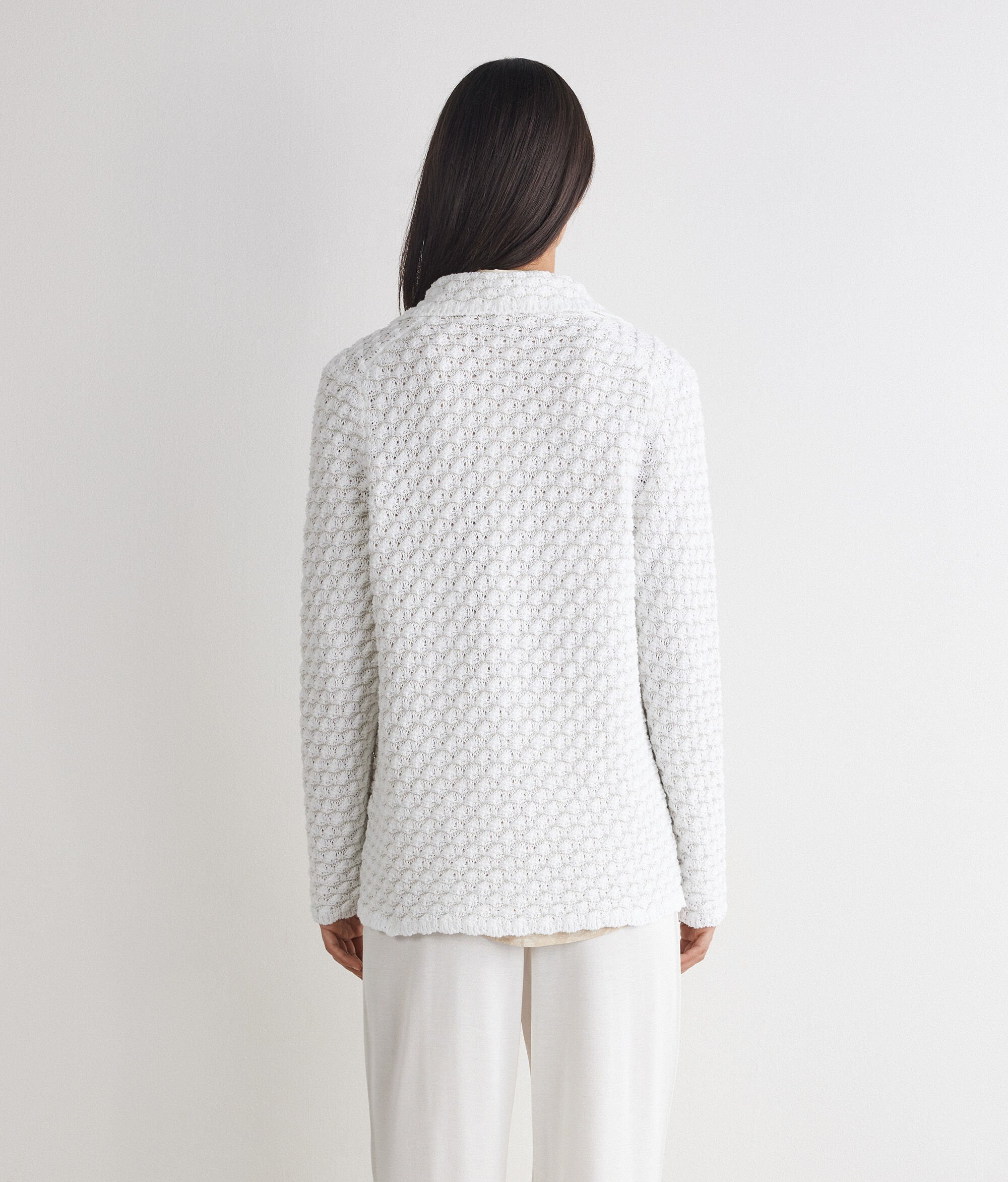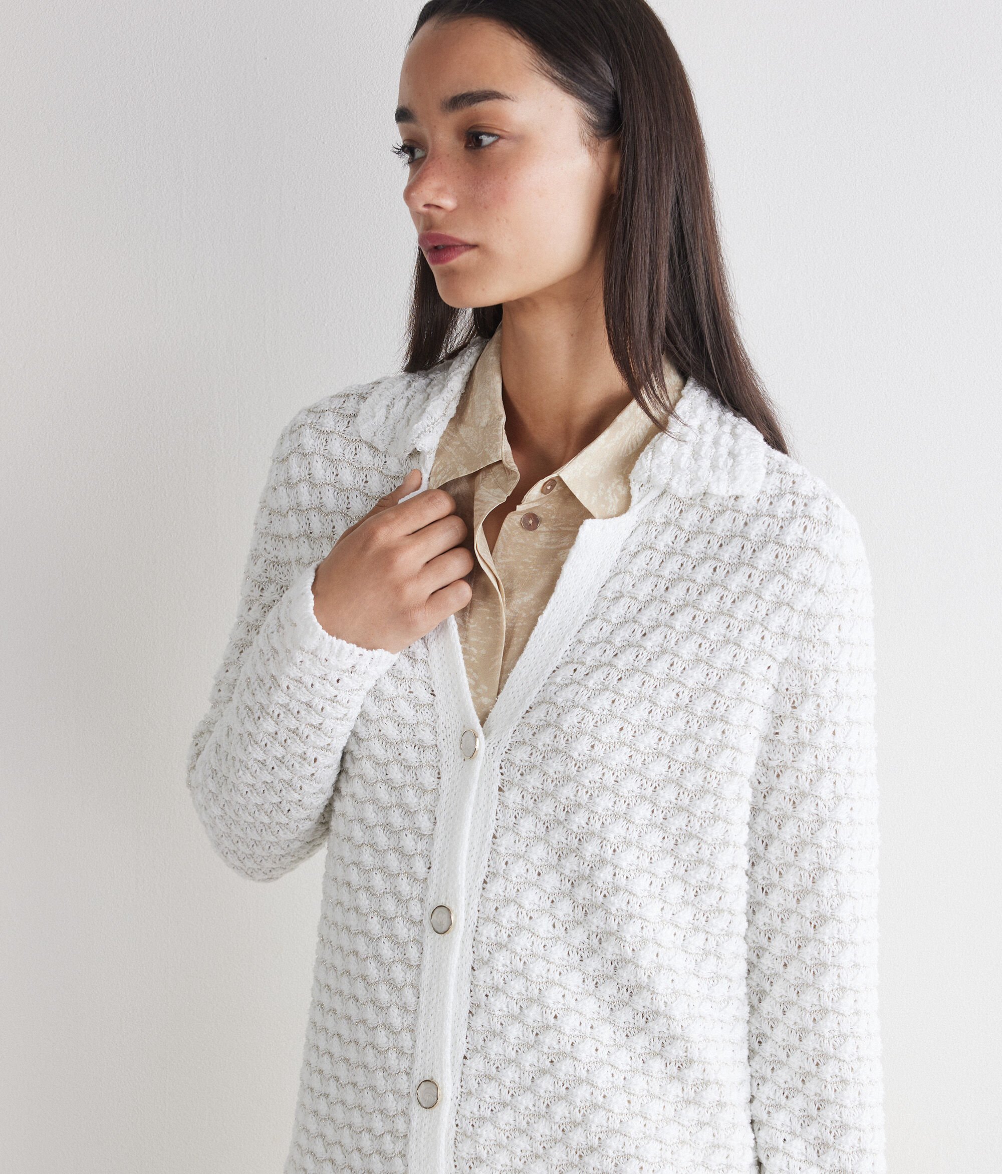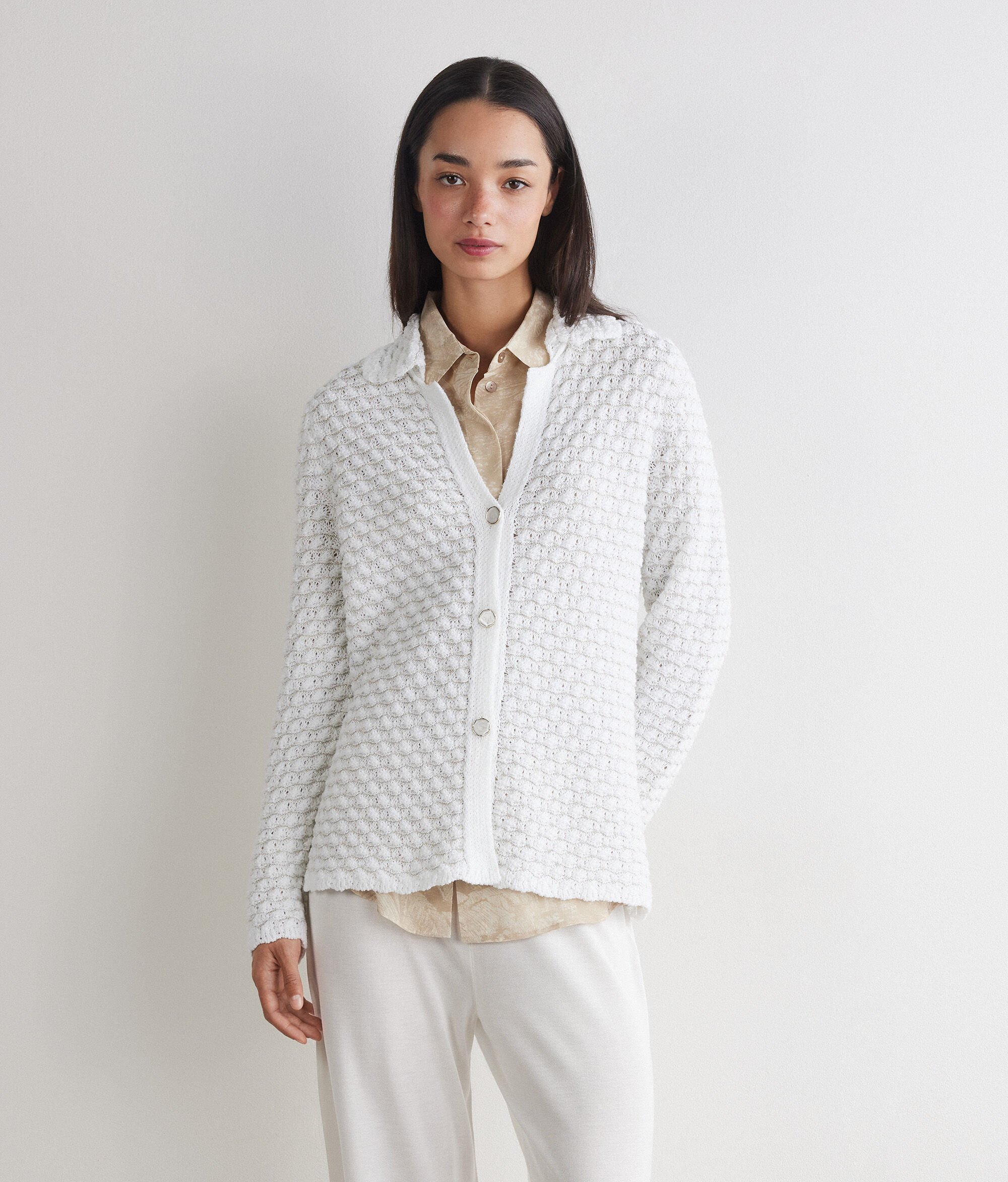 Jacket made of cotton knit, enhanced with lamé yarn (100% cotton). The shell stitch workmanship and the fastener with enameled metal buttons enhance the regular fit design.