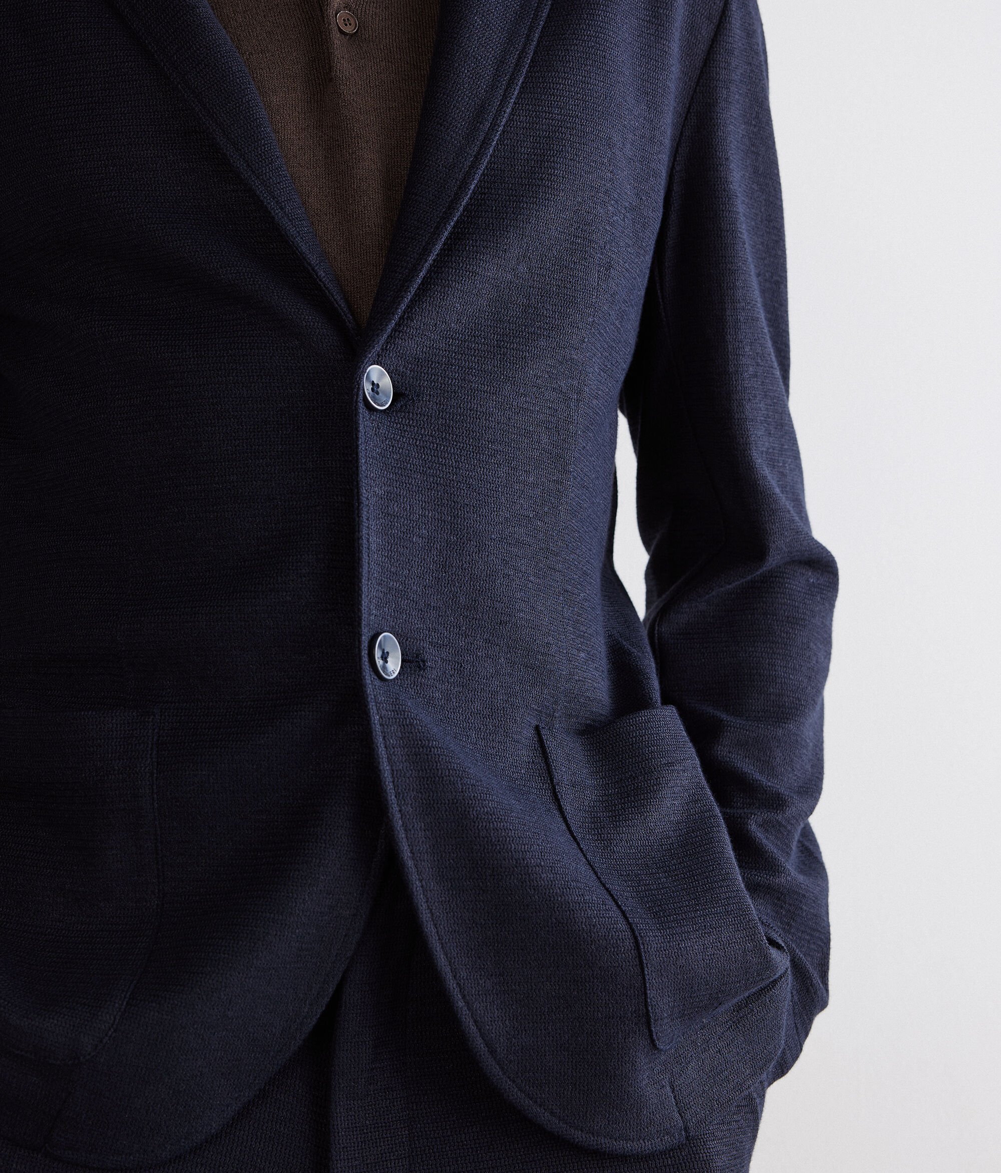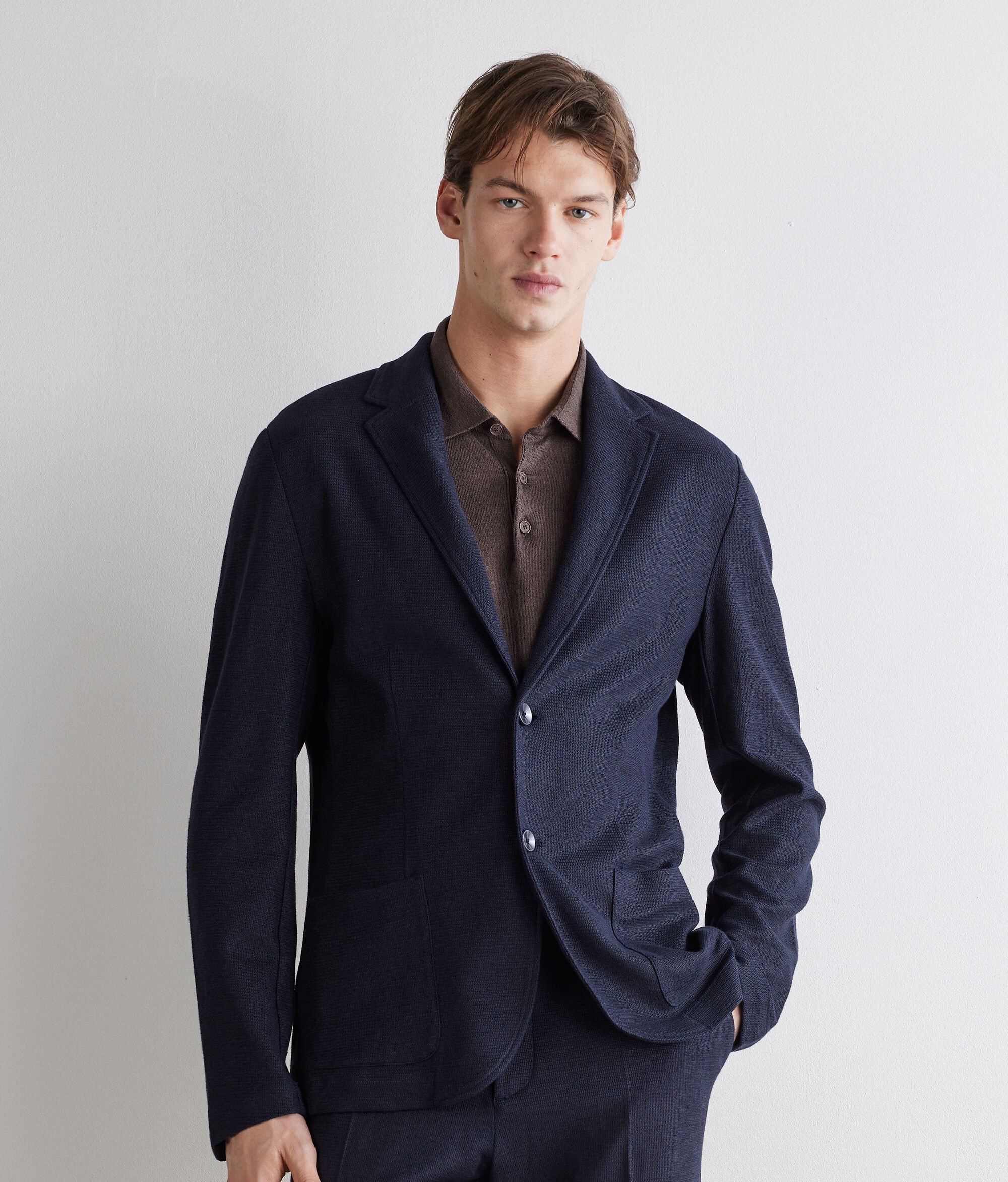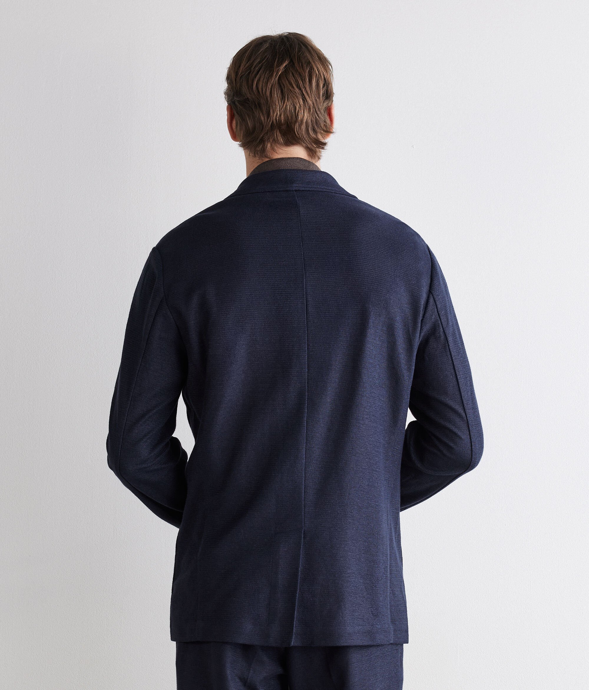 Made of premium linen and cotton waffle fabric, this jacket combines sophisticated texture and contemporary design. The classic lapel and single-breasted two-button fastener underline its timeless elegance, while the patch pockets and central slit on the back complete a regular and refined silhouette.