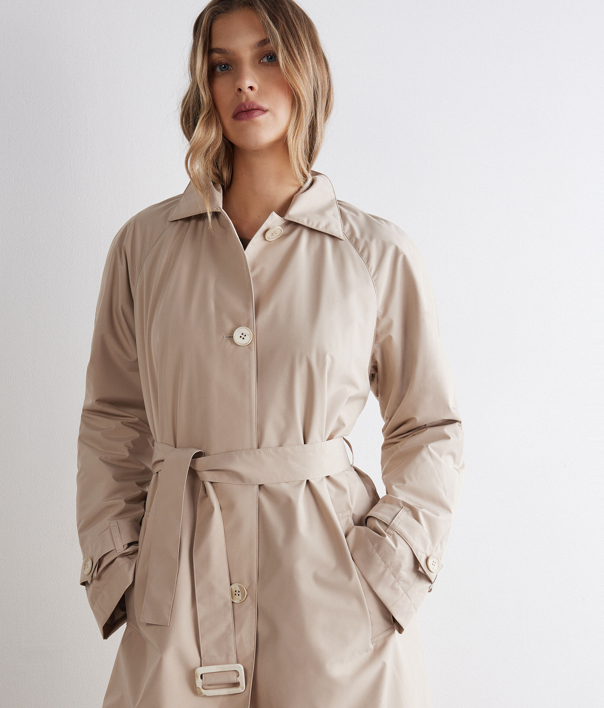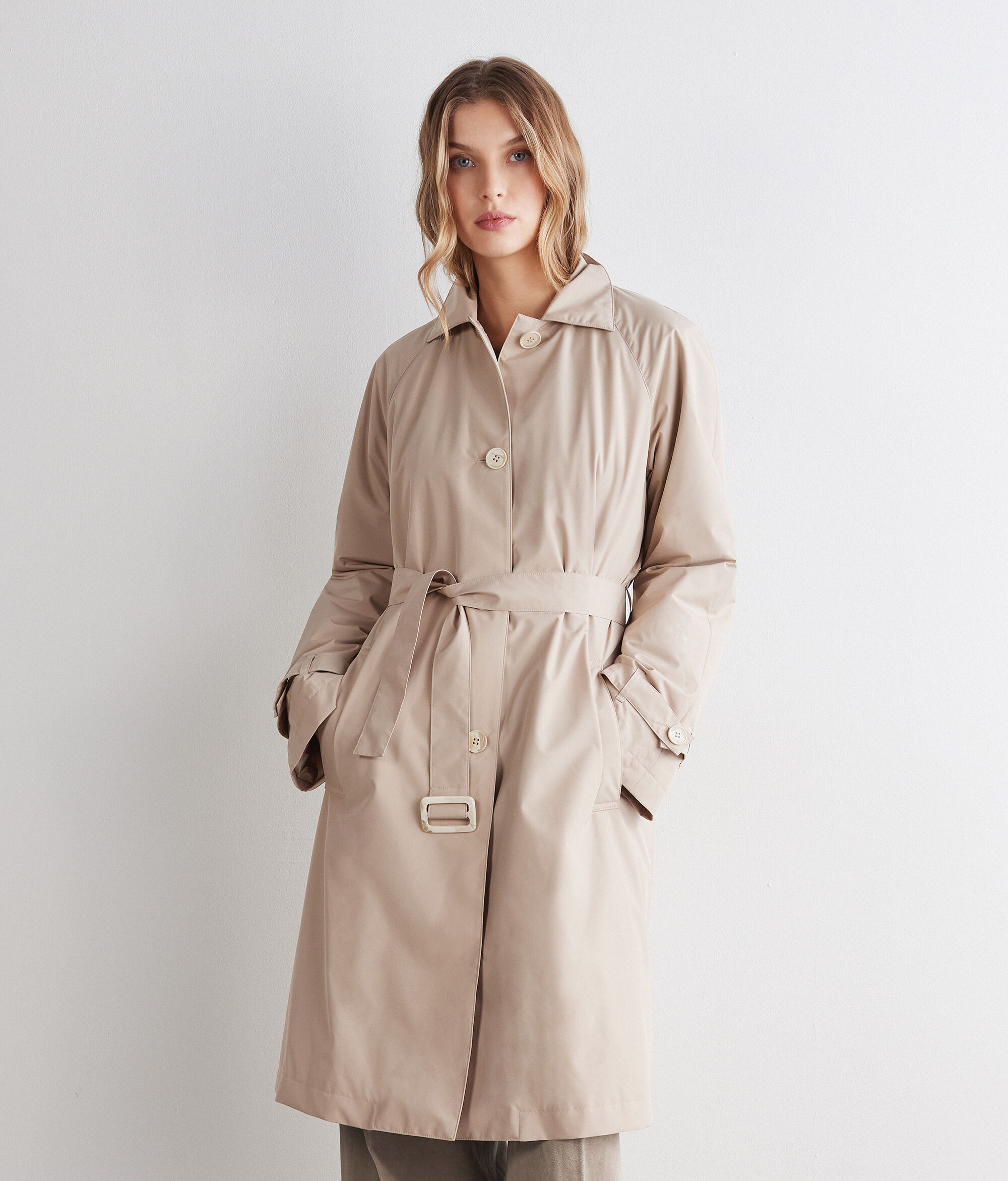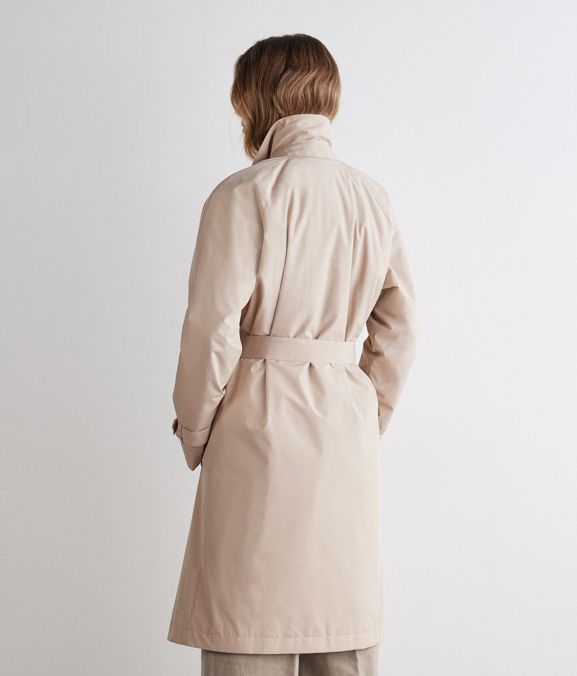 This Cashmere trench coat brings together modern structure and luxurious texture, reinterpreting a timeless outerwear staple with quiet elegance. Raglan sleeves with adjustable straps offer easy movement and a more relaxed drape, while the classic collar and four-button closure lend structure and polish. Together, these details shape a flattering silhouette that layers effortlessly over everyday looks. The buckled belt and side loops let you cinch the waist for a more defined fit, while welt pockets provide subtle functionality. Inside, the full cashmere lining delivers exceptional softness and warmth, complemented by a layer of cotton padding for added comfort on colder days—making this technical trench coat an effortless choice from weekday dressing to weekend layering. Pair it with muted tones for a clean, tonal look, or use printed accessories to bring a subtle vibrant lift that echoes the style of this floral trench coat.