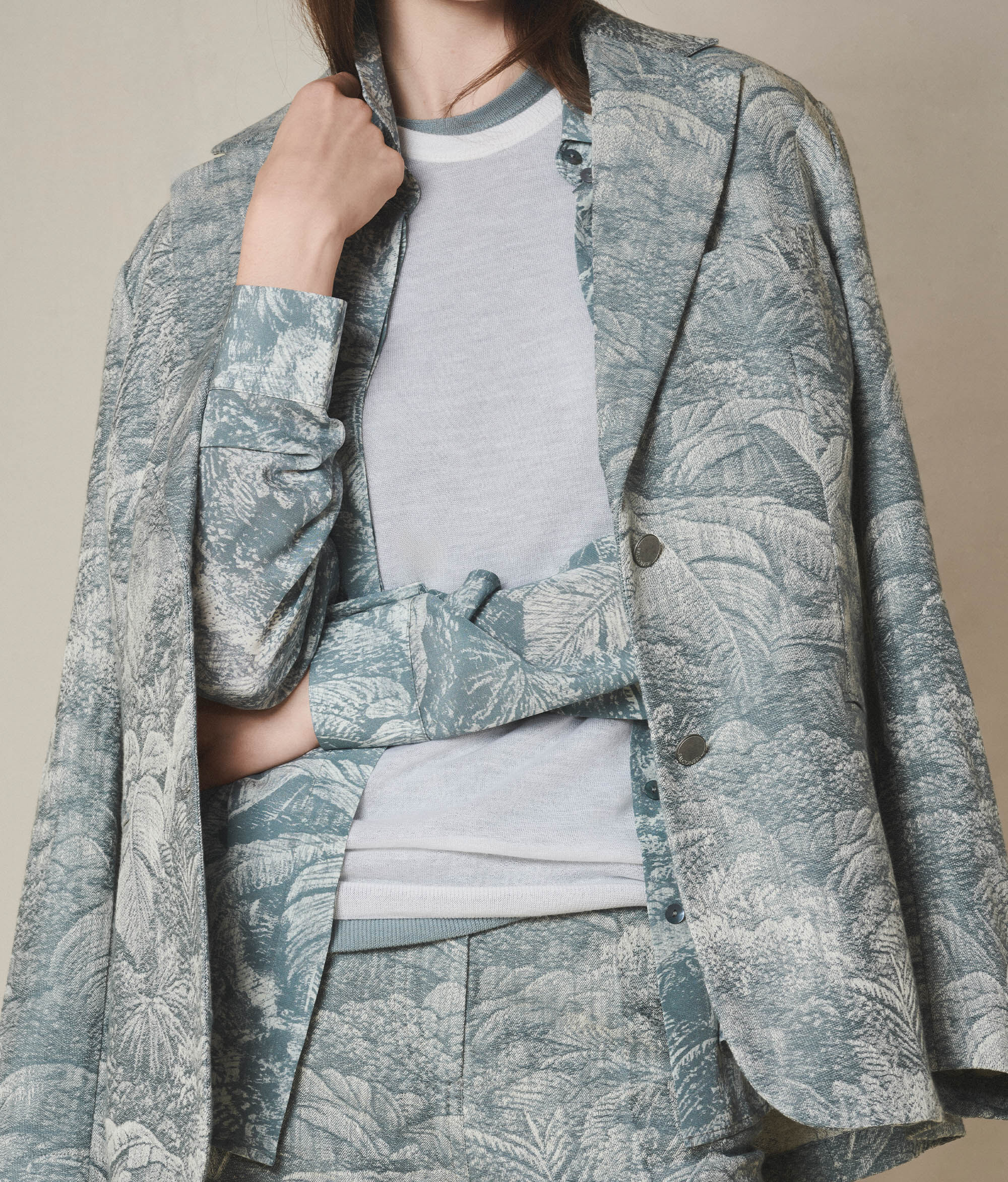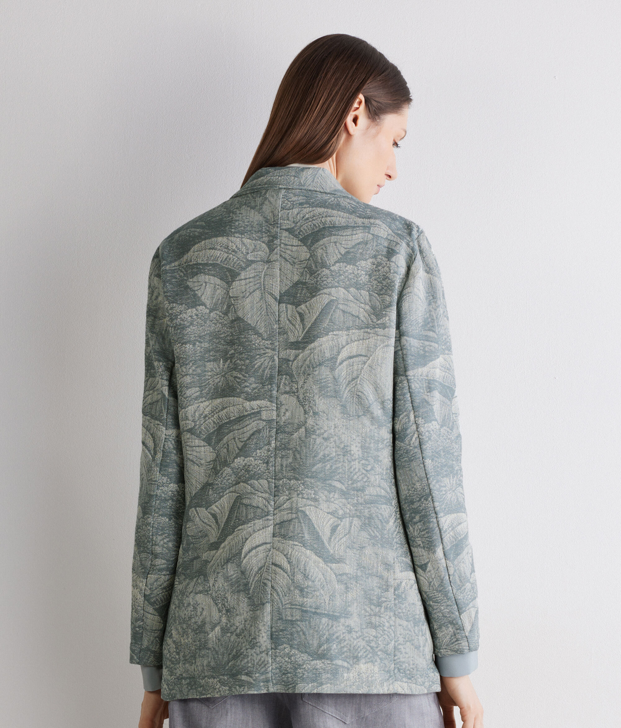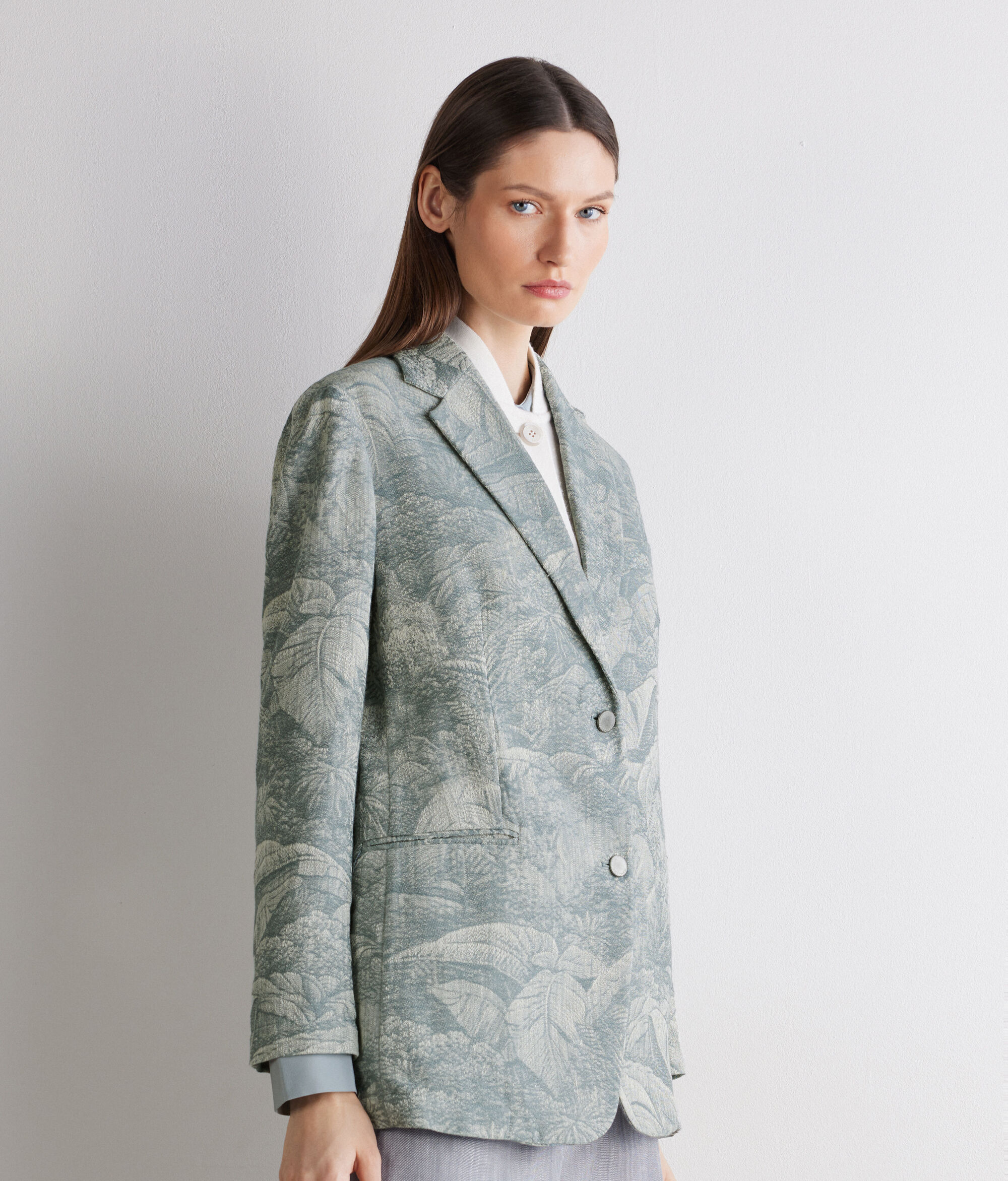 Crafted from jacquard cotton, this jacket stands out for its rich, sophisticated weave, which creates an elegant three-dimensional effect thanks to the workmanship applied directly to the fabric. The classic lapel and single-breasted button fastener define an essential yet distinctive design. Double welt pockets and a breast pocket complete the piece with a relaxed and comfortable fit.