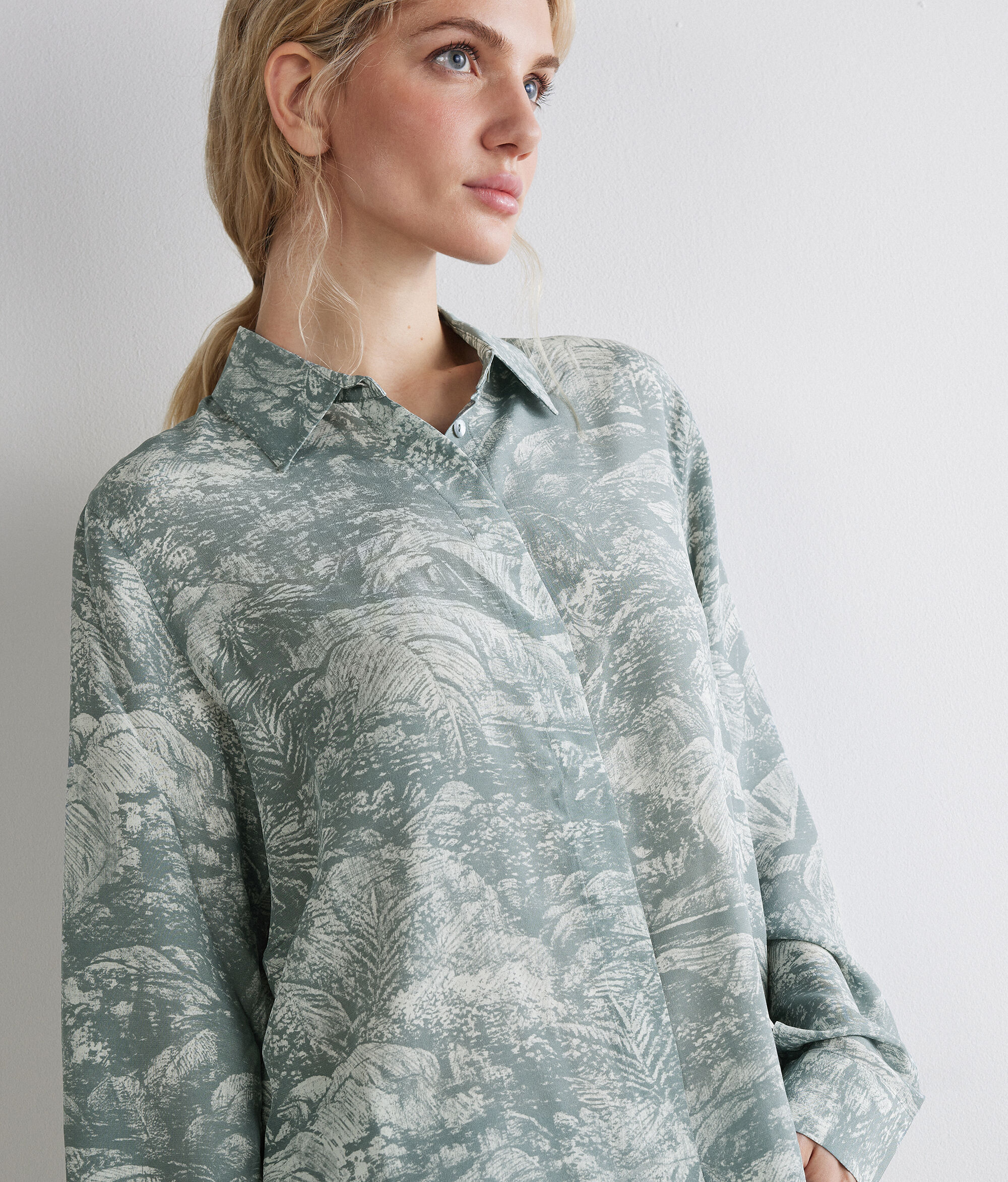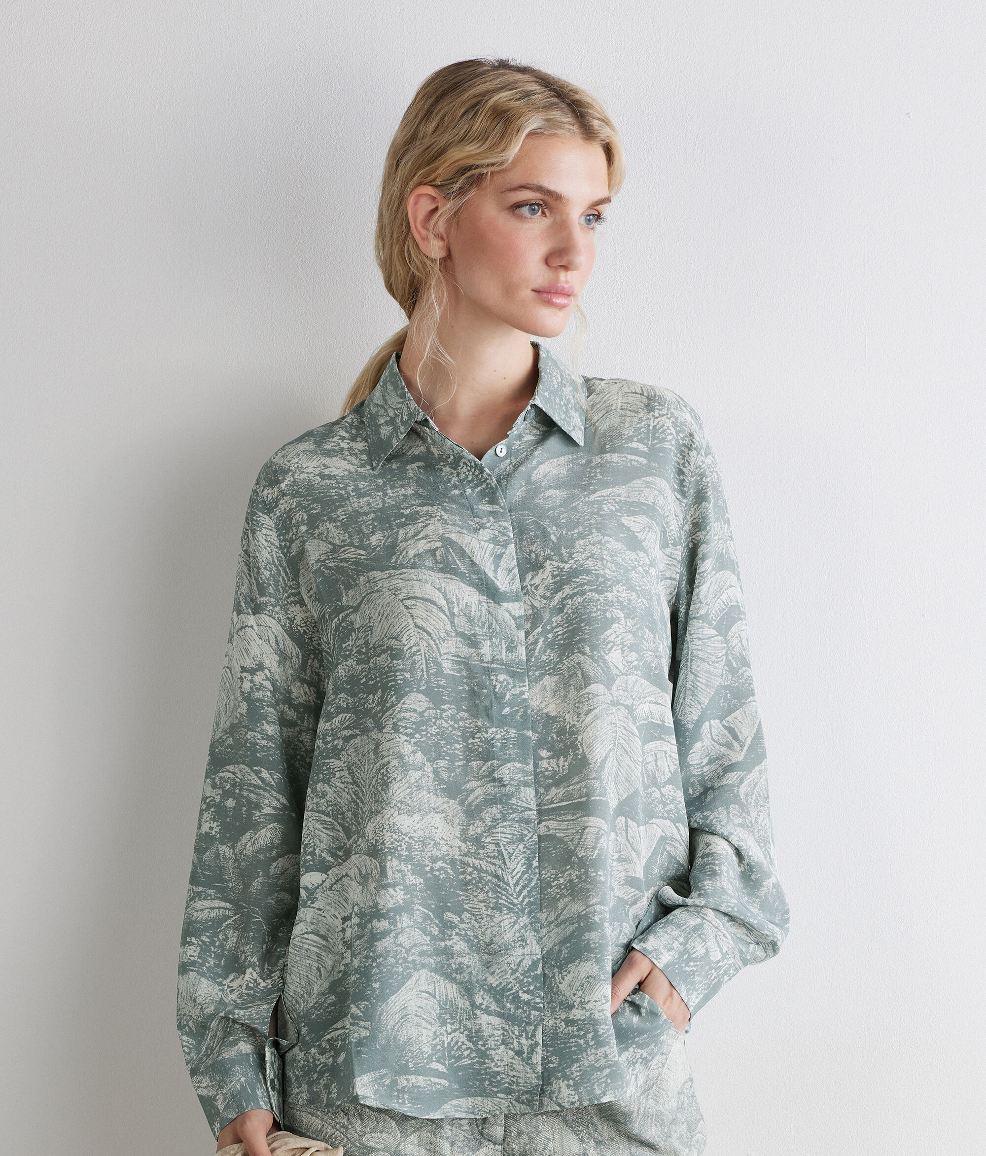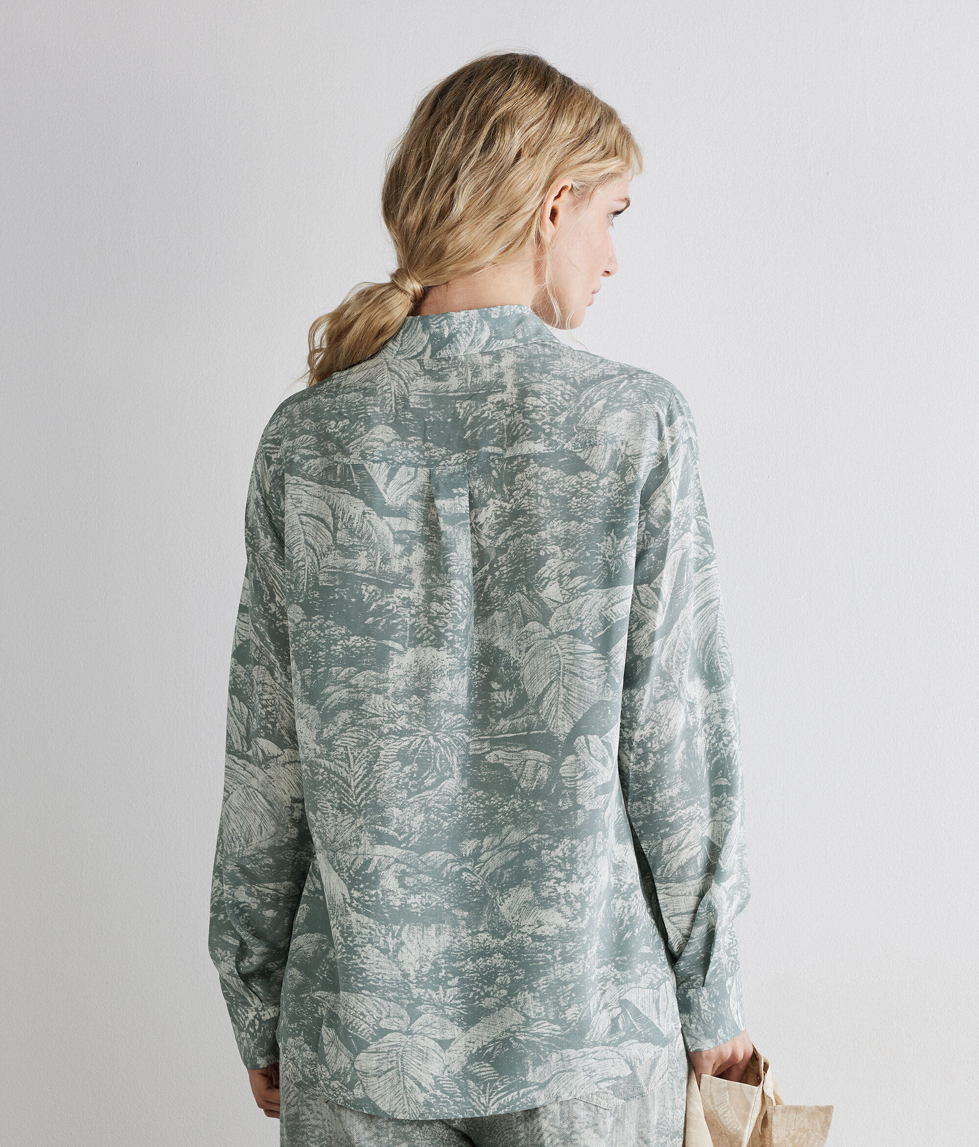 Made of printed silk, this shirt offers a distinct and refined look, perfect for occasions when you want to stand out in style. The fabric offers a natural elegance, enriched by patterns that add personality to the piece. The classic collar completes the traditional design while the concealed button closure contributes to a minimalistic and orderly line. An ideal choice for those who love the elegance of silk combined with carefully thought-out tailored details.