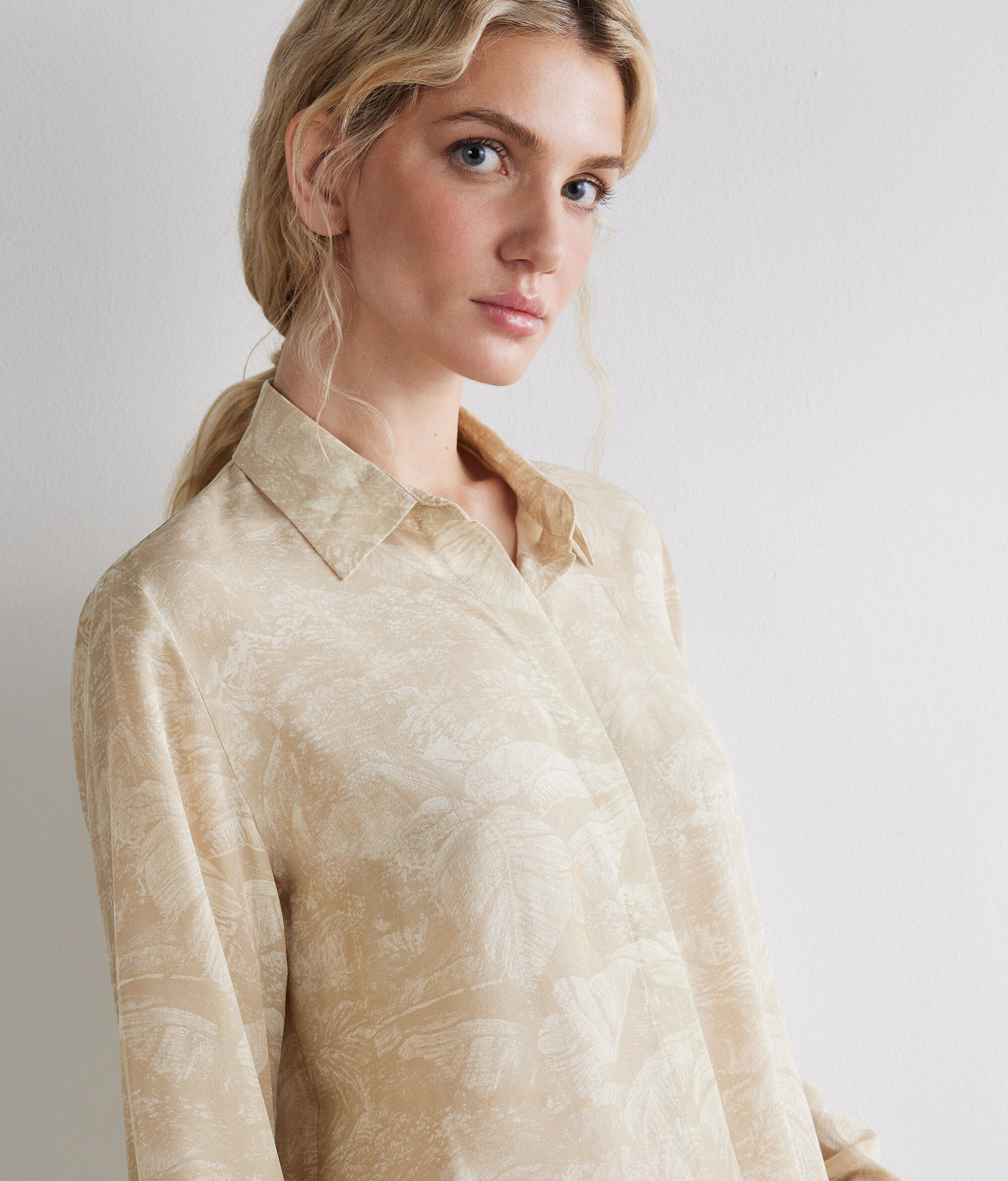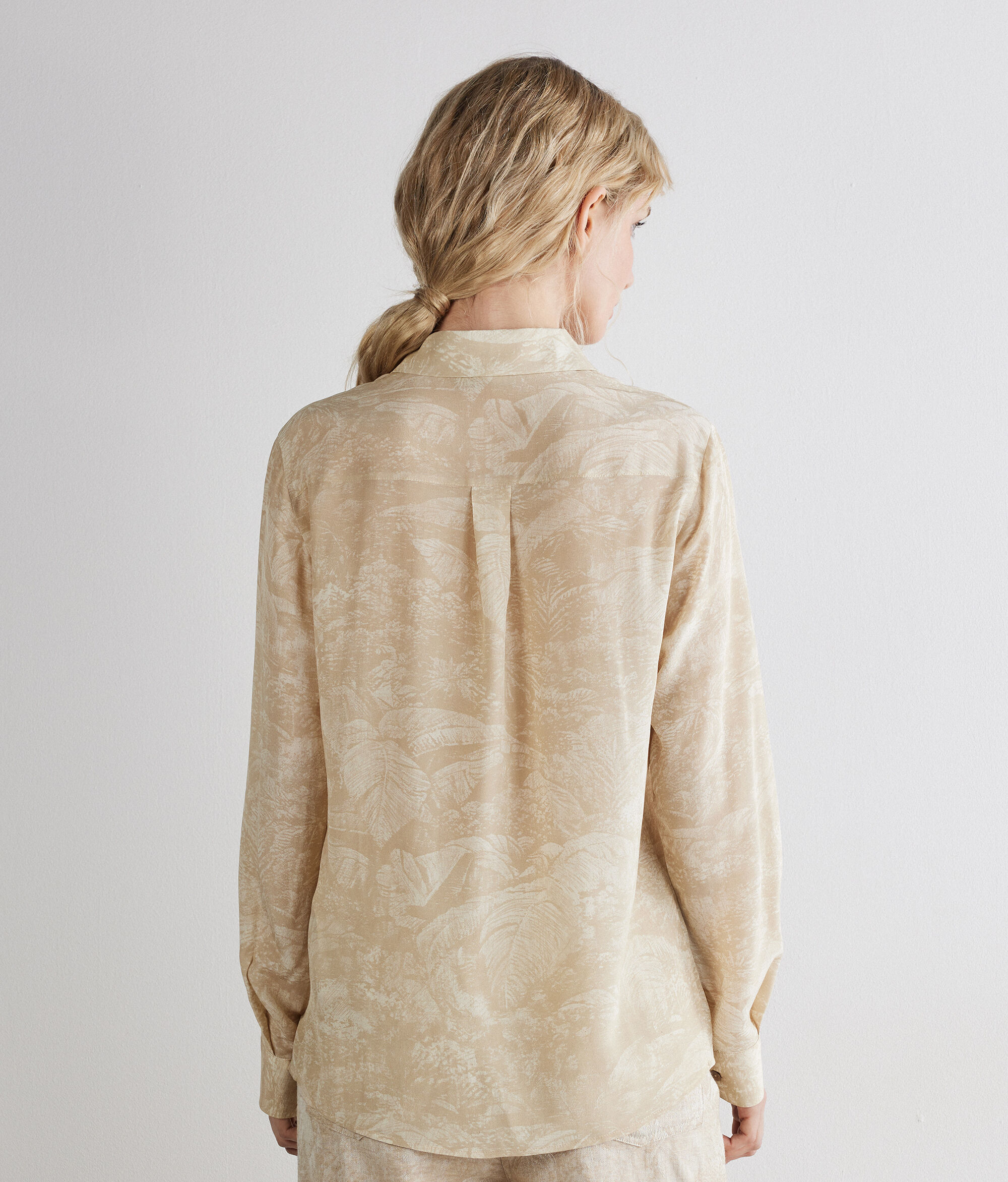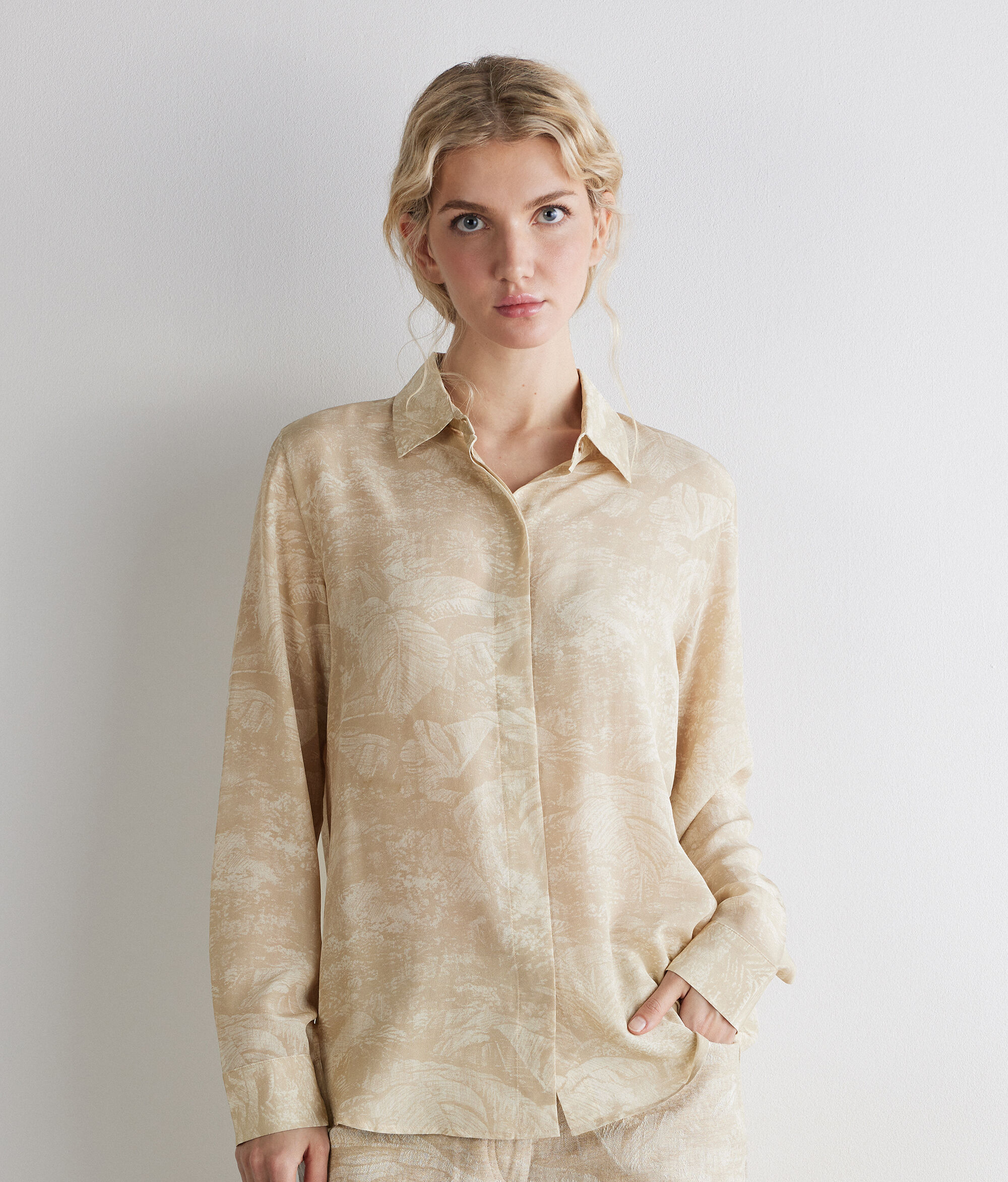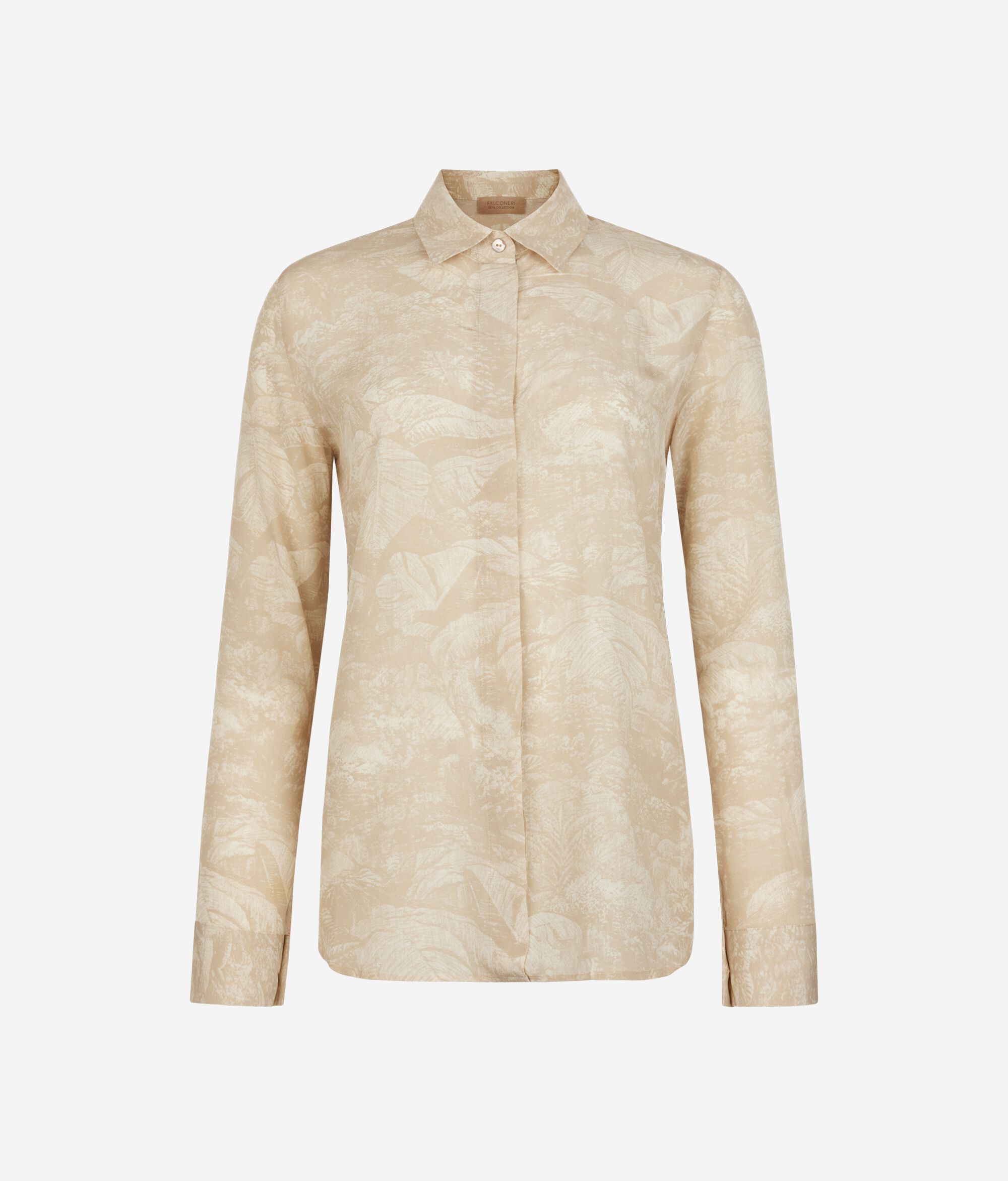 Made of printed silk, this shirt offers a distinct and refined look, perfect for occasions when you want to stand out in style. The fabric offers a natural elegance, enriched by patterns that add personality to the piece. The classic collar completes the traditional design while the concealed button closure contributes to a minimalistic and orderly line. An ideal choice for those who love the elegance of silk combined with carefully thought-out tailored details.