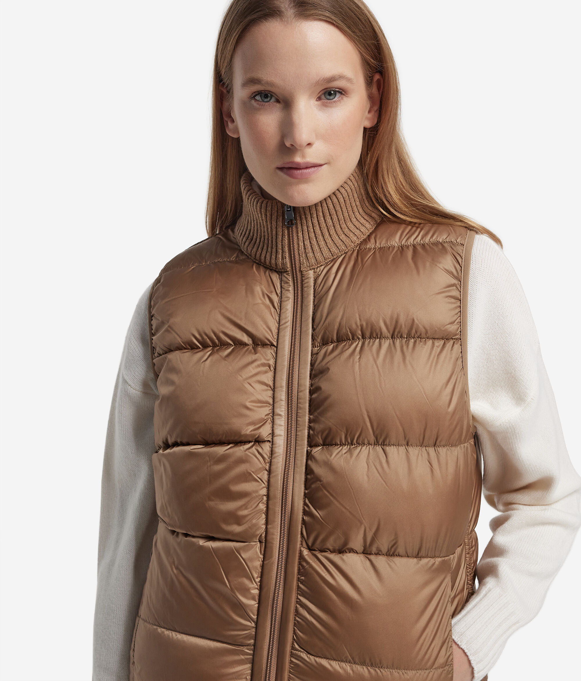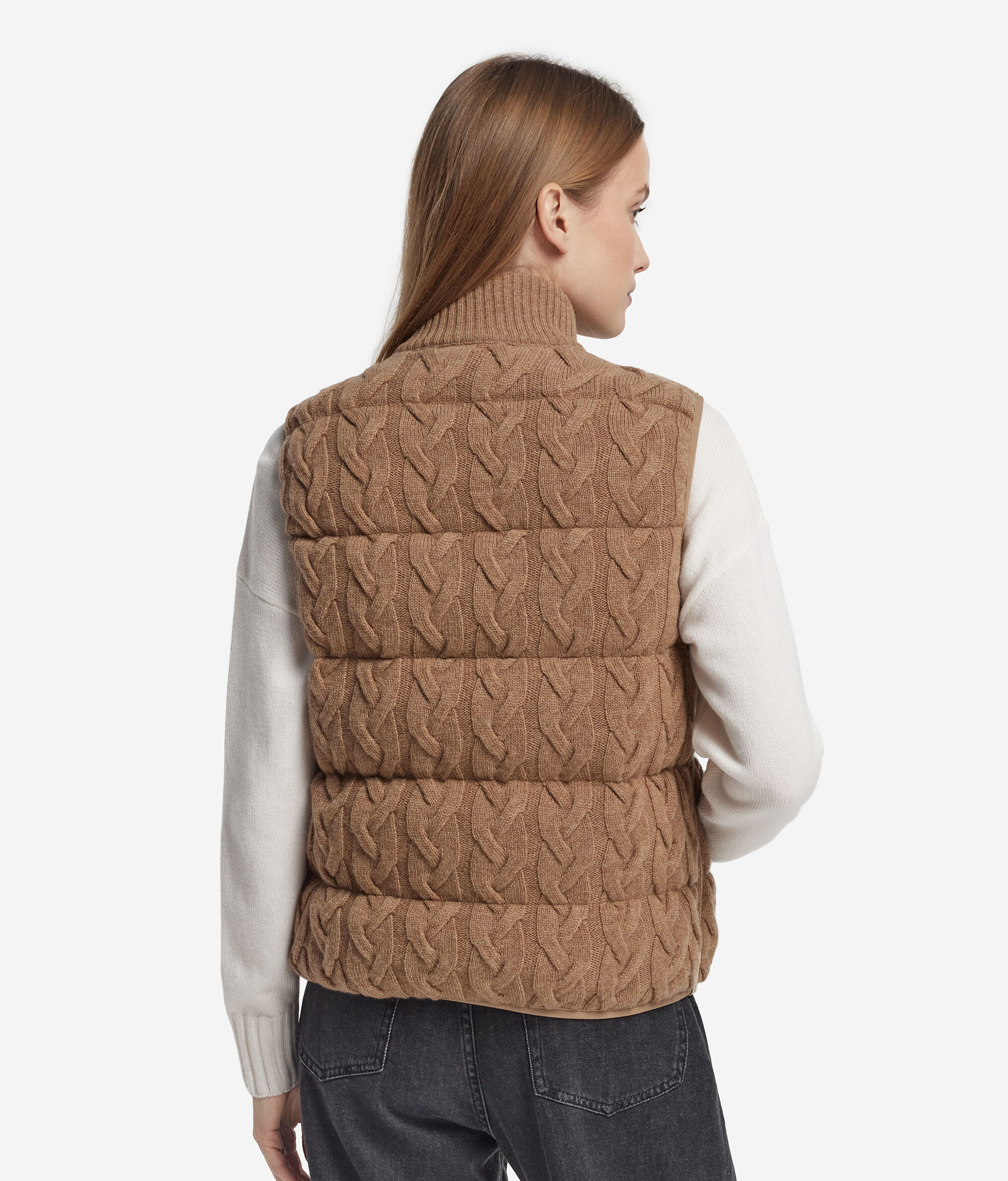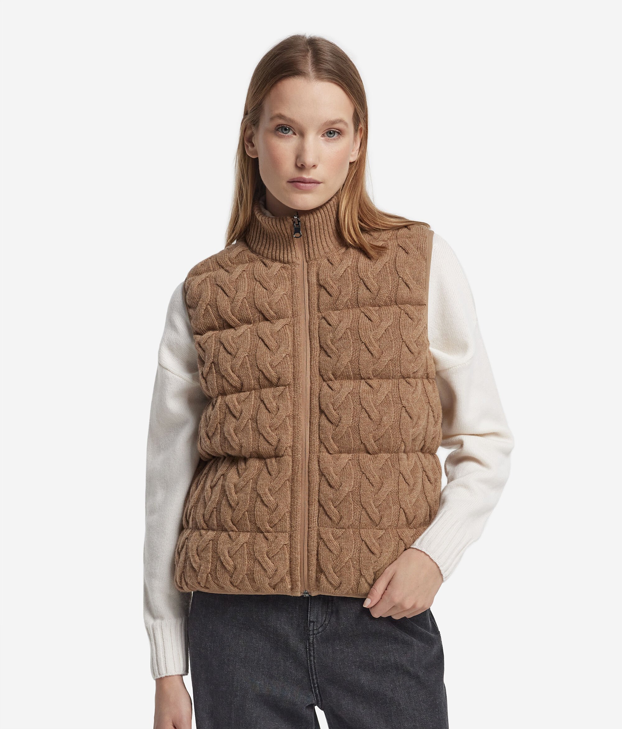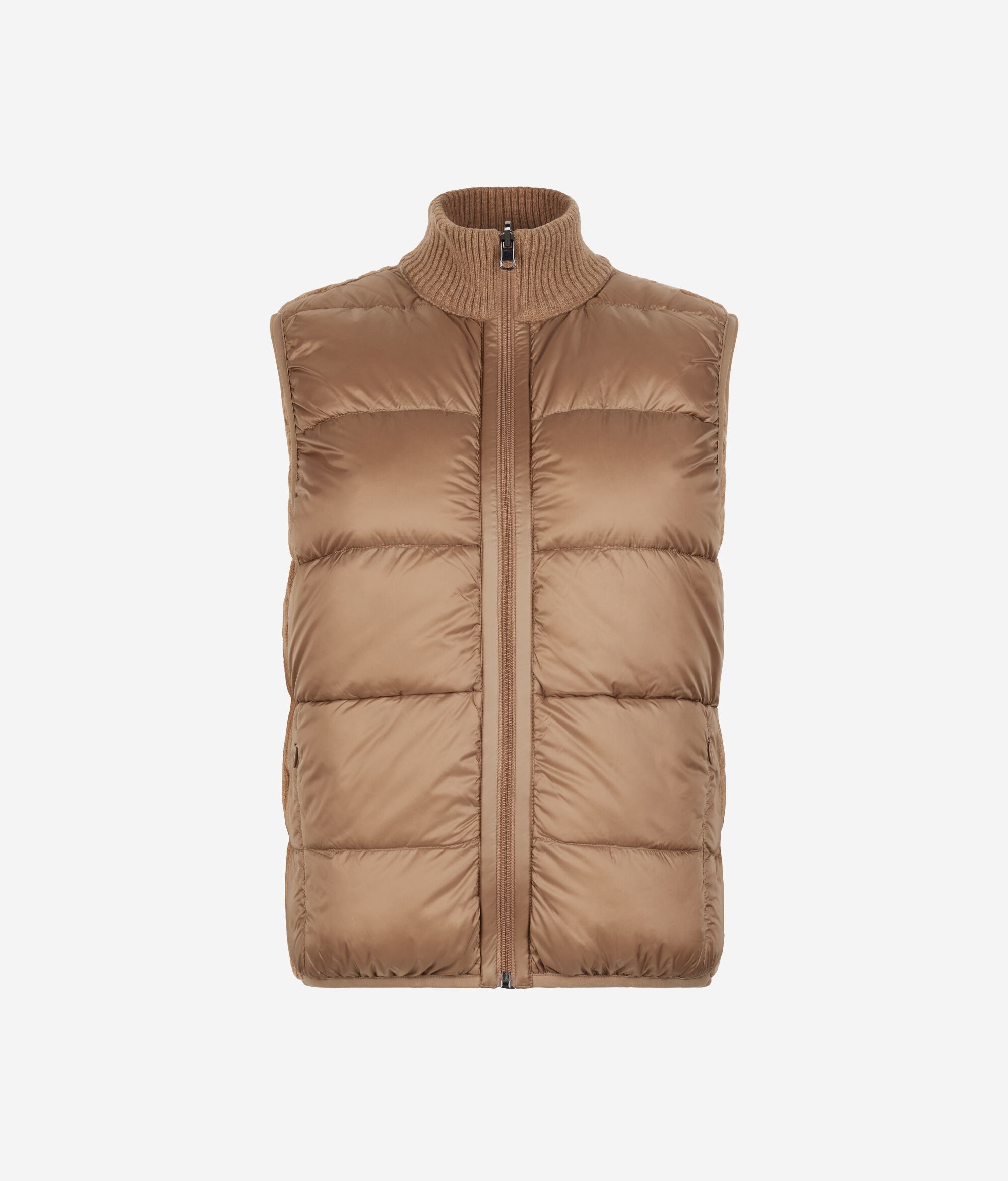 This reversible puffer vest blends soft cashmere details with a technical quilted nylon shell, offering a refined take on functional layering. One side features a classic cable-knit panel for added texture, while the reverse side presents a smooth, matte finish—offering varied styling options in a single piece. A high collar and subtle tonal zips complete the minimalist design, while garment-dyed finishes give the color soft dimension. This quilted puffer vest has a slim, streamlined shape that flatters without feeling restrictive. Lightweight padding provides warmth without bulk, while the sleeveless cut offers full mobility without exposing you to the cold. As a reversible quilted vest, it adapts easily to changes in weather and styling. Whether you prefer the softness of the knit or the sleekness of the nylon, each side brings a distinct mood, extending the wearability of the piece across different settings. Made in Italy, this brown puffer vest is designed to bring warmth, versatility, and sophistication into one carefully constructed essential.