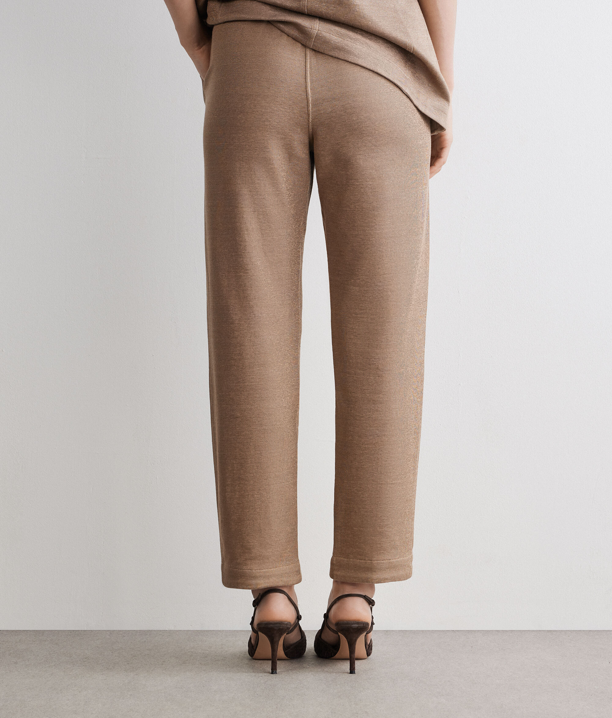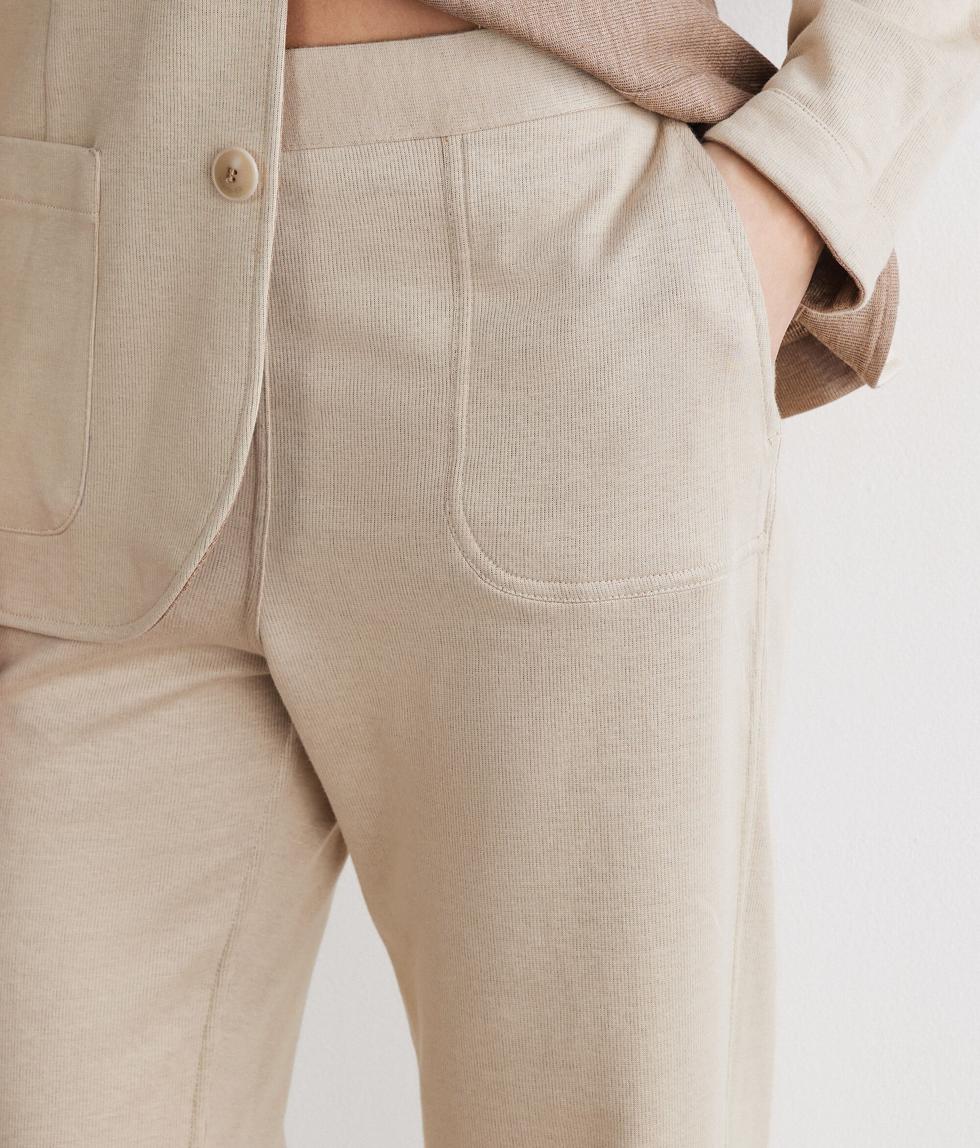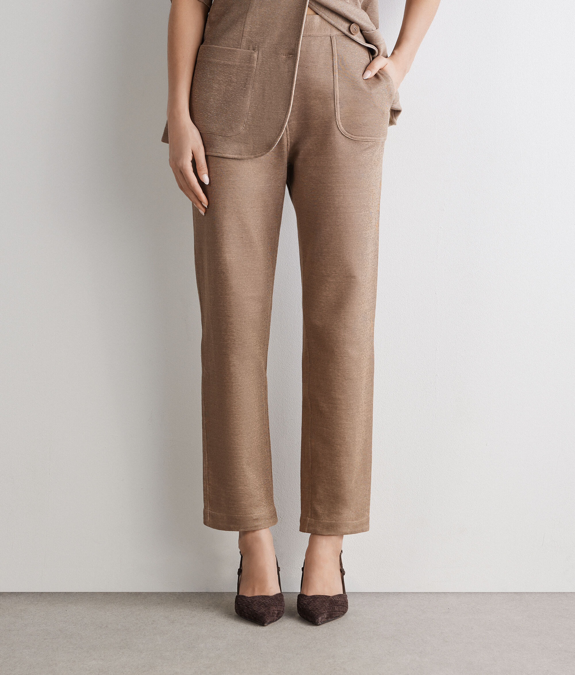 Two-tone, reversible pants, designed for versatile and contemporary elegance. The linen exterior and cotton interior offer two distinct looks, while the cigarette cut and elastic waistband at the back help enhance the silhouette. The French patch pockets complete the design with character, transforming the piece into a modern and sophisticated essential.