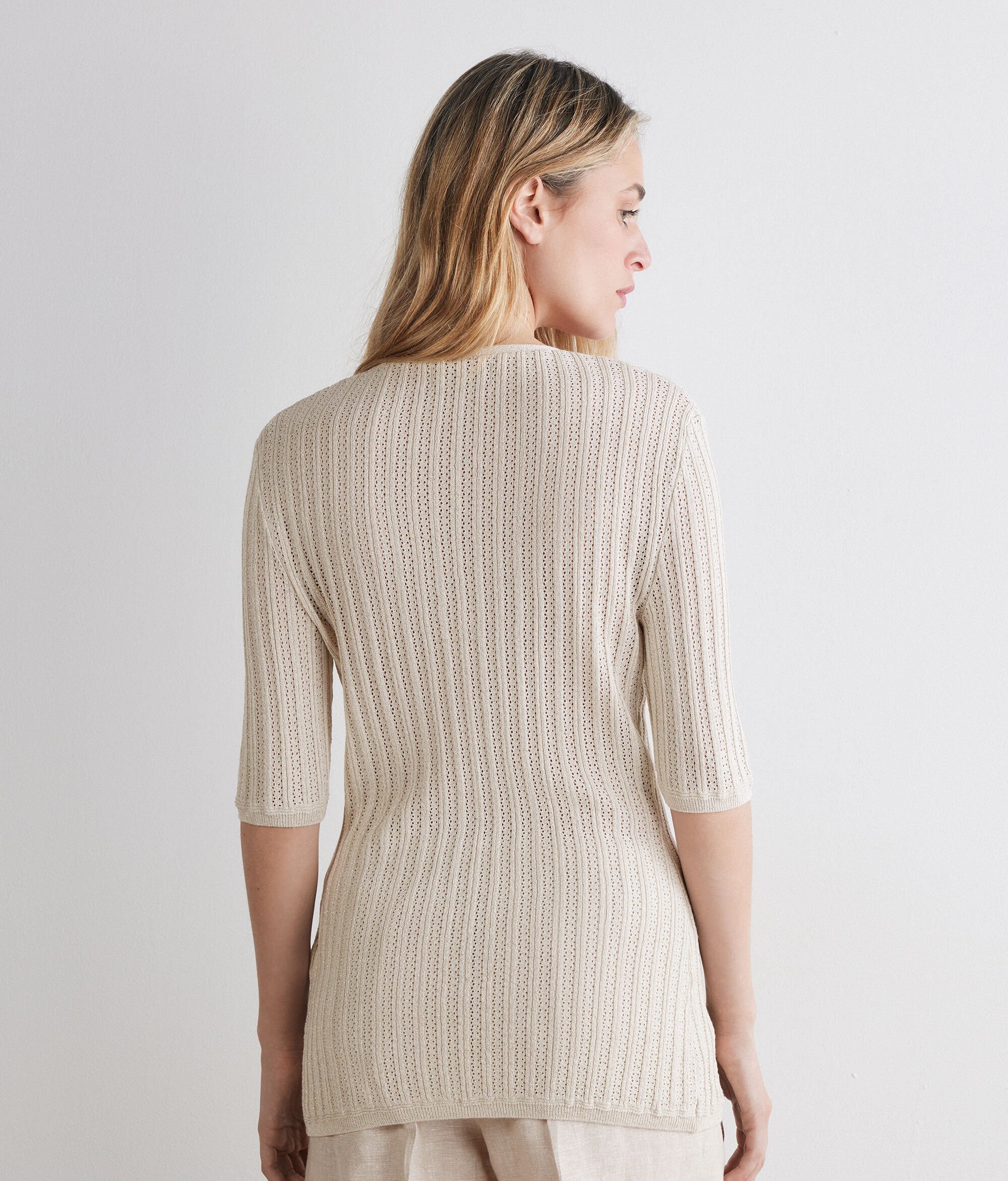 Ribbed viscose knit cardigan, enriched with an elegant lamé yarn. The model has a regular fit.