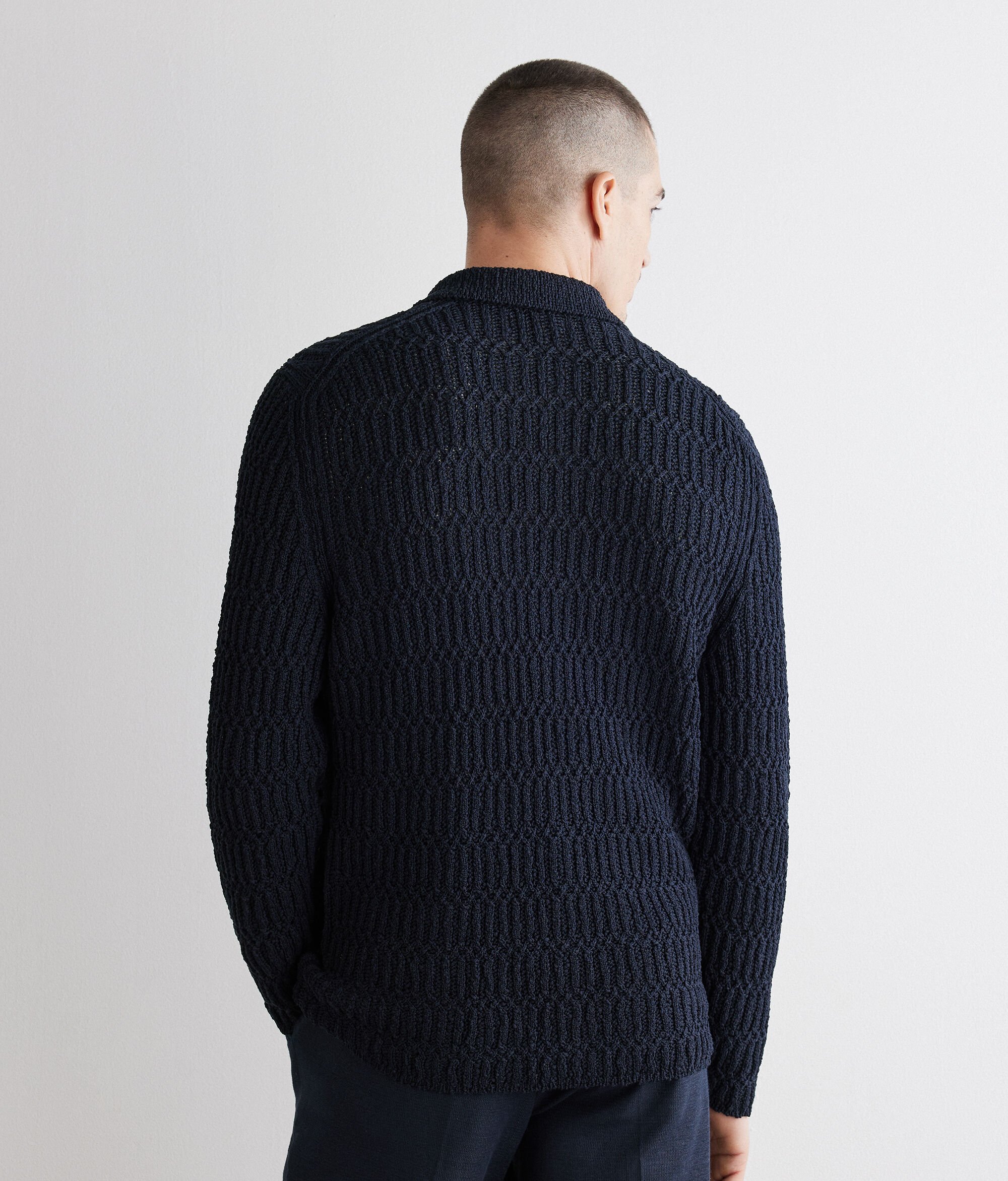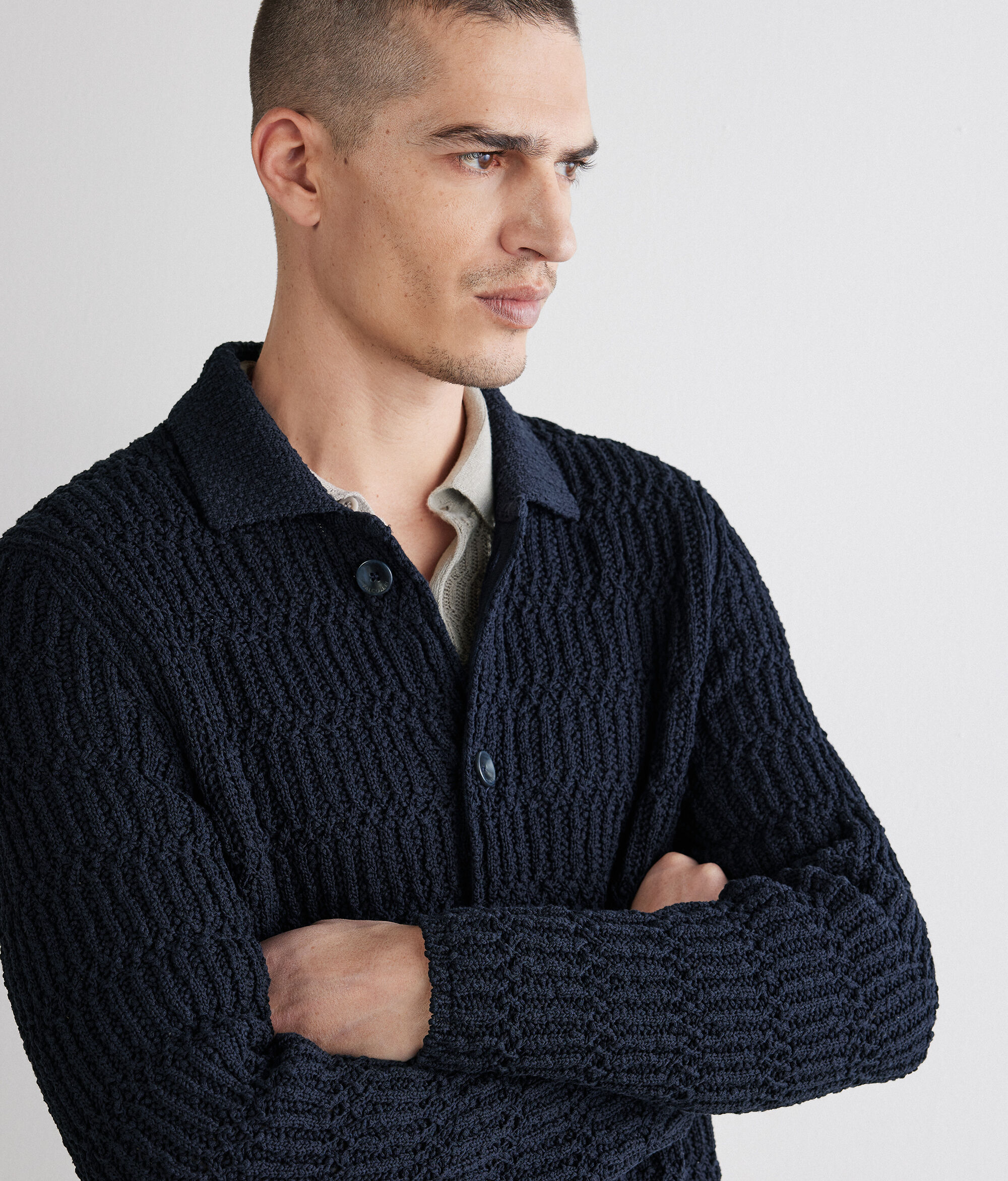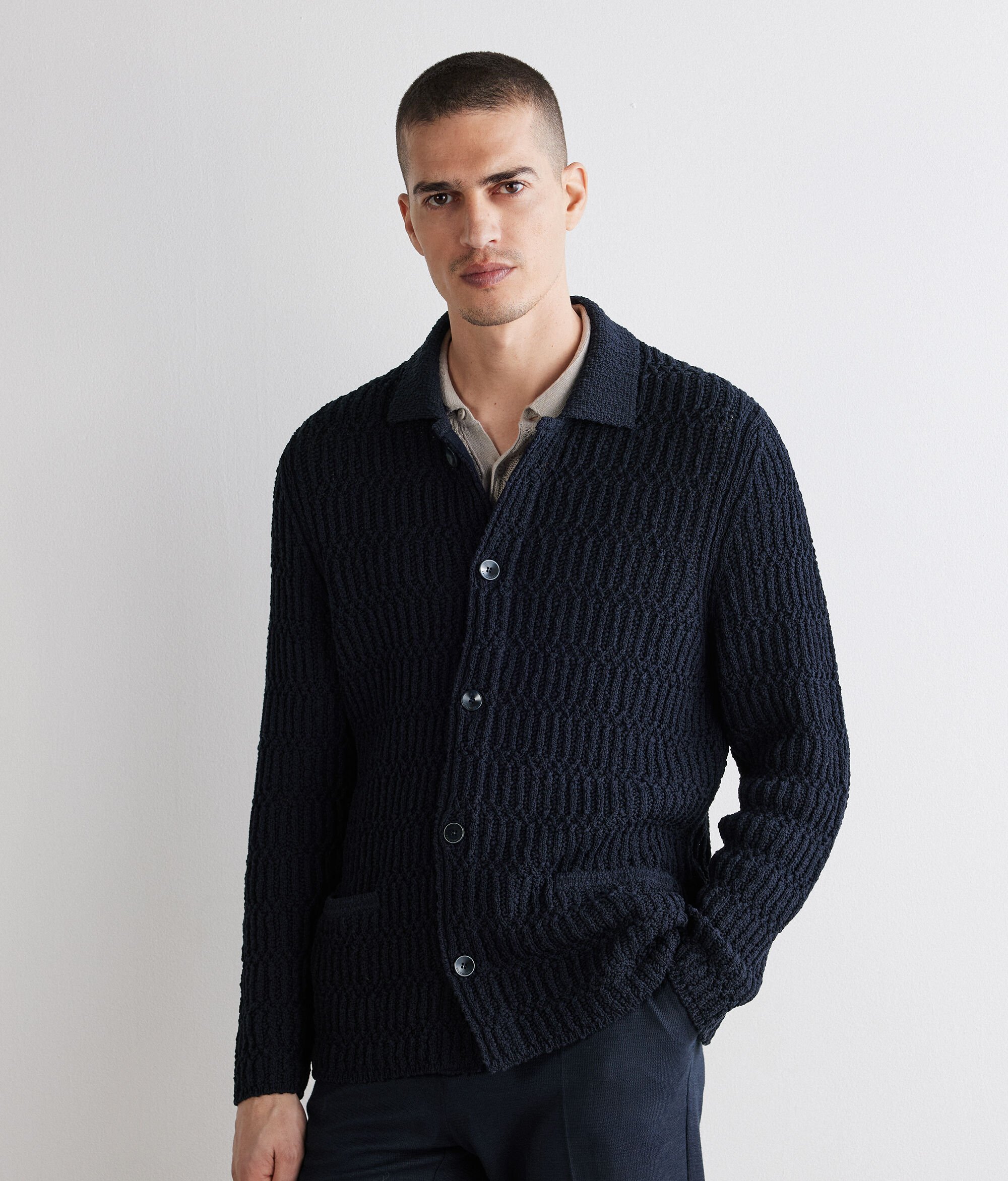 Cotton shirt jacket with refined textured stitch workmanship that enhances the texture with a subtle play of light. The shirt collar and central five button fastener define a calibrated and essential line, while the welt pockets on the front add a refined and elegant detail.