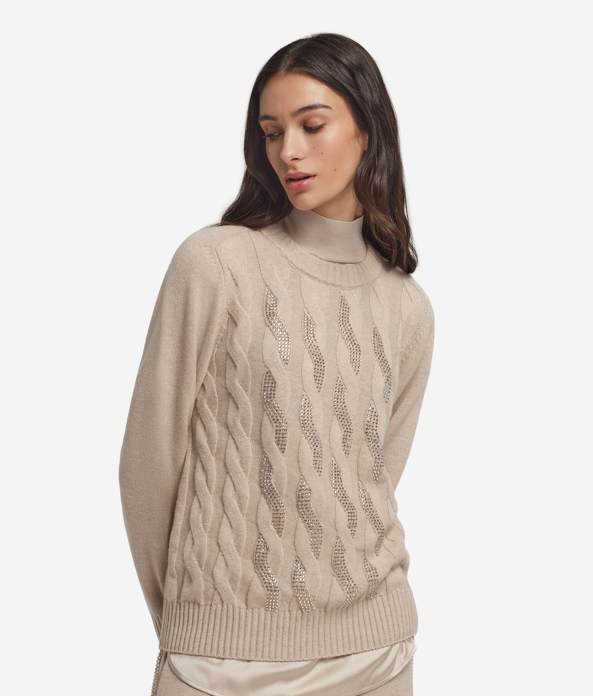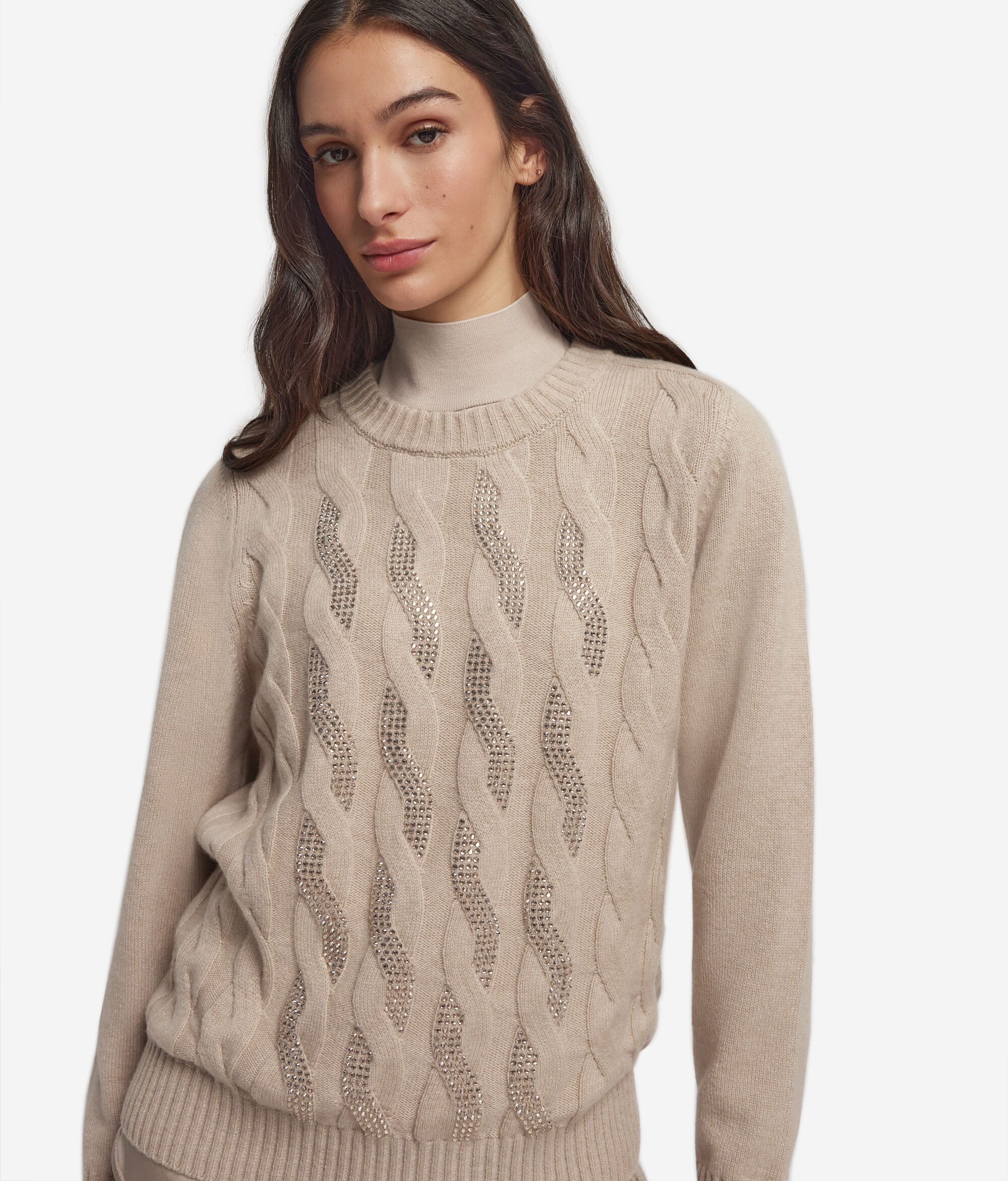 Made of Ultrasoft Cashmere, this crewneck combines comfort, style, and refined details. The cable knit on the front, embellished with delicate rhinestones, transforms this sweater into a truly precious item. The ribbed collar, armholes and hem naturally outline the silhouette, while the hip length makes it versatile, perfect to wear with jeans, tailored trousers or under a blazer.