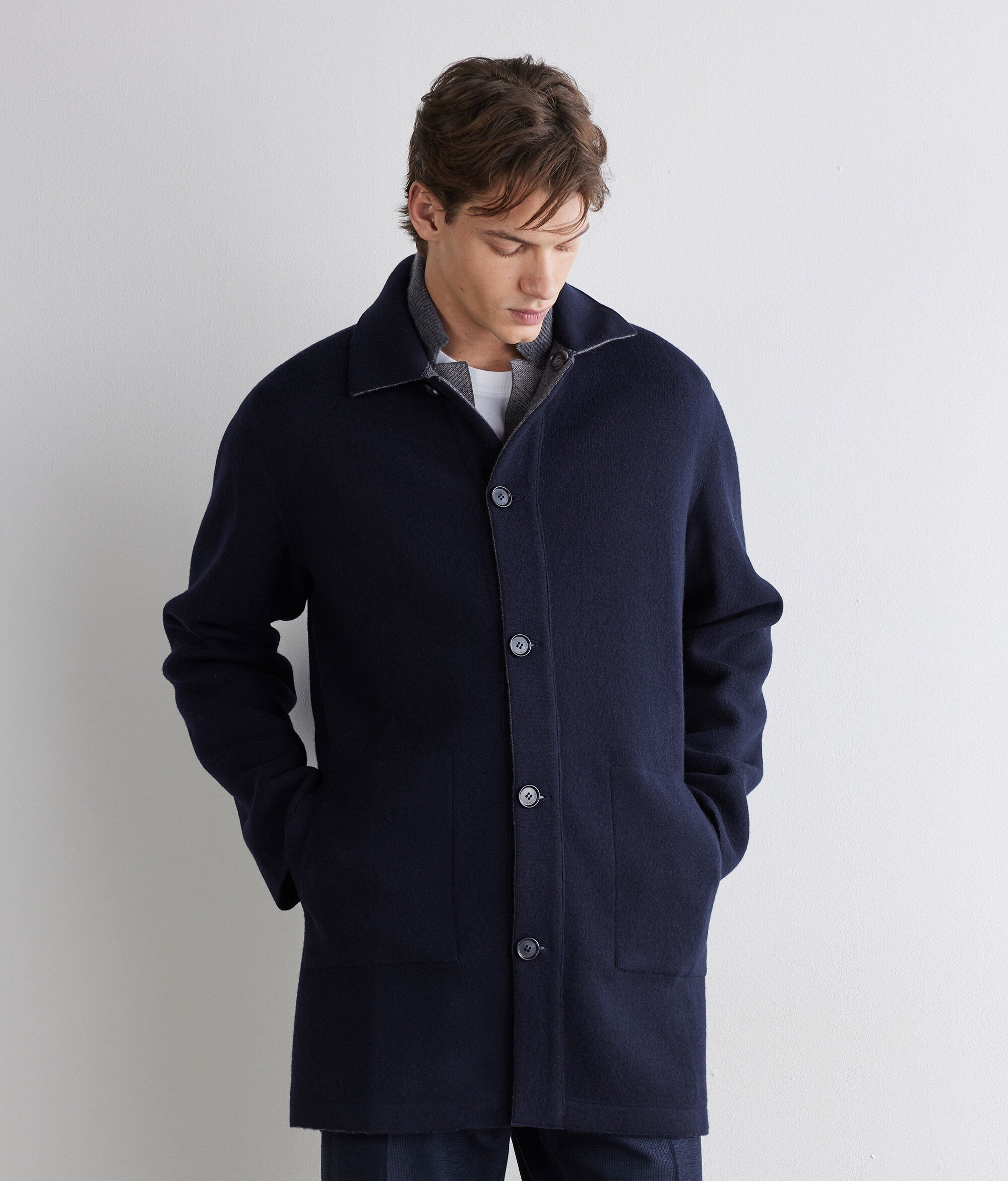 A coat that combines refinement and versatility. Made from Ultrasoft Cashmere, it offers enveloping softness and comfort. The two-tone tubular knit enhances the double-sided design, for two stylistic interpretations in a single piece. The shirt collar and button fastener define a clean, contemporary line, while the internal and external pockets and regular fit make it ideal for any occasion.