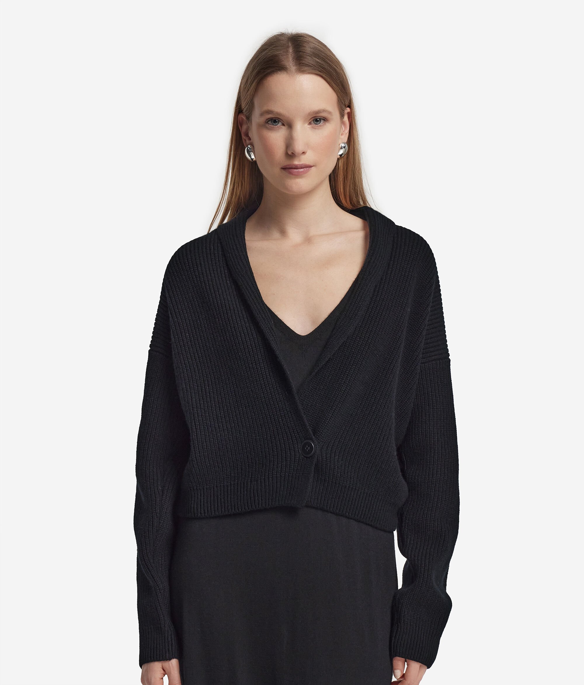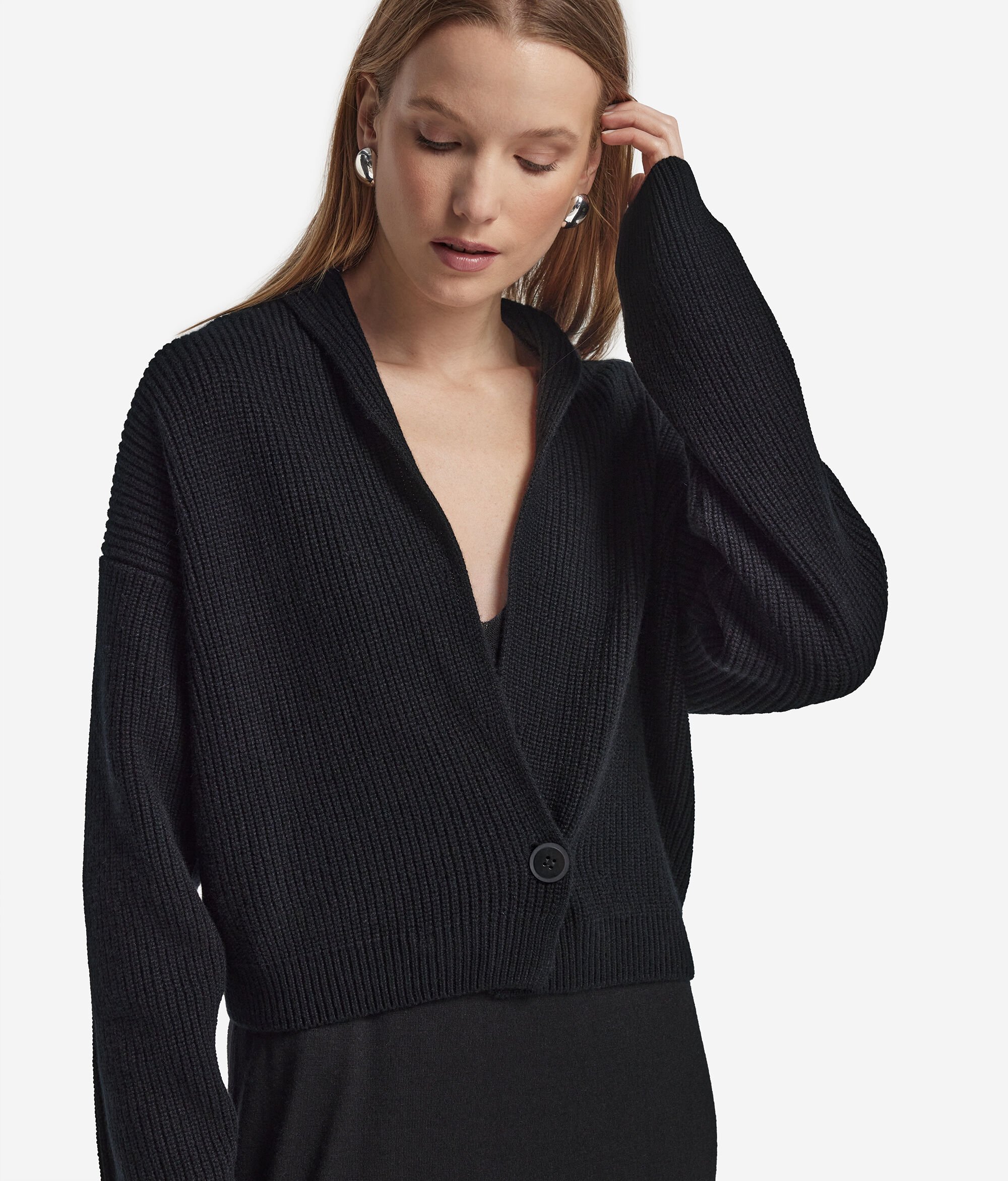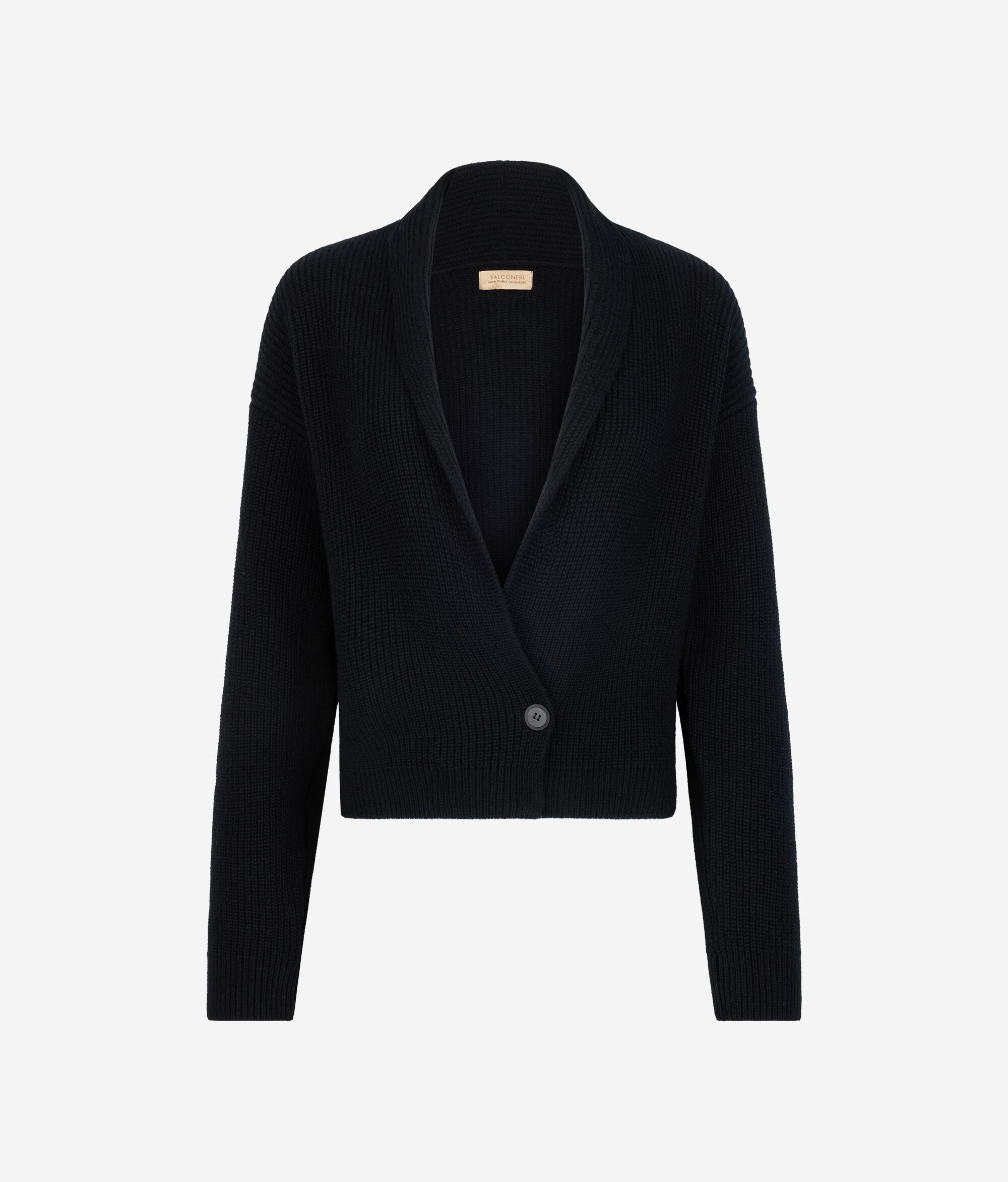 Fine Ultrasoft Cashmere yarn enhances the elegant design of this cardigan. The piece boasts a shawl cut, enhanced by a central button closure and a lapel to form a pronounced V-neck. Understated yet distinctly refined, it cannot be missed in the closet of those who love quality and refined style.