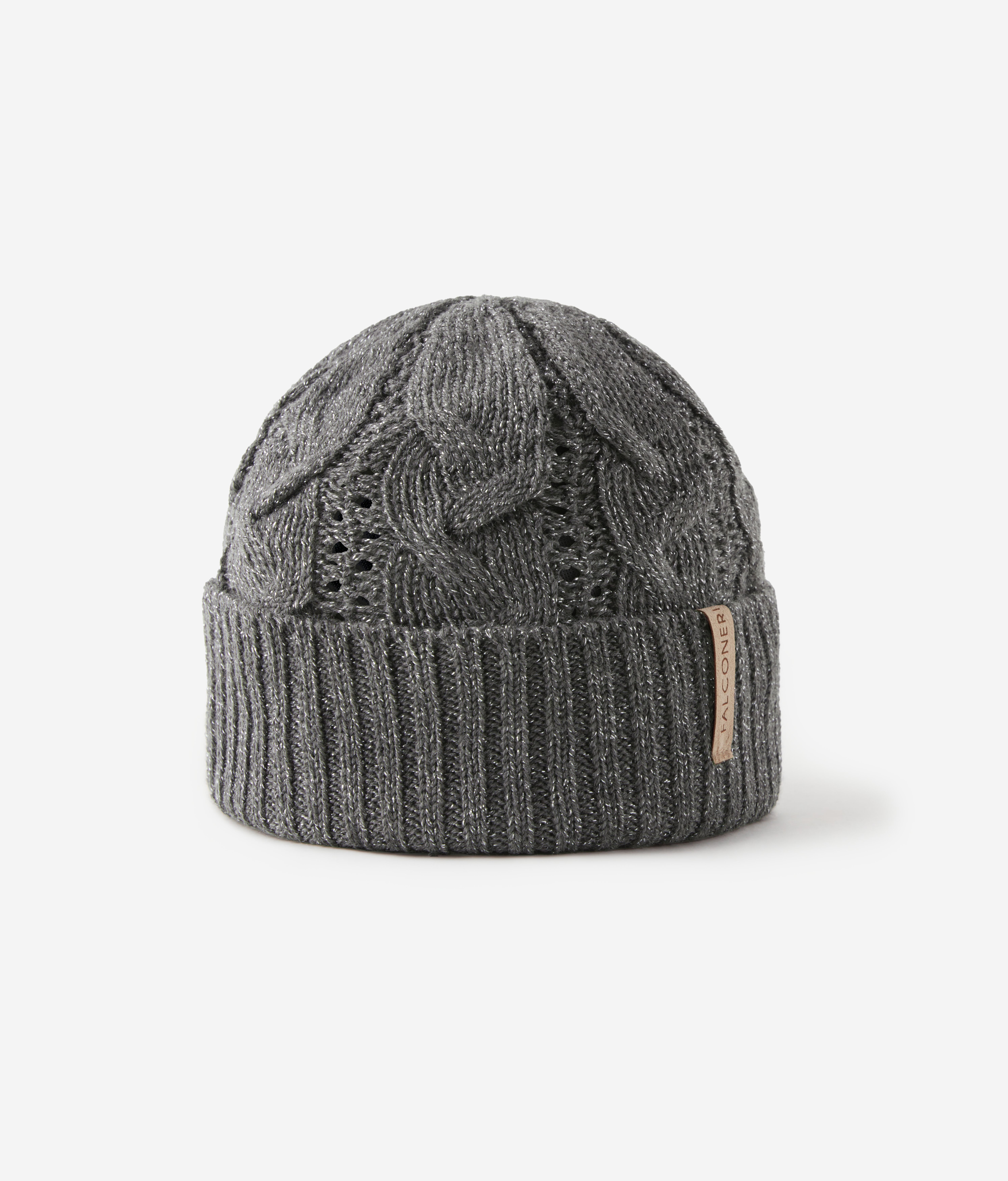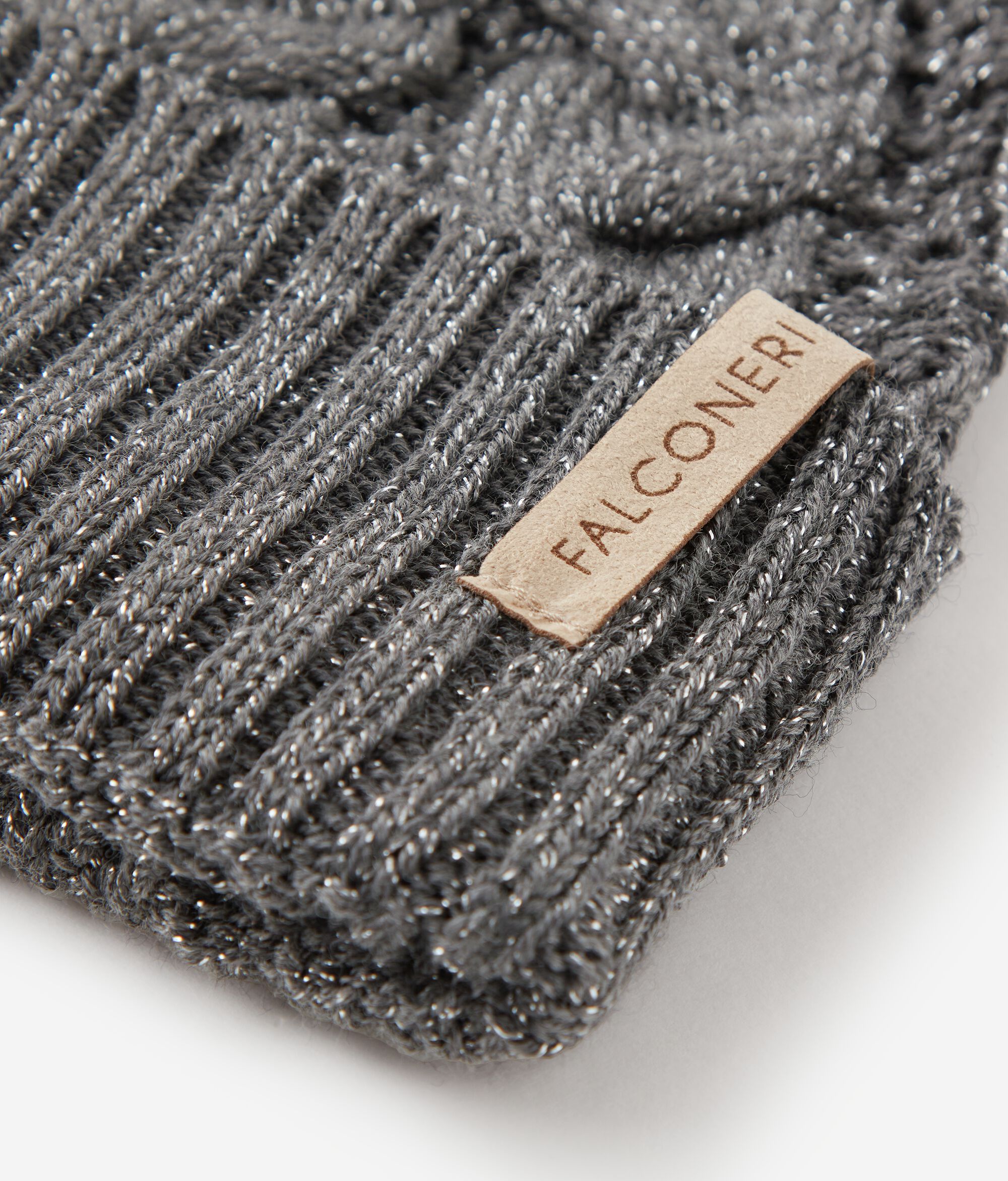 Crafted from lamé wool, this cap catches the light with a delicate shimmer. The vertical cable-knit workmanship and ribbed finish add texture and definition, creating a sophisticated and contemporary play of volumes.
