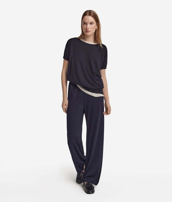 Achieve sophisticated vacation attire by pairing your oversized T-shirt with linen pants and chic sandals, accessorizing with delicate jewelry. For elegant workwear, layer a structured blazer over your linen T-shirt and sleek trousers. Seeking to elevate your weekend ensembles? Pair your top in a vibrant shade with a cashmere cardigan and palazzo pants for a relaxed, casual look. Explore our complete collection of women’s tops and T-shirts to upgrade your timeless closet today.